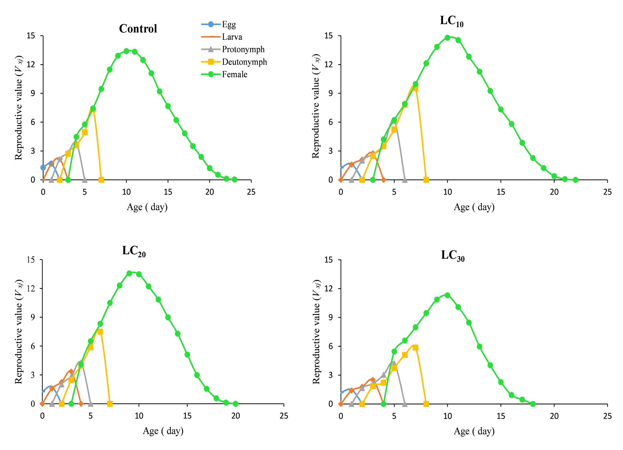 The daily and age-stage survival curves of N. longispinosus in the control and chlorfenapyr treatments are shown in Figure 1. The total lifespan of untreated individuals was 28 days, followed by 26 days for the LC10 treatment, 24 days for the LC20 treatment, and 23 days for the LC30 treatment. The maximum age-specific maternity (mₓ) values for mites treated with chlorfenapyr were approximately 3.24, 2.78, and 2.38 eggs/female/day, occurring on the 11th, 12th, and 13th days of their lifespan, respectively (Figure 2). In comparison, the control group presented a peak value of 3.17 eggs/female/day on the 13th day. The age-stage survival rate (sₓⱼ), which represents the probability that a newborn will survive to age x and stage j, is also illustrated in Figure 1. Considerable overlap was observed between the survival curves of different developmental stages (A–D). The highest female survival rate was recorded under the LC20 treatment, where 67% of eggs reached adulthood. The highest male survival rate was observed under the LC30 treatment, with 27% of eggs developing into adult males. Overall, individuals in the chlorfenapyr treatment group presented a shorter life expectancy than did those in the control group, as depicted in Figure 3. The reproductive value (vxj ) value defines the contribution of an individual at age x and stage j to the future population. The peak reproductive value of females in the first generation was observed in the control at the 13th day, followed by the 10th day in the LC10 and LC30 treatments and the 9th day in the LC20 treatment (Figure 4).