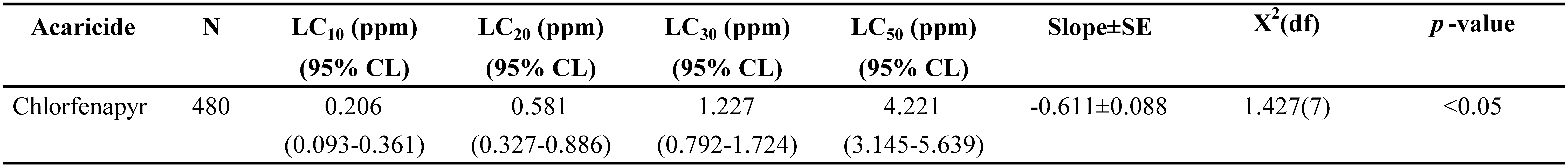 To estimate the acute toxicity of chlorfenapyr to T. urticae adult females, a concentration–response bioassay was performed using the leaf dip method (Helle and Overmeer 1985). Leaf discs 3 cm in diameters were cut from Morus alba (Mulberry) plant leaves and dipped for 20 seconds in a series of chlorfenapyr concentrations (13.33, 6.66, 3.29, 1.59, 0.79, and 0.39 mg/l) and control was treated with distilled water. After 2 h of drying at room temperature, the sixty same aged female adults (24 h old) were transferred to each leaf disc. The edges of the leaf disc were surrounded by moist tissue paper to prevent mites from escaping. Mortality was recorded 72 hours post-treatment by gently probing mites with a fine brush, if individuals did not respond were considered dead. Each concentration was tested with four replications. All Petri dishes were kept inside an incubator at 25 ± 2 °C and 65 ± 5% RH with a photoperiod of 16:8 (L:D) hours.