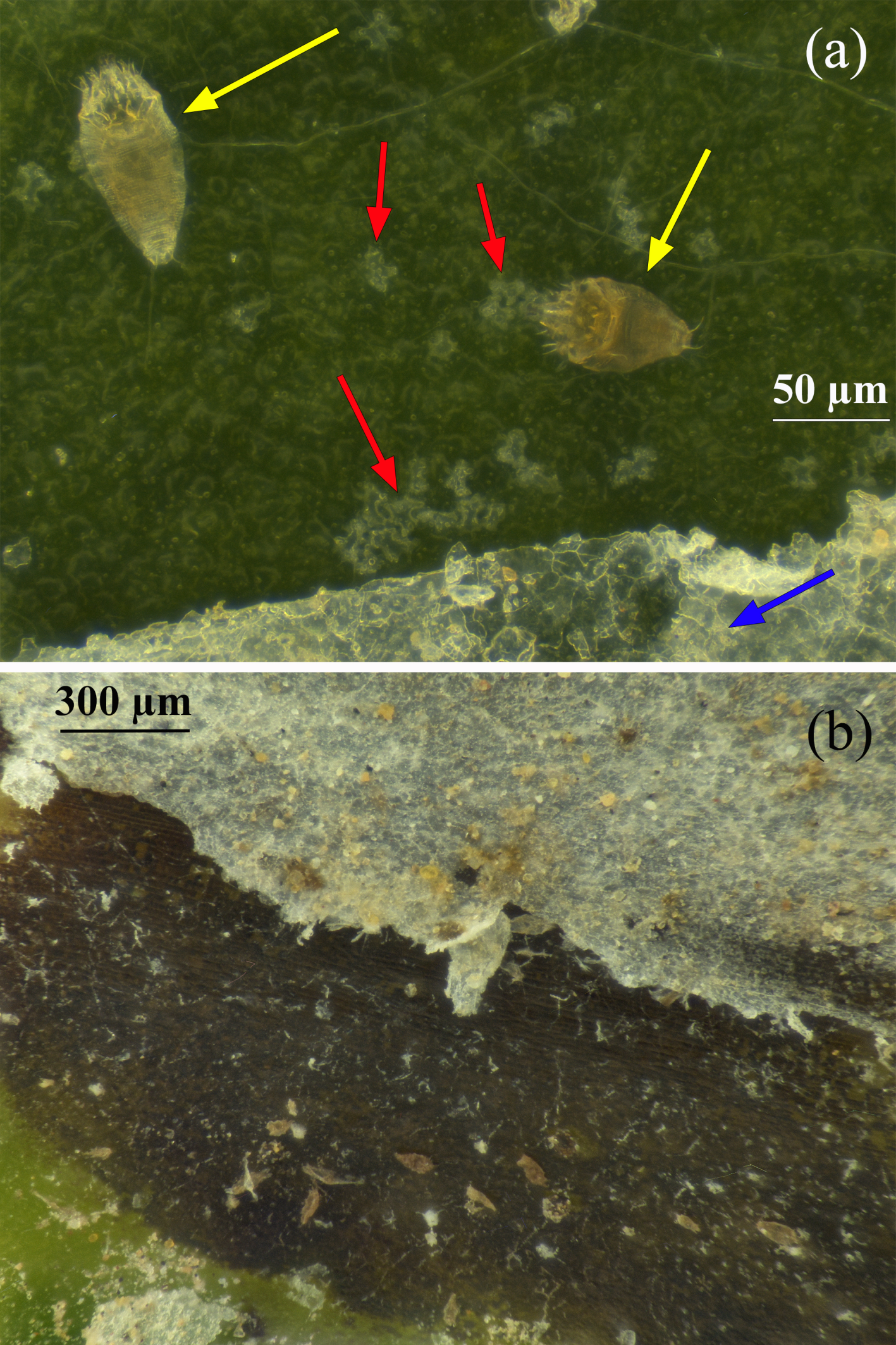 Initially, the mites settle on the buds, then petioles, followed by leaf blades, first along the midrib and then towards the margins (Sternlicht and Goldenberg 1976). Feeding activity promotes the formation of a dense protective white-silver layer similar to a spider web that houses all developmental stages of the mite (Ramani 2019) (Figure 1a, b). There are three main hypotheses on the origin of the leaf-coating: Sternlicht and Goldenberg (1976) reported that the feeding activity of the mite, initially induces secretion of ''... a milky substance, which hardens into a white, crusty, membranous film covering different places infested by the mites, and giving the upper surface of the leaf, at sites of mite infestation, a silvery grey blotch'', and afterwards injured tissues become brown necrotic areas (Figure 2a, b). Two years later, Hassan and Keifer (1978), not considering the previous hypothesis by Sternlicht and Goldenberg, reported that the leaf-coating consists in crude and irregular strands with various forms and bunches which is different from the webbing caused by Aceria knorri Keifer on Lepisanthes rubiginosa (Roxb.) Leenh (Sapindaceae). The authors assumed that the white leaf-coating on mango infested leaves is ''... some sort of regurgitation''. All following papers on this mite avoided to refer on the nature of the coating, while a recent review on webbing of Aberoptus species considers C. kenyae a web producer mite because of modifications of the gnathosoma and legs considered consistent with spinning ability of the species (Chetverikov et al. 2023).