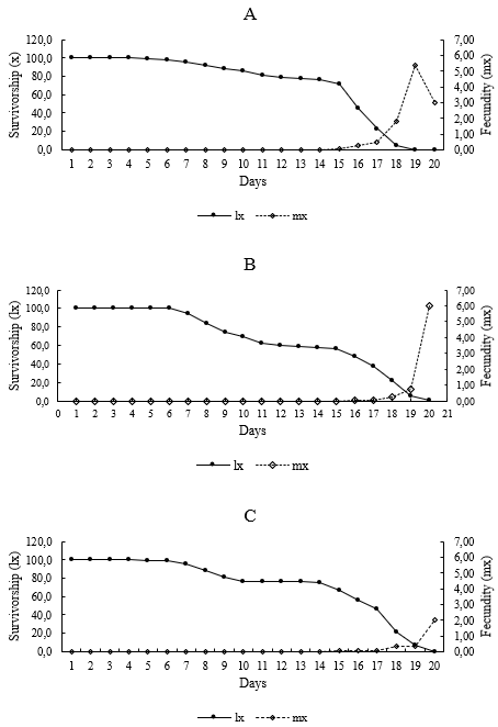 As shown in Figure 2, the survival rate (lx) of O. yothersi peaked during the first six days on all host plants, then gradually declined to zero between days 19 and 20. The daily production of female offspring per female (mx) increased from day 16 on peach, and from day 18 on apple and rose.