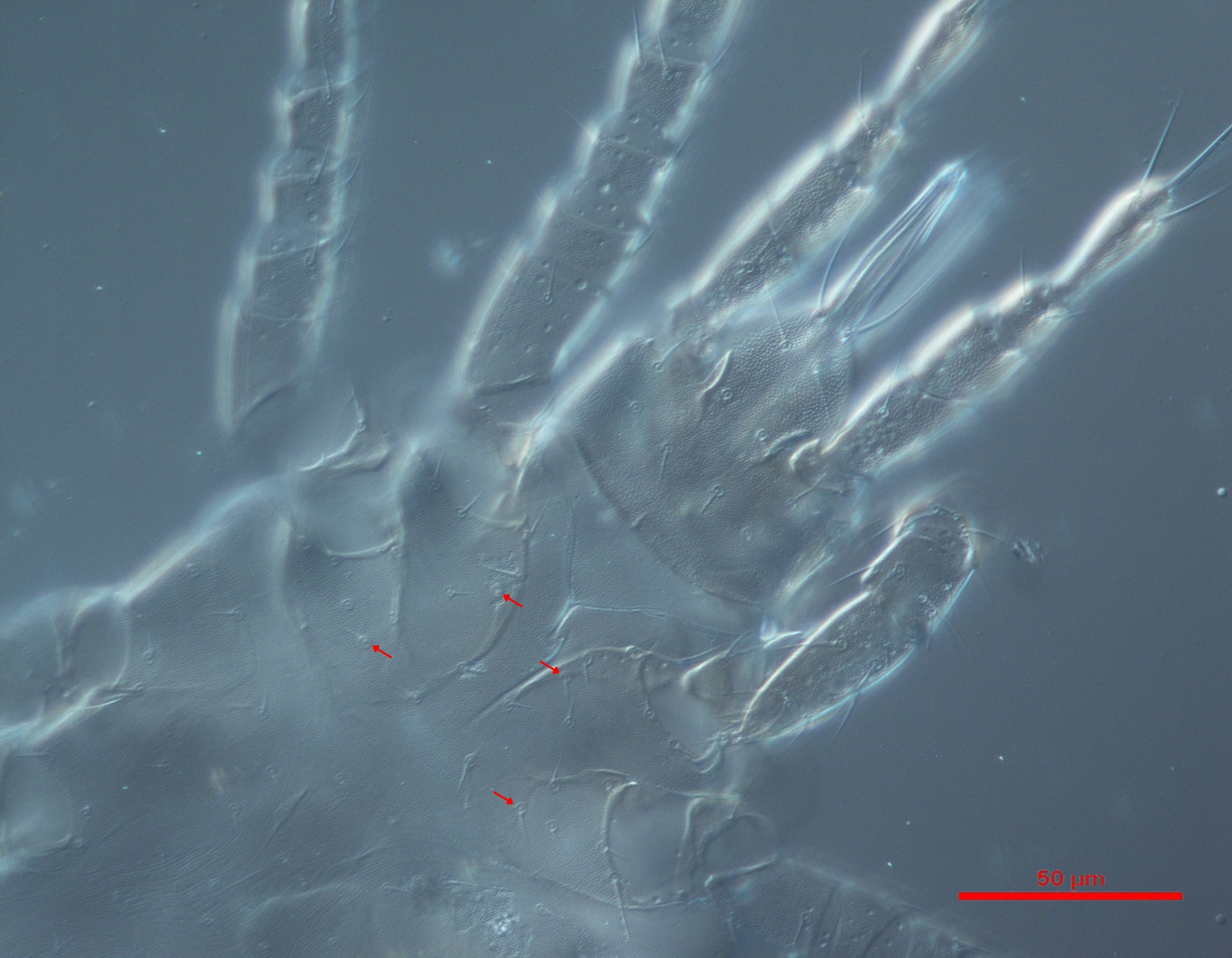 Figure 2. Ventral view of the Brazilian specimen of Parabonzia xinningensis. The red arrows indicate the additional pairs of setae present on coxa I and coxa II.