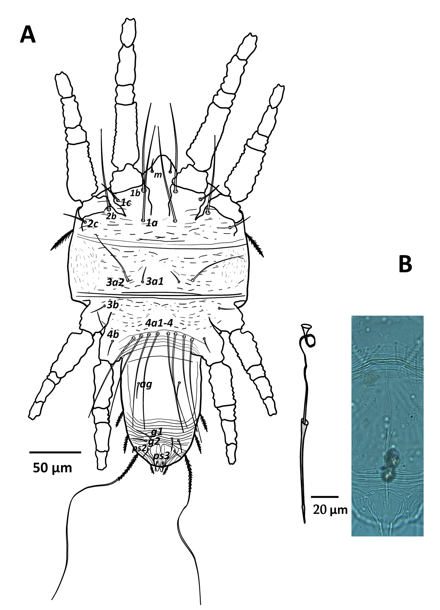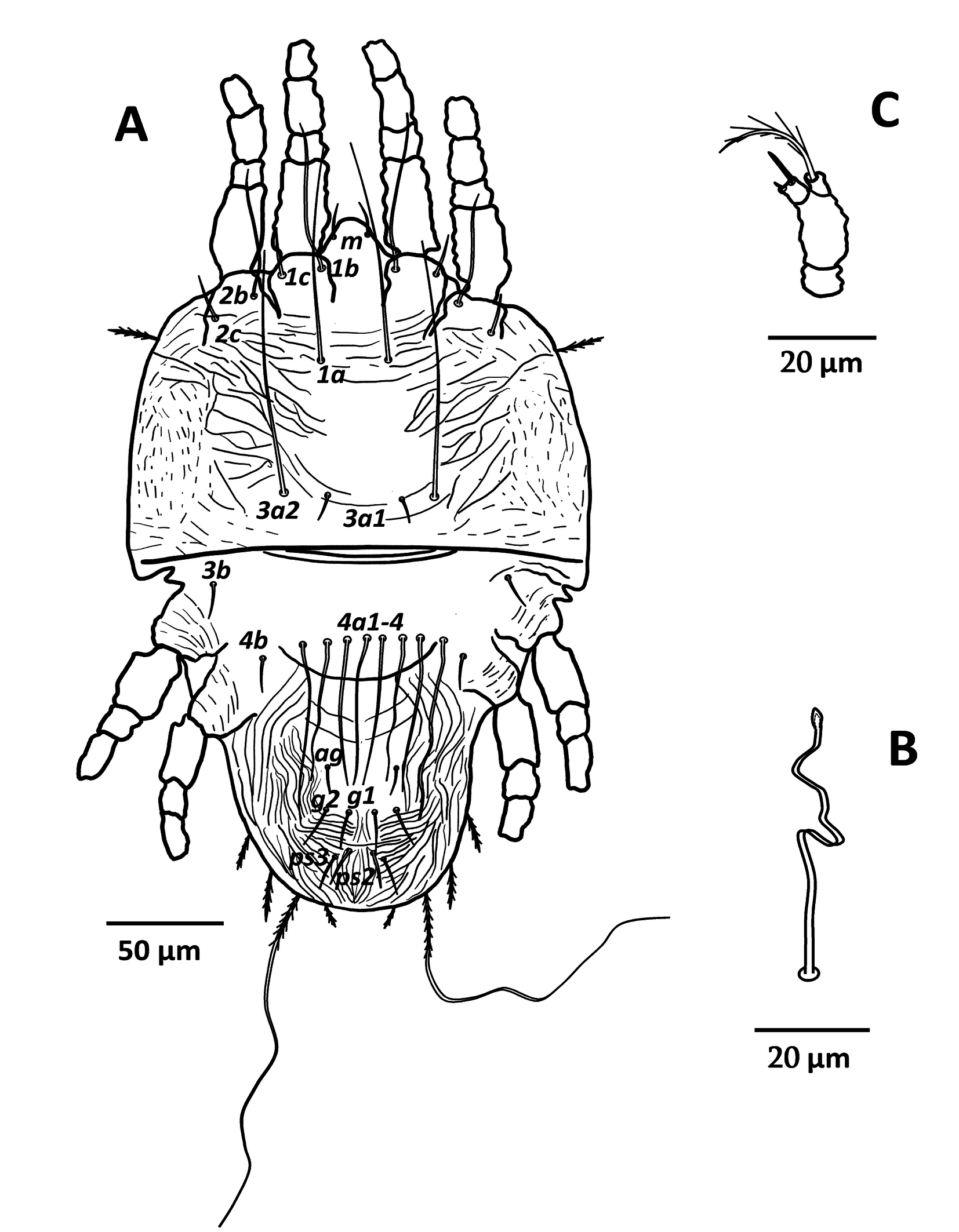Venter – (Figure 2A). Ventral cuticle between 1a–4a and 4a–ag mostly smooth; cuticle on the genital plate between ag–g1–2 mostly with transverse striae; lateral opisthosomal cuticle with longitudinal striae. Ventral setae fine and smooth. Two pairs of setae 3a1–2 and four pairs of setae 4a1–4 present. Setae 1a, 3a2 and 4a1–4 flagelliform; setae 3a1 short and setiform; setae 3a2 almost eight times as long as 3a1; setae 4a1–4 extend beyond the bases of agential setae; the longest setae 4a1 extend beyond the bases of genital setae. Aggenital setae (ag) slightly shorter than genital setae (g1–2). Lengths of setae: 1a 108–115, 1b 75–78, 1c 24–26, 2b 62–65, 2c 20–22, 3a 114–16, 3a2 114–116, 3b 20–22, 4a1 93–95, 4a2 88–90, 4a3 74–77, 4a4 72–75, 4b 18–20, ag 19–20, g1 23–25, g2 24–26, ps2 16–18, ps3 20–22.