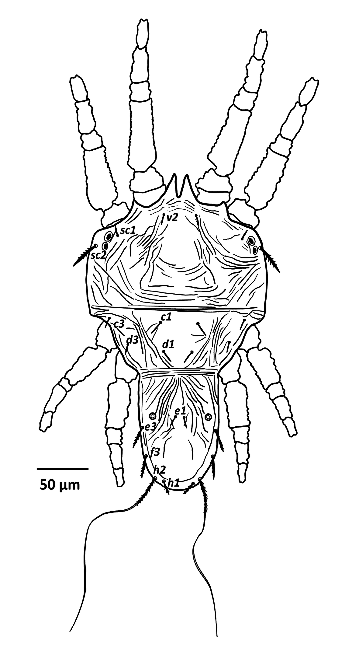 Dorsum – (Figure 1). Dorsum with irregular striae; prodorsum with strong wrinkles laterally and broken unclear striae medially. Projection on anterior margin of prodorsum with incision, depth of notch 23–25. Prodorsal setae v2 and sc1 short, almost equal in length; sc2 long, lanceolate and noticeably barbed; about 6 times as long as sc1. Lengths of prodorsal setae v2 6–7, sc1 5–6, sc2 36–38. Opisthosoma with transverse striae between c1–e1 and strong longitudinal wrinkles lateral to c1–e1, and with irregular striae posterior to e1; opisthosomal pores present anterior to e3; bearing one pair of humeral setae (c3), three pairs of dorsocentral setae (c1, d1 and e1), five pairs of dorsolateral setae (d3, e3, f3, h2 and h1; f2 absent). Setae c1, c3, d1, d3 and e1 short, subequal in length; e3, f3 and h1 lanceolate, barbed; e3 and f3 subequal in length and about five times as long as d1; setae h1 about three times as long as e1; h2 flagelliform, elongate and serrate at the beginning (Figure 1). Lengths of dorsal setae as follows: c1 7–8, c3 7–8, d1 5–6, d3 7–8, e1 5–6, e3 32–34, f3 30–32, h1 18–20, h2 152–156. Distances between dorsal setae: v2–v2 45-48, sc1–sc1 132–135, sc2–sc2 177–180, c1–c1 55–57, c3–c3 182–185, d1–d1 30–32, d3–d3 152–154, e1–e1 16–17, e3–e3 104–107, f3–f3 88–89, h1–h1 38–40, h2–h2 60–61.