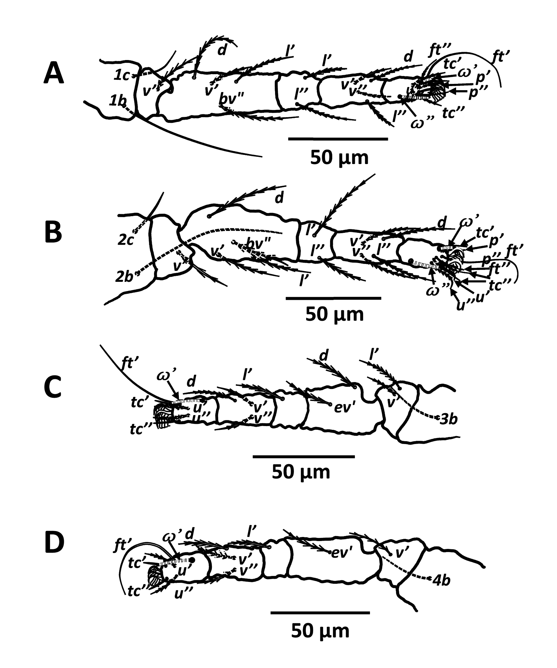 All specimens collected for the current study have four pairs of posterior medioventral setae 4a. However, Reck (1959) noted that intercoxal setae could include four or five pairs of setae 4a.