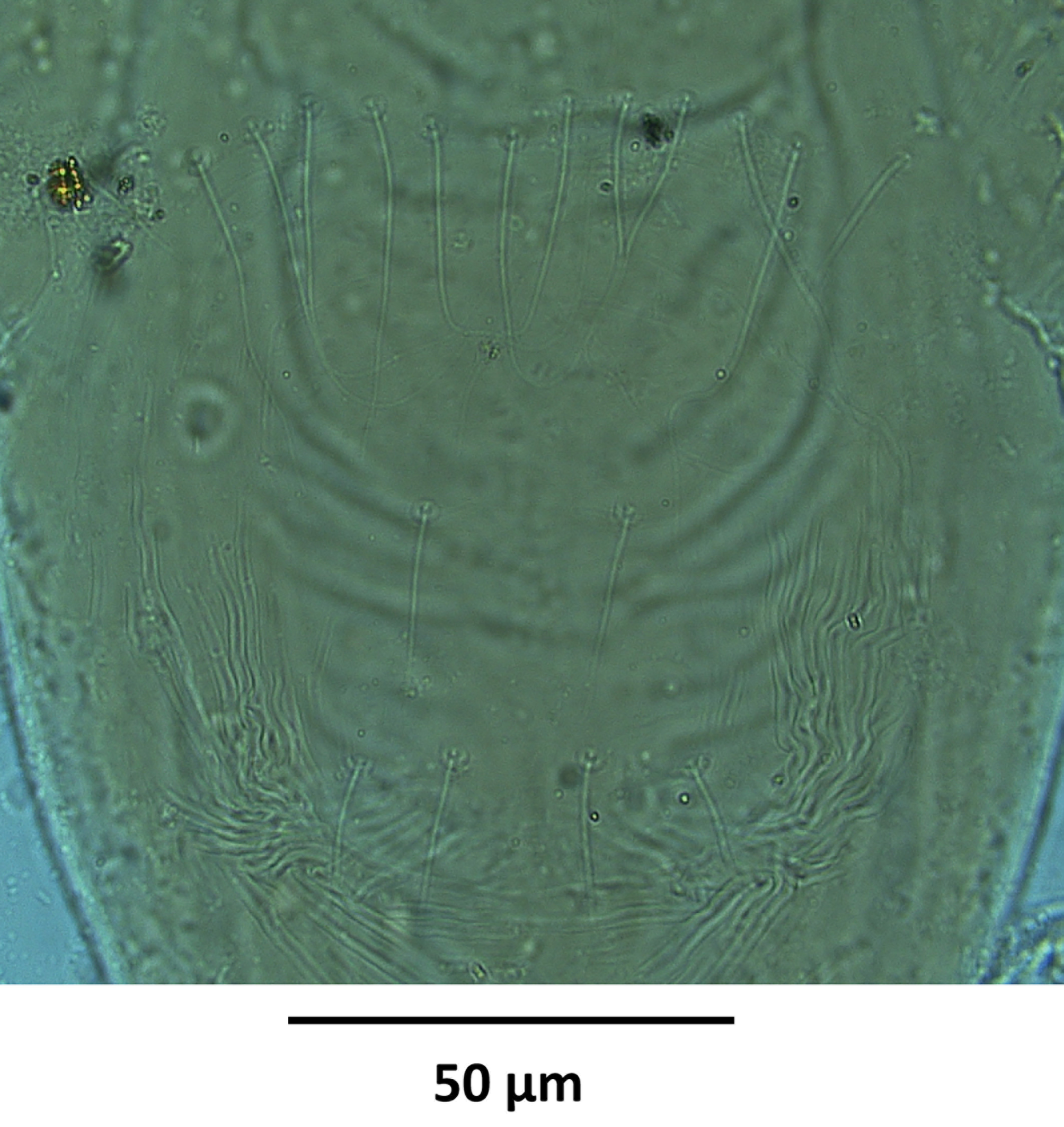 Venter – (Figure 5A). Ventral cuticle without transverse striae. Ventral setae similar to female except setae ps3 modified as accessory genital stylets, concealed by the anal valves. Lengths of setae: 1a 98–100, 1b 84–86, 1c 20–23, 2b 72–75, 2c 18–20, 3a1 12–14, 3a2 102–106, 3b 21–23, 4a1 73–75), 4a2 75–76, 4a3 80–82, 4a4 82–84, 4b 16–17, ag 15–16, g1 16–17, g2 15–17, ps2 10–11, ps3 8–9.