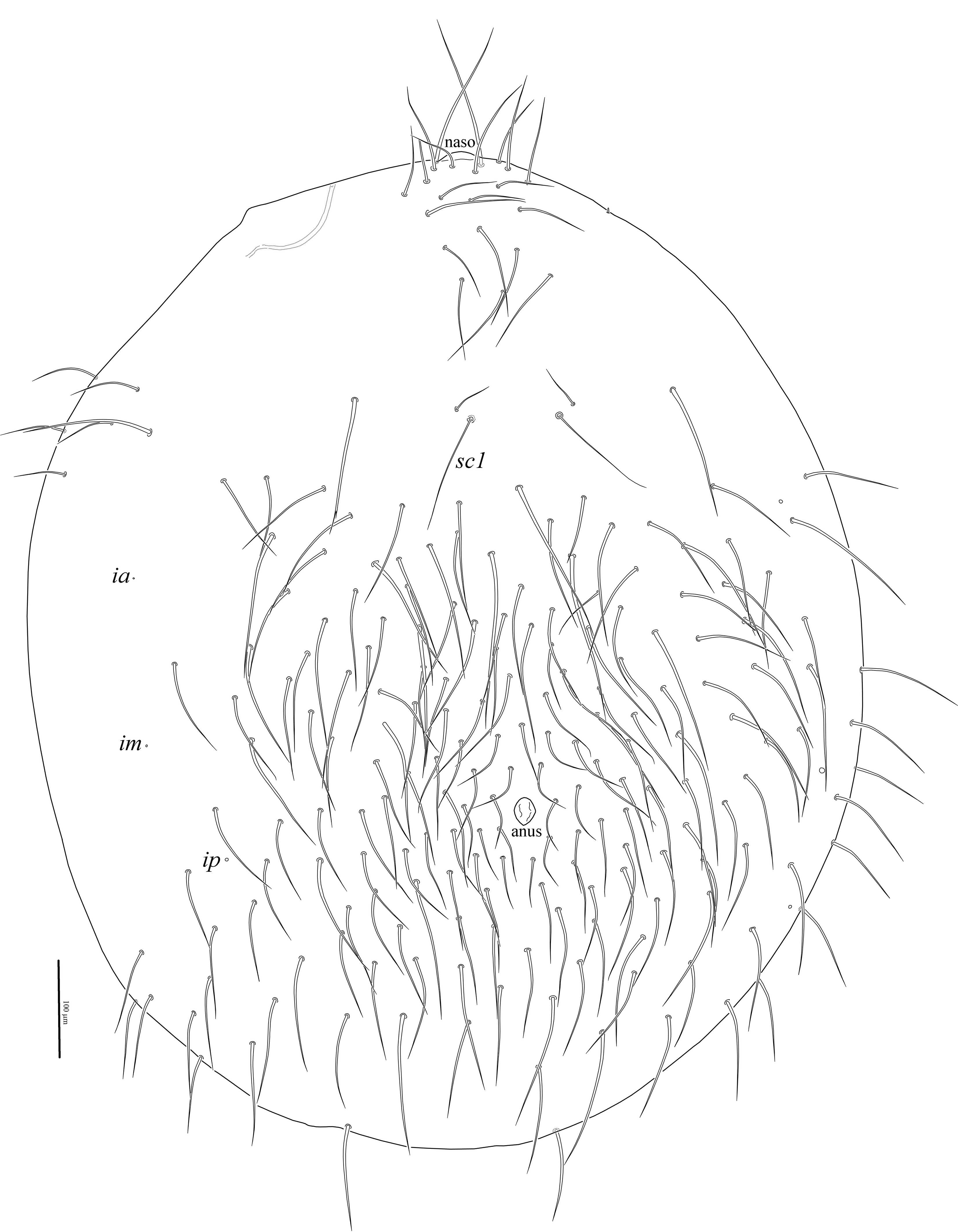 Adults — Idiosoma oval (Fig. 1). Cuticle soft and striate-tuberculate (Figs 7E, F). Sejugal furrow not developed. Idiosomal chaetotaxy distinctly polytrichous. Naso (epivertex) small, with or without setae, situated on anterior margin of prodorsum. Lens-like eyes present or not discernible. Trichobothria (sc1) smooth (Fig. 7B). Other idiosomal setae simple, smooth; one pair of setae anterolaterad trichobothria distinctly shorter than others (Figs 7A, B). Lyrifissures ia, im and ip very small and hardly discernible (Fig. 2), ih not discerned. Anal opening small, situated dorsally (Fig. 7A) and forming chitinised tube. Six pairs of smooth eugenital setae (Fig. 6A). Two pairs of very large genital papillae.