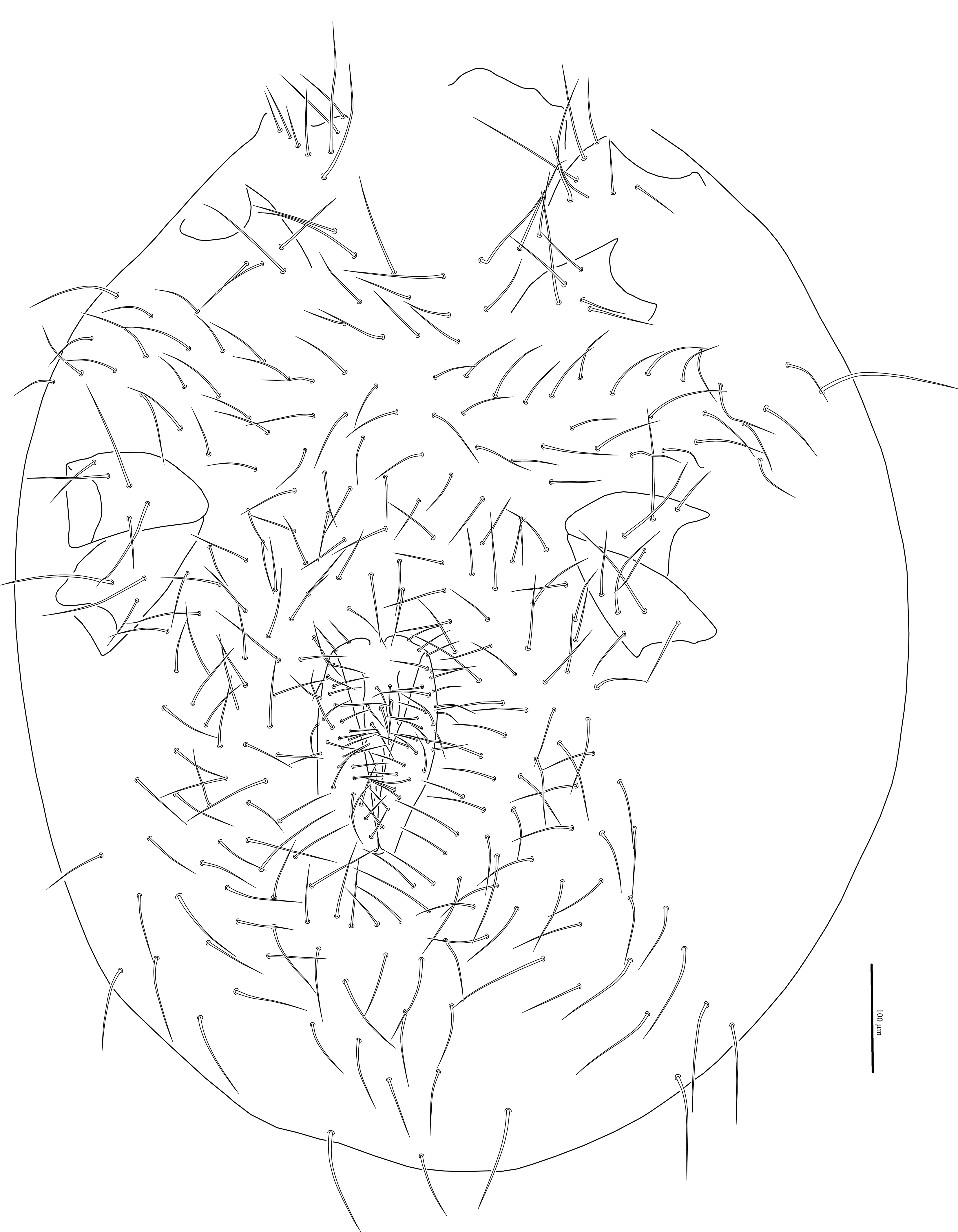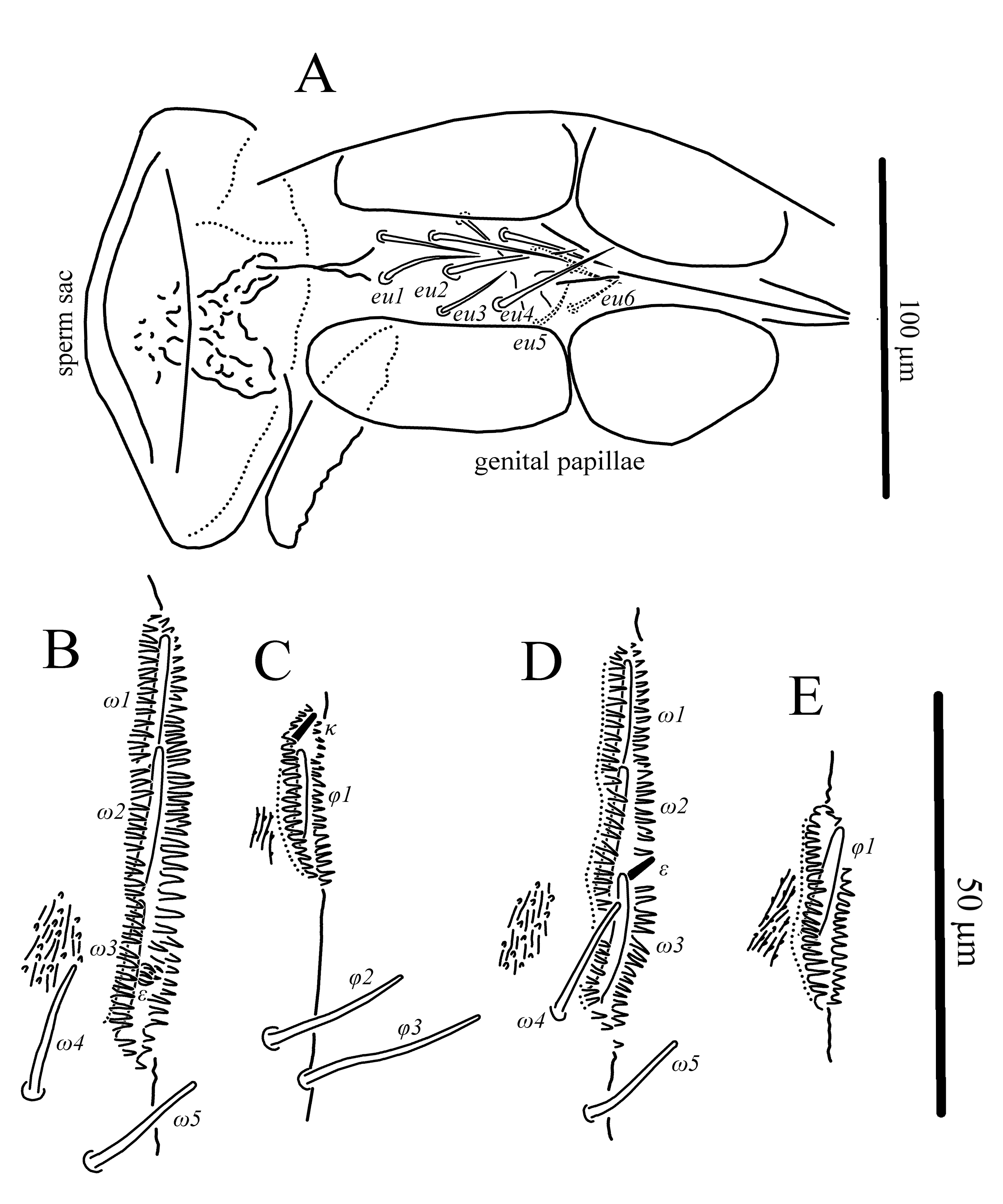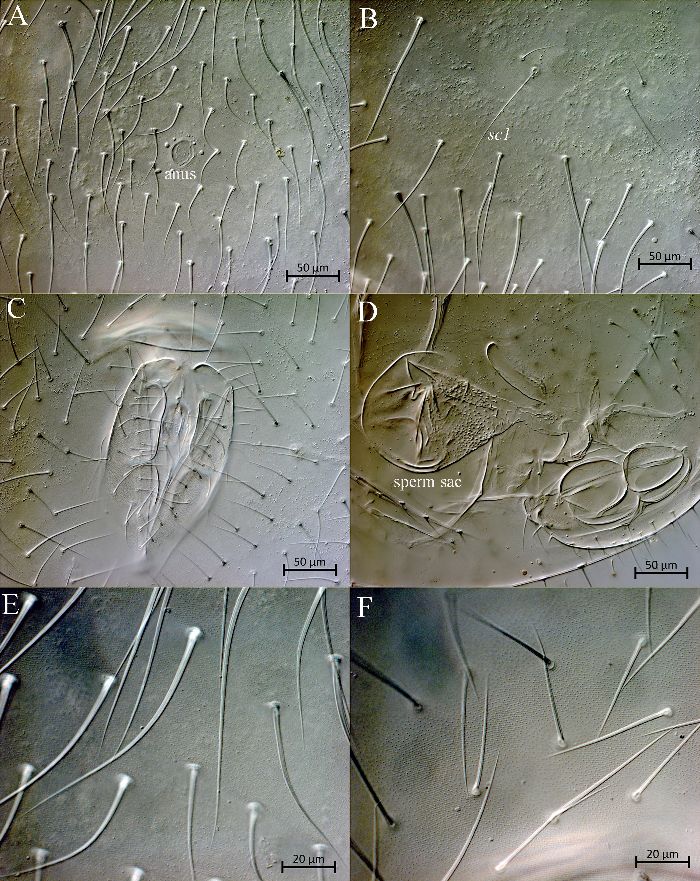 Idiosomal venter – (Figs 3, 6A, 7C, D, F). Integument similar to that of the dorsal surface (Fig. 7F). Coxal fields faintly defined. Large areas posterolaterally to legs IV without setae. Genital valves with numerous smooth genital setae (Fig. 7C). Anterior pair of genital papillae larger than posterior one (Fig. 6A). Sperm sac rugose in basal half and smooth distally (Fig. 7D).