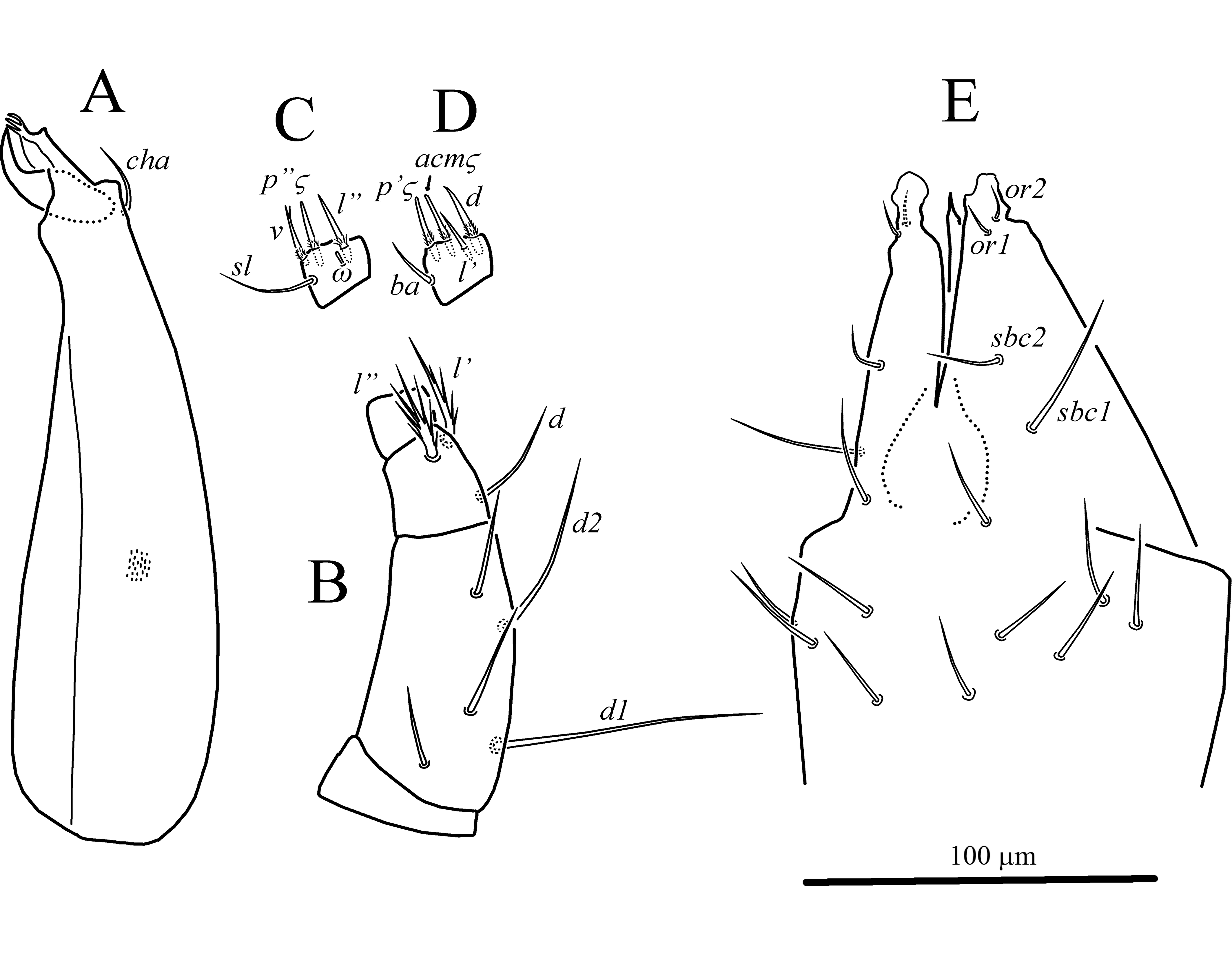 Gnathosoma – (Fig. 4). Palp (Figs 4B-D) short, with striate-granulate integument; all setae of femorogenu and seta d of tibia smooth and pointed; setae (l) strongly barbed. Palptarsus very short and wide; setae (p) and acm distinctly blunt-tipped, eupathid-like, other setae pointed; setae d, acm, (p), and v with small numerous barbs in basal part, other tarsal setae pointed; seta v bifurcated distally. Chelicera (Fig. 4A). Integument of shaft smooth on paraxial face, spiculate over remainder, seta cha smooth, pointed. Subcapitulum with short, smooth adoral setae or1 and or2, located subterminally on membranous malae; subcapitular setae sbcl about 1.5 times longer than sbc2. Area posteriad setae sbc1 with 11 simple setae (Fig. 4E).