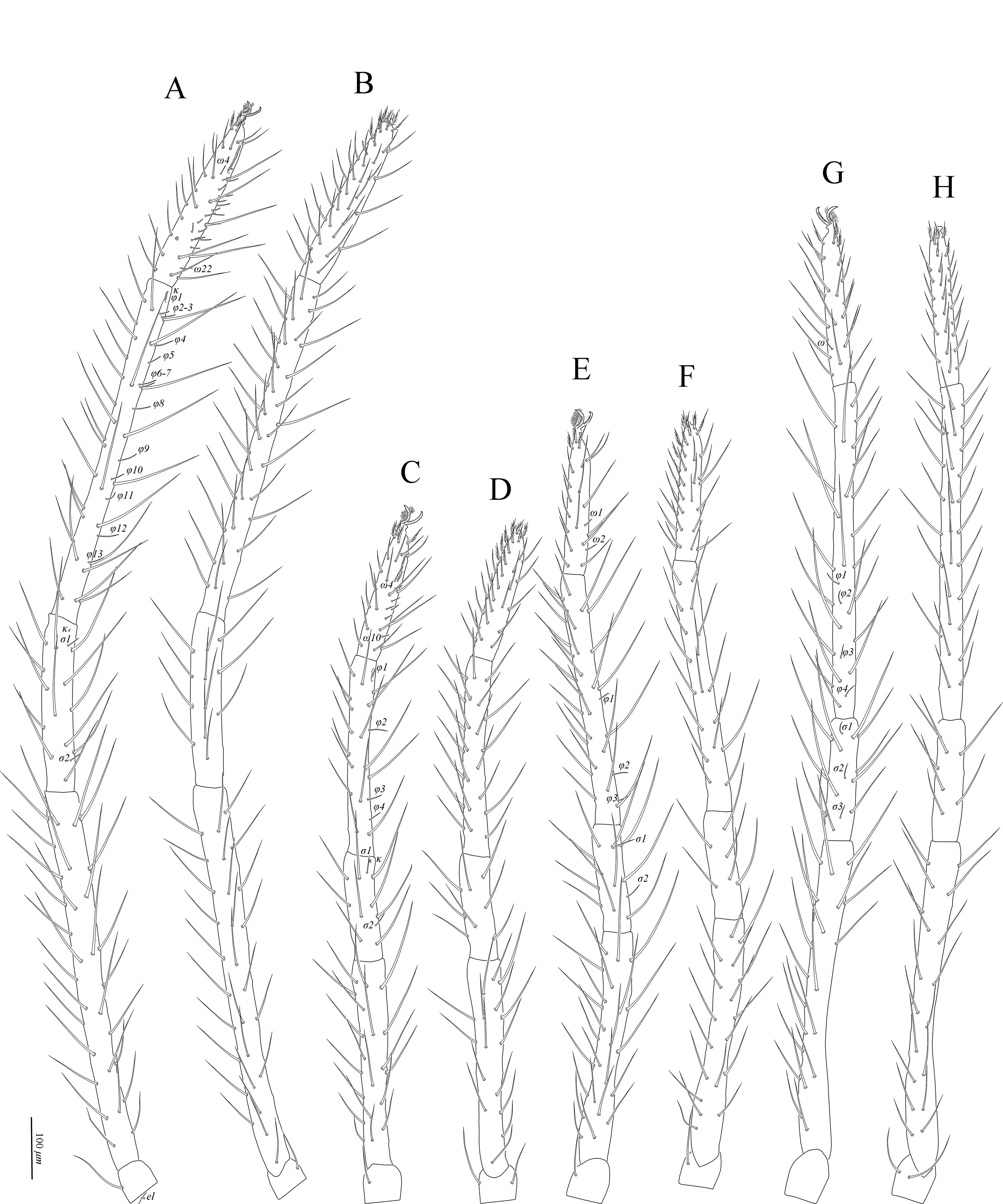 Legs – (Figs 5, 6B-E). Integument on leg segments similar to that of idiosomal dorsum. Lengths of legs (without claws): leg I-1810, leg II-1100, leg III-1250, leg IV-1565. Leg I (Figs 5A, B, 6B, C): supracoxal seta el smooth, baculiform, setal formula: Tr 2, Fe 58, Ge 24(2σ, 1k), Ti 66(13φ, 1k), Ta 66(22ω, 1ε). Rhagidial organ on tarsus I with three rhagidial solenidia arranged longitudinally in single depression (Fig. 6B); famulus ε (stellate seta) located laterad basal solenidion of rhagidial organ I; 19 erect solenidia located dorsally posteriad rhagidial organ I. Tibia with 12 dorsal erect solenidia located posteriad rhagidial solenidion φ1; genu with two dorsal erect solenidia. Six pairs of anterolateral and distiventral tarsal setae strongly barbed, other leg setae smooth. Leg II (Figs 5C, D, 6D, E): setal formula: Tr 3, Fe 36, Ge 17(2σ, 1k), Ti 39(4φ), Ta 52(10ω, 1ε). Rhagidial organ on tarsus II with three rhagidial solenidia arranged longitudinally in single depression (Fig. 6D); famulus ε baculiform, located laterad insertion of second rhagidial solenidion in rhagidial organ II; nine erect solenidia arranged serially posteriad rhagidial organ II. Tibia with three dorsal erect solenidia; genu with two dorsal erect solenidia. Seven pairs of anterolateral and anteroventral tarsal setae strongly barbed, other leg setae smooth. Leg III (Figs 5E, F): setal formula: Tr 2, Fe 42, Ge 17(2σ), Ti 45(3φ), Ta 50(2ω). Tarsus with two dorsal erect solenidia; tibia with three dorsal erect solenidia; genu with two dorsal erect solenidia. Tarsus with 11 anterolateral and anteroventral setae strongly barbed, other leg setae smooth. Leg IV (Figs 5G, H): setal formula: Tr 2, Fe 38, Ge 18(3σ), Ti 53(4φ), Ta 49(1ω). Tarsus with one dorsal erect solenidion; tibia with four dorsal erect solenidia; genu with three dorsal erect solenidia. Tarsus with 10 anterolateral and distiventral setae strongly barbed, other leg setae smooth.