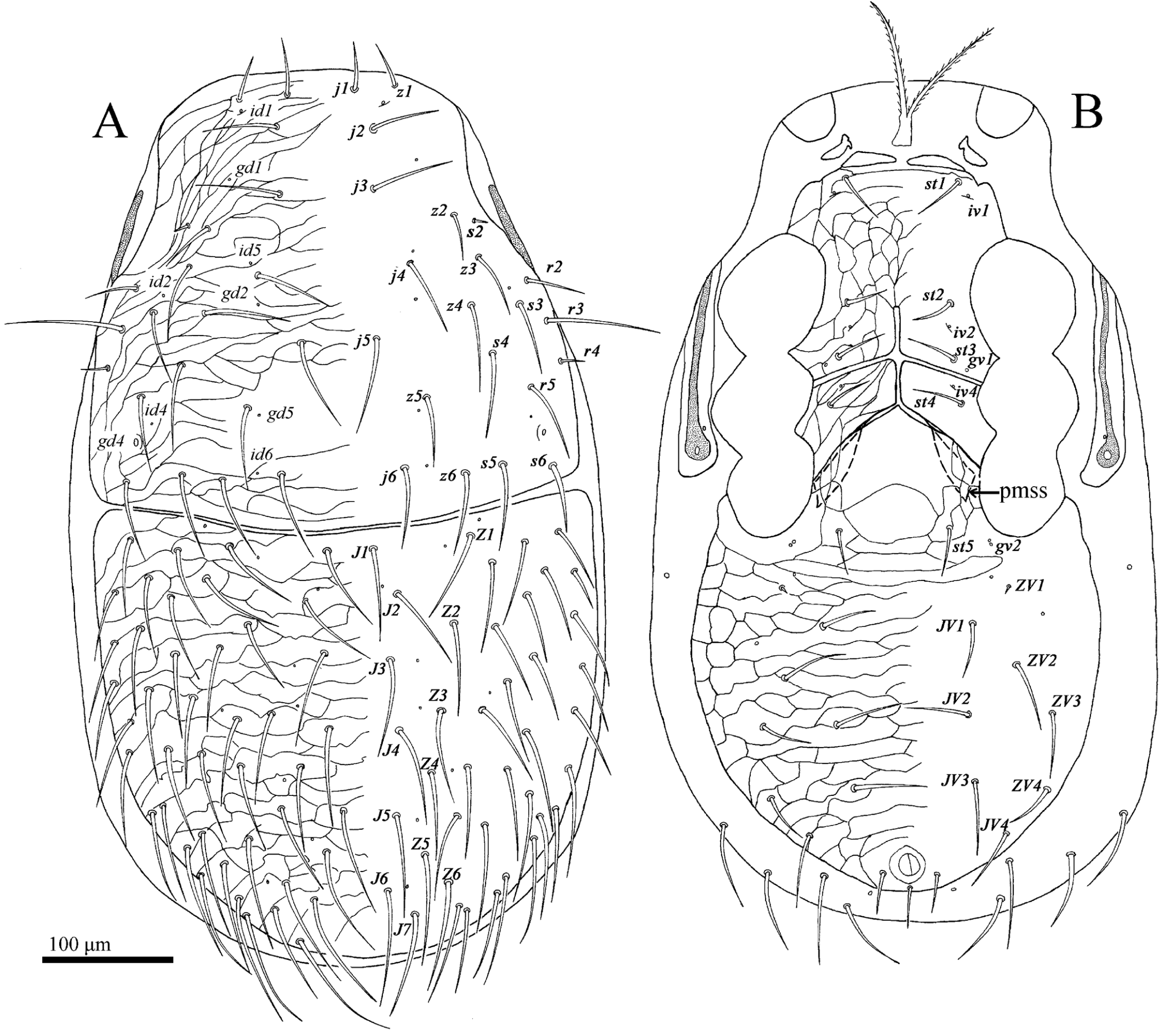 Dorsal idiosoma – (Figure 1A). Dorsum covered by two reticulated shields. Podonotal shield bearing 21 pairs of setae, which of s2 and r4 shorter than others. Lengths of setae on the podonotal shield: j1 46 (44–46), j2 55 (55–58), j3 64 (60–64), j4 62 (60–63), j5 76 (74–76), j6 68 (65–68), z1 35 (33–35), z2 37 (35–37), z3 52 (50–52), z4 68 (64–68), z5 61 (57–61), z6 67 (64–67), s2 11 (8–11), s3 64 (60–64), s4 72 (70–72), s5 68 (65–68), s6 61 (57–61), r2 47 (45–47), r3 88 (86–89), r4 20 (18–21), r5 63 (60–63). Opisthonotal shield bearing 44 pairs of setae, the vast majority of setae almost equal in length (76–82). All dorsal setae simple and smooth.