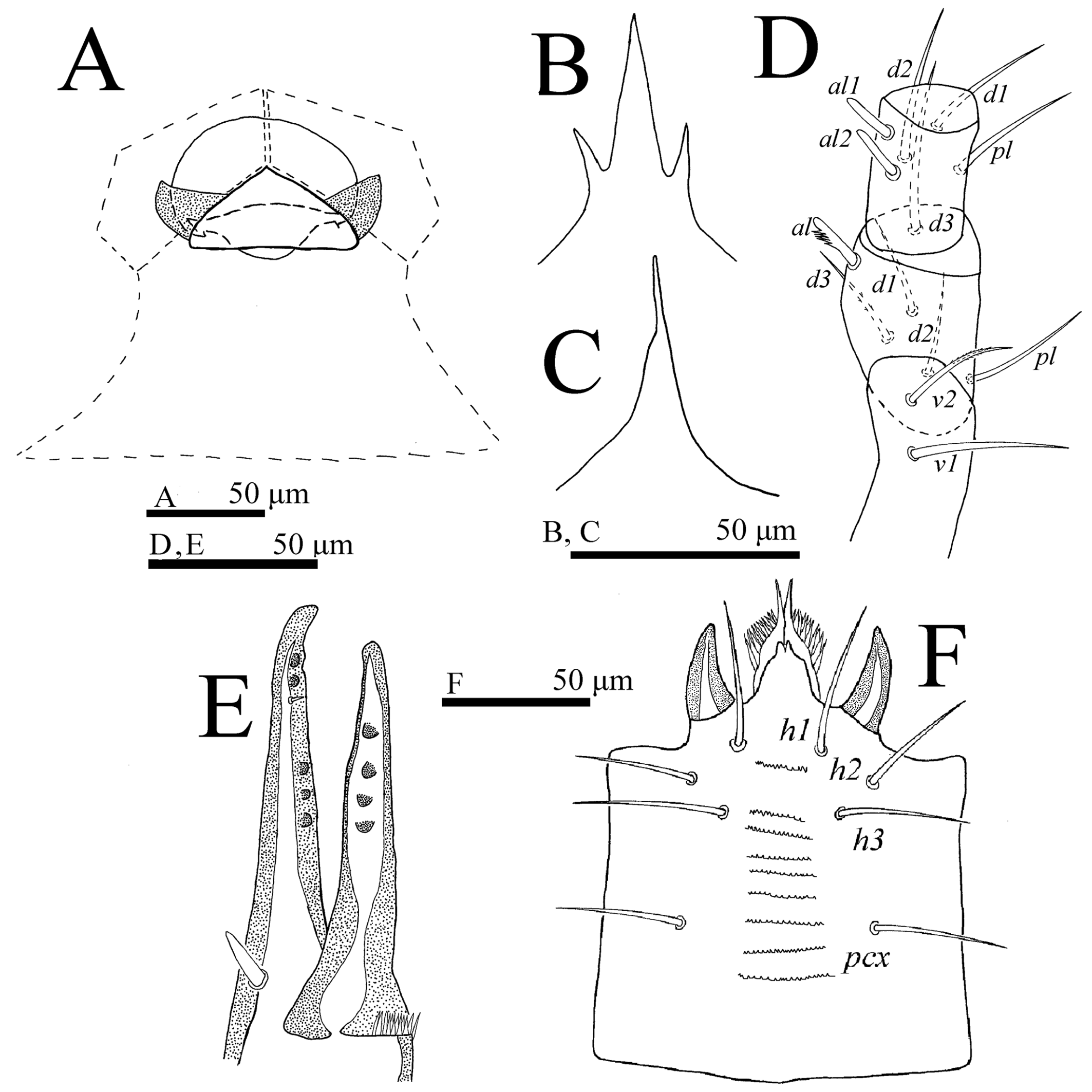 Gnathosoma – (Figure 2B–2F). Gnathotectum anterior margin with three prongs pointed apically, central one longer than lateral ones (Figure 2B); in one specimen only one prong (Figure 2C). Palp length 222 (222–266), seta v2 on the trochanter pilose distally, al on femur comb-like, al1 and al2 on the genu rod-like (Figure 2D). Fixed digit of chelicera with five teeth of similar size, two of them ahead of pilus dentilis, three behind pilus dentilis, movable digit bearing four teeth (Figure 2E). Corniculus horn-shaped, stout and relatively short, length 28 (28–32); deutosternal groove with nine denticulate rows; seta h1 52 (51–55), h2 41 (39–42), h3 55 (55–59) and pcx 45 (41–45) simple (Figure 2F).