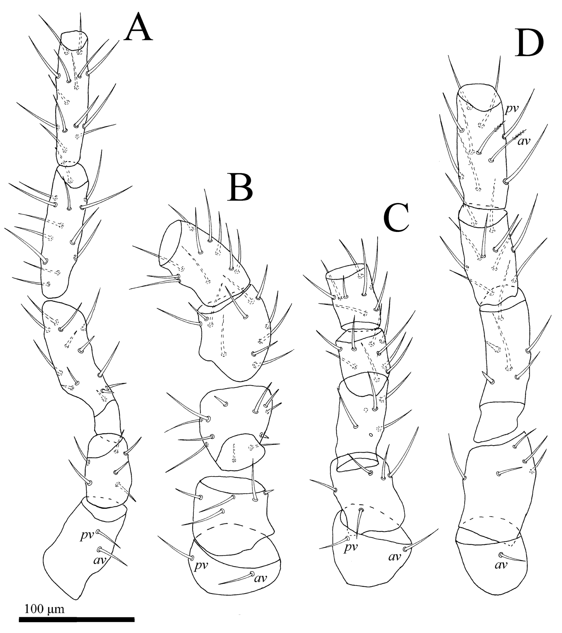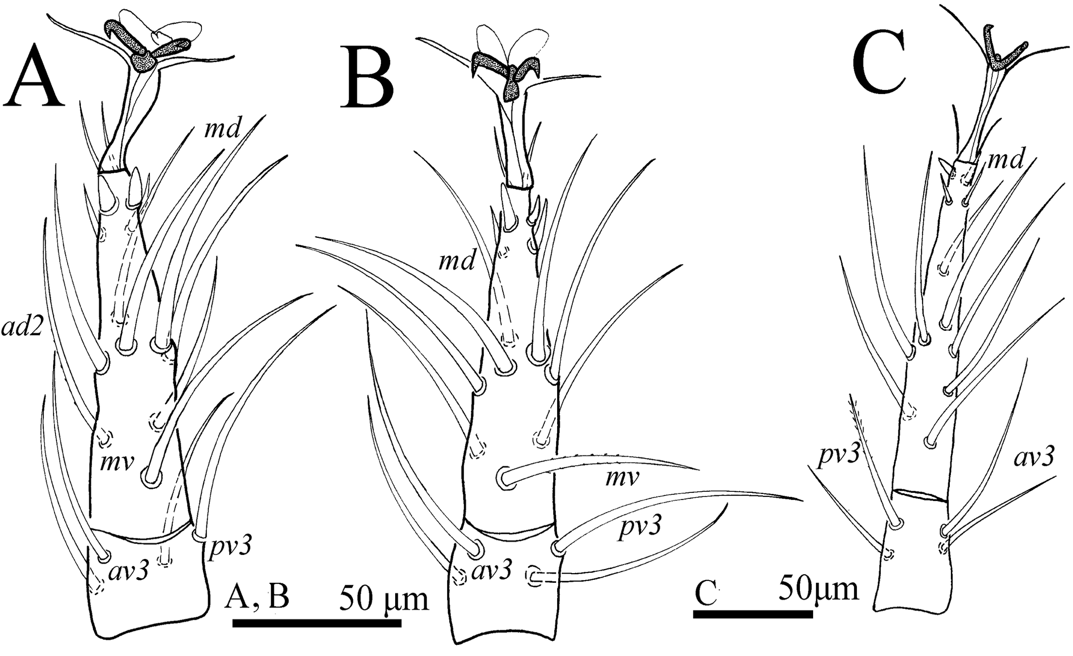 Legs – (Figures 3–4). Lengths of legs Ⅰ–Ⅳ: 658 (648–671), 437 (398–437), 397 (376–397), 643 (643–682), respectively. Most leg setae smooth. Setae av and pv on tibiae IV and pv3 on tarsi Ⅳ barbed. Setae av1, al1, pv1 and pl1 on tarsi Ⅱ–Ⅳ modified to short and thick spurs (Figure 4).