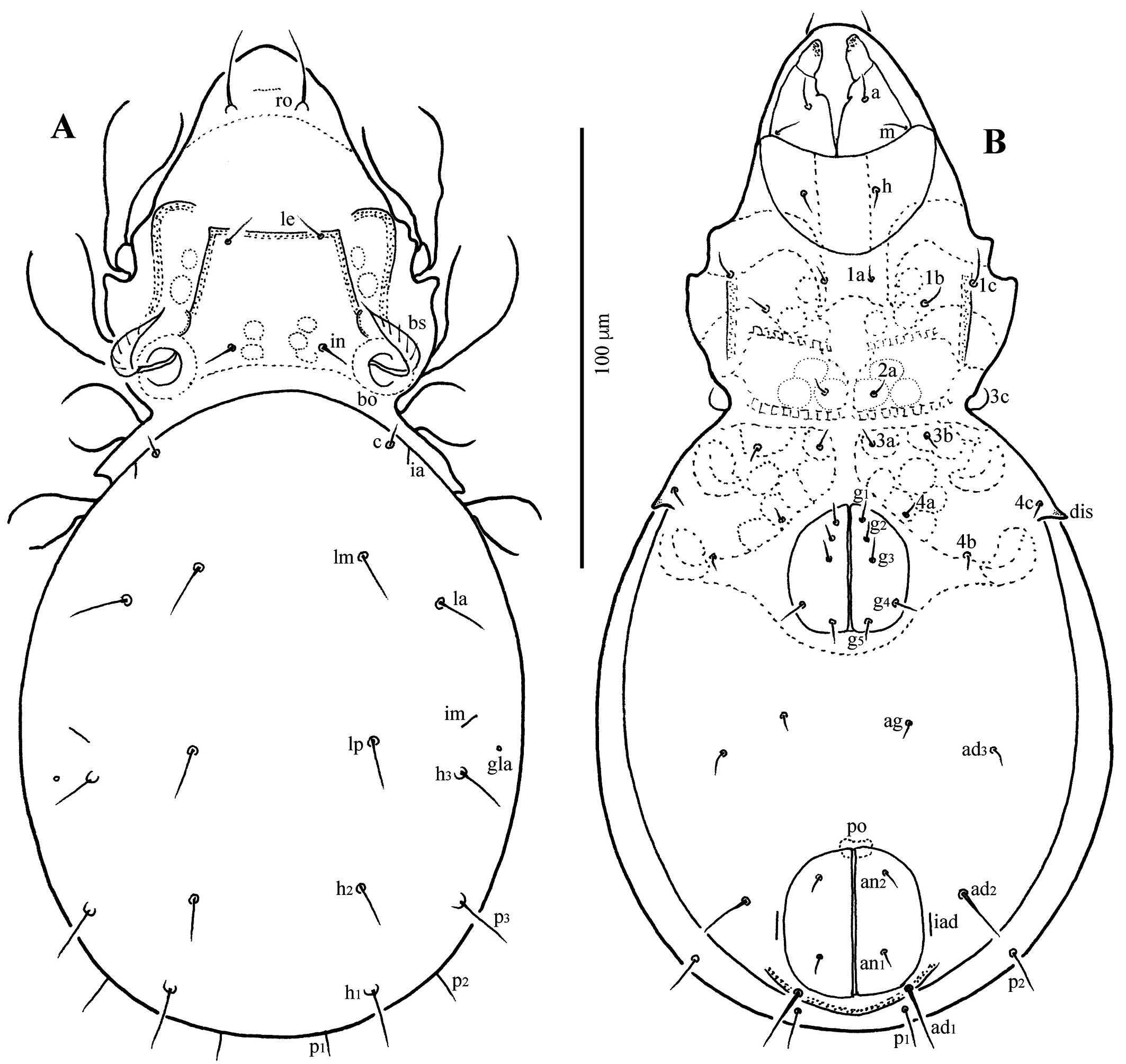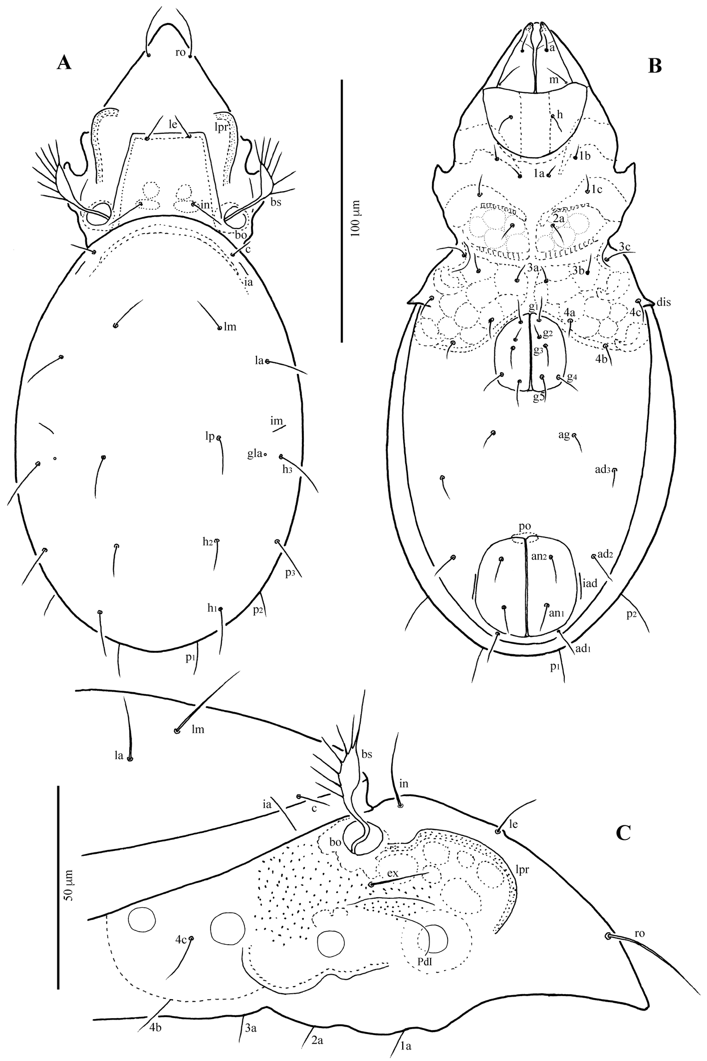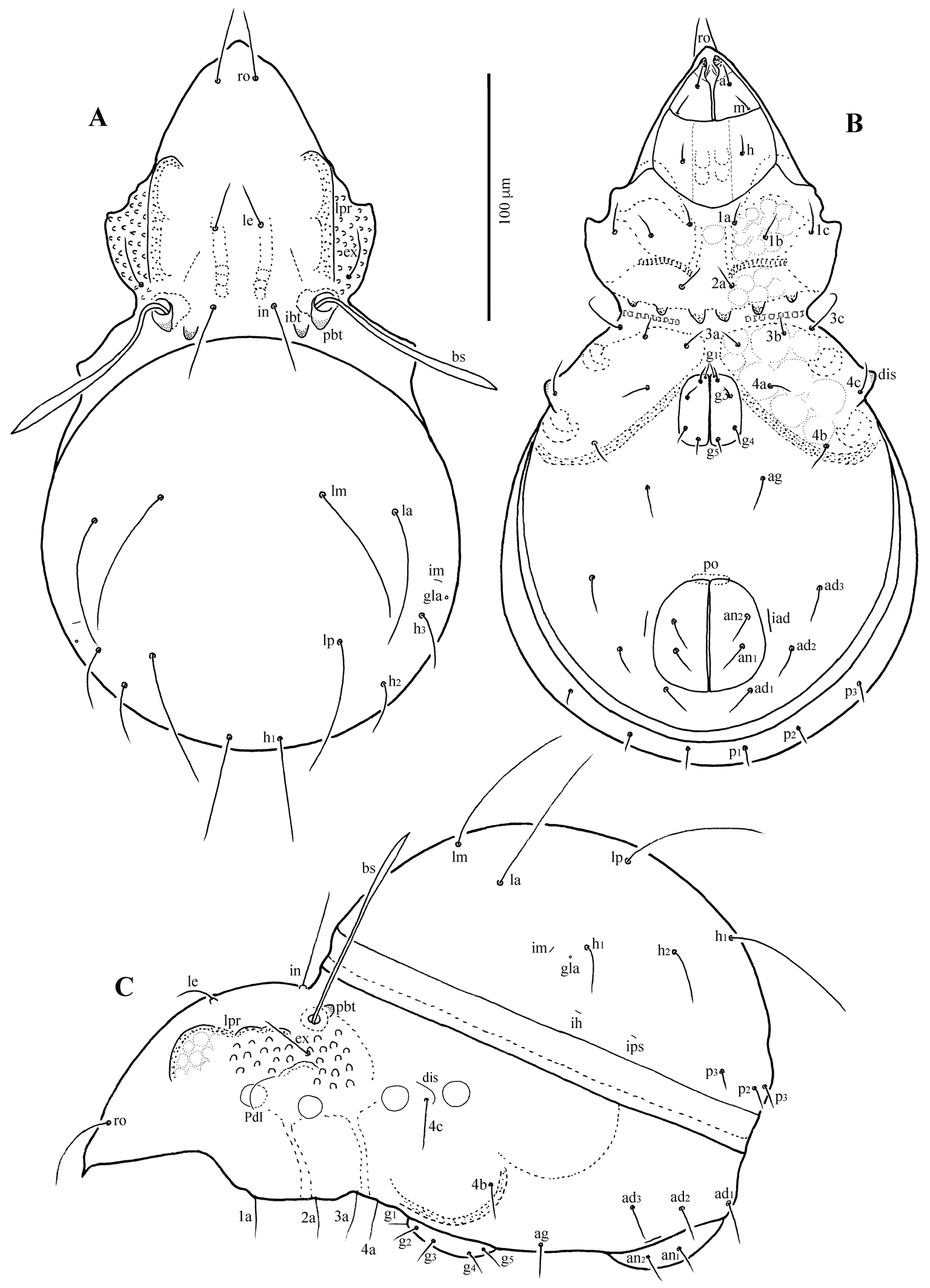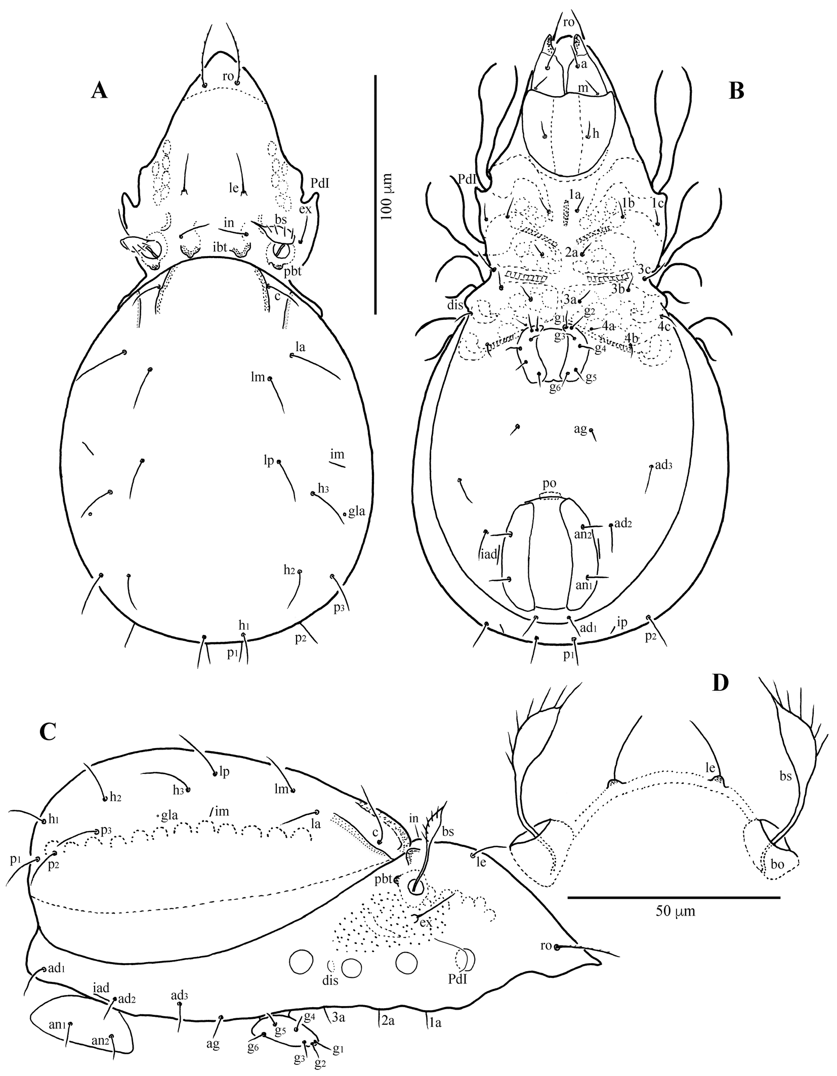 The following abbreviations are used. Prodorsum: ro, le, in, bs, ex – rostral, lamellar, interlamellar, bothridial, and exobothridial setae, respectively; bo – bothridium; ibt – interbothridial tubercle; pbt – postbothridial tubercle; lateral prodorsal ridge – lpr. Notogaster: c, la, lm, lp, h1–h3, p1–p3 – setae; ia, im, ip, ih, ips – lyrifissures; gla – opisthonotal gland opening. Gnathosoma: a, m, h – subcapitular setae, cha, chb – cheliceral setae, Tg – Trägårdh's organ, or – adoral seta; d, l, v, cm, ul, su, vt, sup, inf, lt – palp setae; ω – palp solenidion. Epimeral and anogenital regions: PdI – pedotectum I; 1a–1c, 2a, 3a–3c, 4a–4c – epimeral setae; dis – discidium; g1–g5, ag, an1, an2, ad1–ad3 – genital, aggenital, anal, and adanal setae, respectively; iad – adanal lyrifissure; po – preanal organ. Legs: ω, φ, σ – solenidia; ɛ – famulus; d, l, v, bv, ev, ft, tc, it, p, u, a, s, pv, pl – setae.