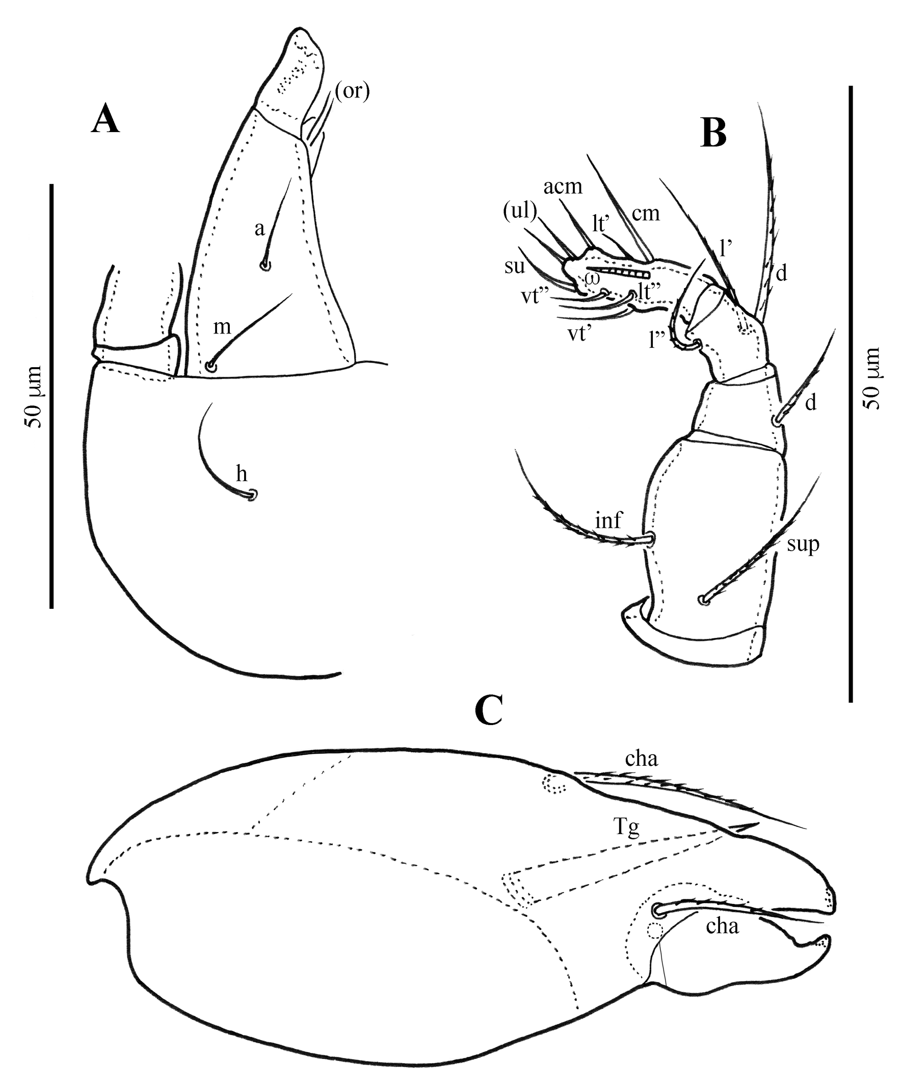 Gnathosoma (Figs 5B, 6B) — Subcapitulum slightly wider than long; subcapitular setae a, m and h setiform, smooth, 8–12 μm. Palpal setation: 0–2–1–3–9(+ω); cheliceral setae setiform, finely barbed; cha longer than chb.