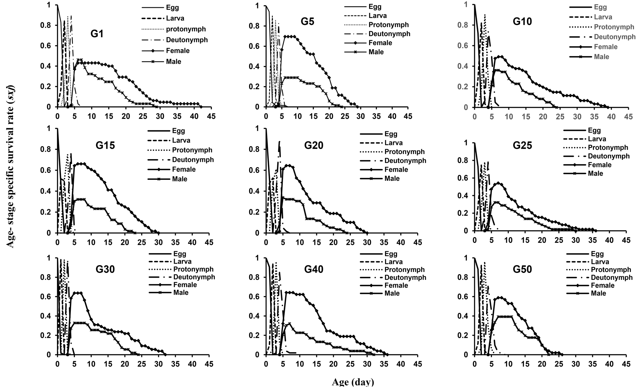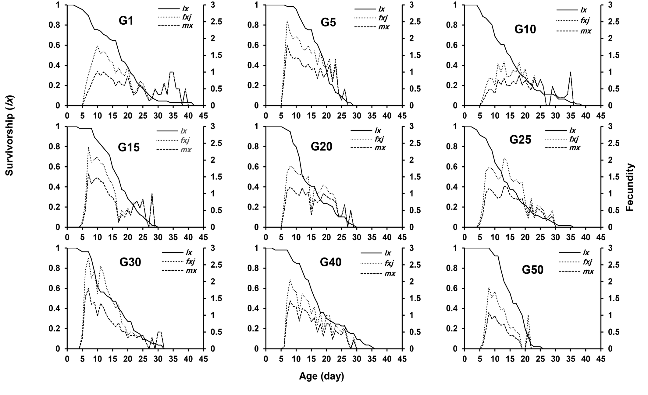 The age-specific survival (lx ) of E. scutalis on the first day of adult emergence in G1, G5, G10, G15, G20, G25, G30, G40, and G50 was 1.00, 0.92, 1.00, 0.98, 0.98, 0.92, 0.96, 0.98, and 1.00, respectively (Figure 2). The female age-specific fecundity (fx ) of this mite was highest on the 10th day (1.79 eggs/female/day), with additional peaks on the 7th day (2.54 eggs/female/day), 13th day (1.30 eggs/female/day), 7th day (2.38 eggs/female/day), 7th day (1.81 eggs/female/day), 13th day (2.06 eggs/female/day), 7th day (2.71 eggs/female/day), 8th day (2.06 eggs/female/day), and 8th day (1.83 eggs/female/day) in the aforementioned generations, respectively (Figure 2).