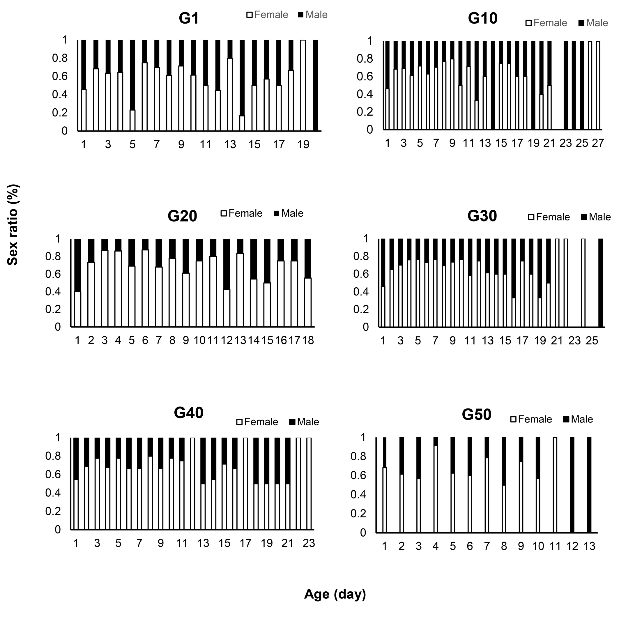 Figure 3 illustrates how the age of the female predator influences the sex ratio of their progeny. The sex ratio varied among generations and over the course of oviposition. In all generations, the sex ratio of the offspring was biased towards females during most of the egg-laying period. However, in the first, 30th and 50th generations, the sex ratio skewed towards males during the first and last days of oviposition. In the 40th generation, the sex ratio remained biased towards females throughout the entire egg-laying period.