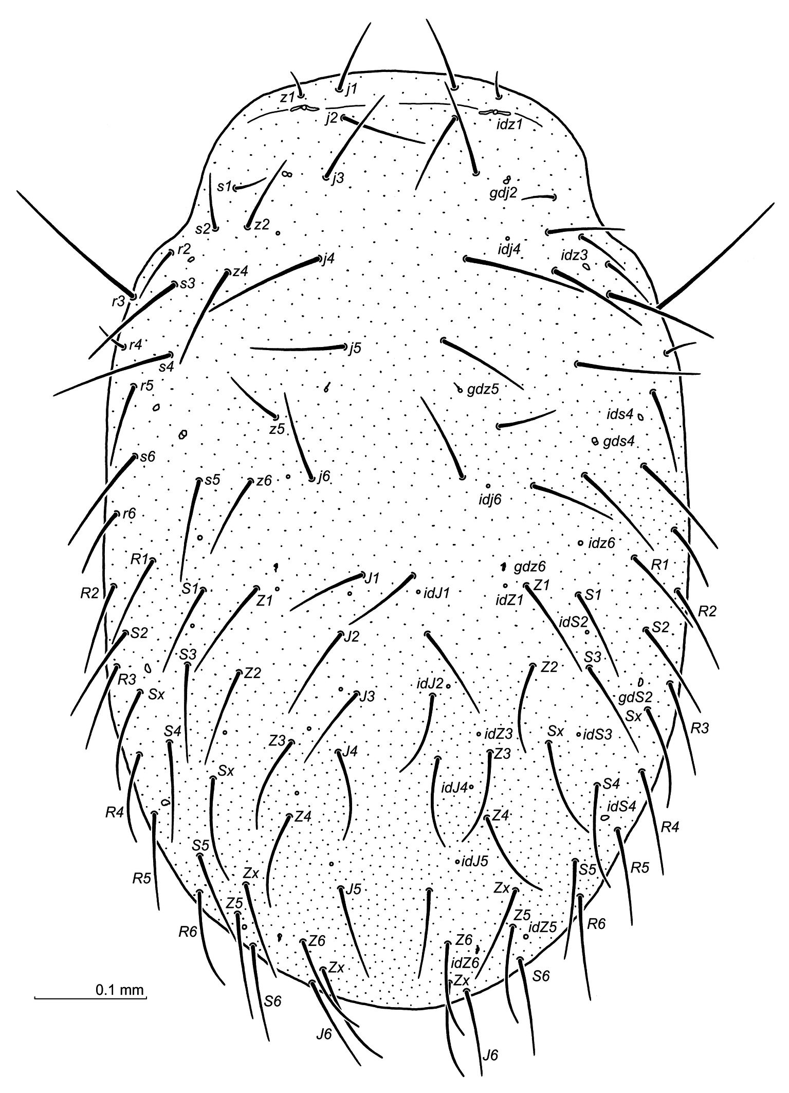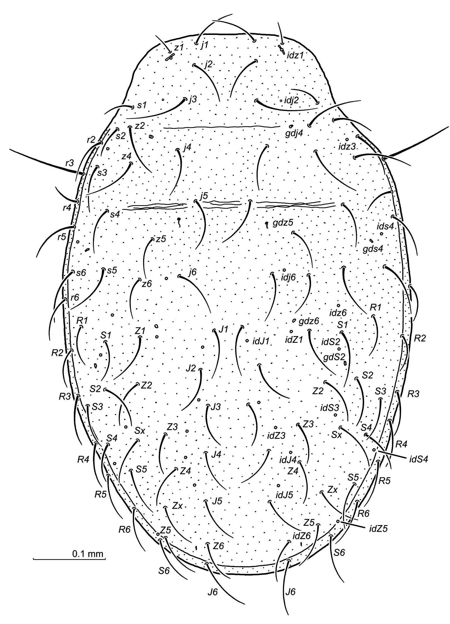 Idiosoma (Fig. 1) — Well sclerotised, oval and relatively wide, 858 x 550 in holotype (length x width), in paratypes 820–860 x 540–555 (n=4). Podonotum – 22 pairs of long setae (r1 and z3 absent), ca. 70–90, but 24–27 (z1), 28–31 (s1), 49–54 (s2), 49–60 (r2), 128–140 (r3), 29–39 (r4), 55–60 (r6). Six pairs of pore openings (idj4, idj6, idz1, idz3, idz6, ids4) and four pairs of gland openings (gdj2, gdz5, gdz6, gds4) are observed. Opisthonotum – with 27 or 28 pairs of long setae (ending near the next setae row), since the two supplementary pairs (Zx) are located in the rear part of the opisthosoma, as well as one or two pairs (Sx) (Fig. 1) are located laterally in the area of gdS2 openings. Opisthonotal setae range from ca. 72 to 90. Dorsal setae simple. Eleven pairs of pore openings (idJ1, idJ2, idJ4, idJ5, idZ1, idZ3, idZ5, idZ6, idS2–idS4) and one pair of gland openings (gdS2) are discernible. Gland pores gdZ4 absent. Podonotum not reticulated, opisthonotum with a scale-like reticulation. Peritreme – length 356 in holotype and 327–340 in paratypes, ending anteriorly at the Co I level.