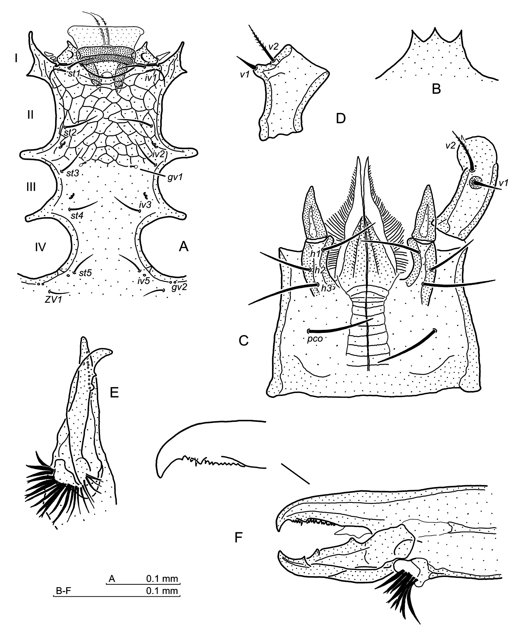 Gnathosoma — Gnathotectum (Fig. 10B) with similar prongs, wider than in the females. Corniculi slim, settled on the arcuate bases (genae) (Fig. 10C). Hypostome with 11 rows of denticles, Q1 and Q2 arcuate anteriorly. Hypostomatic and palpcoxal setae simple, h2 shorter than the others. Palptrochanter v1 seta shorter than v2 and located on the tubercle (Fig. 10C, D), seta v2 in distal half barbed. Chelicerae – when observed ventrally (Fig. 10E), the fixed digits are regularly tapered, whereas the movable digits are shorter and terminally curved. Laterally (Fig. 10F), the fixed digit terminally hooked, bearing a row of dozen or so denticles and one larger denticle by the side of the pilus dentilis. The movable digit with two teeth in digit midway and the tooth-like protrusion of digit margin proximally.