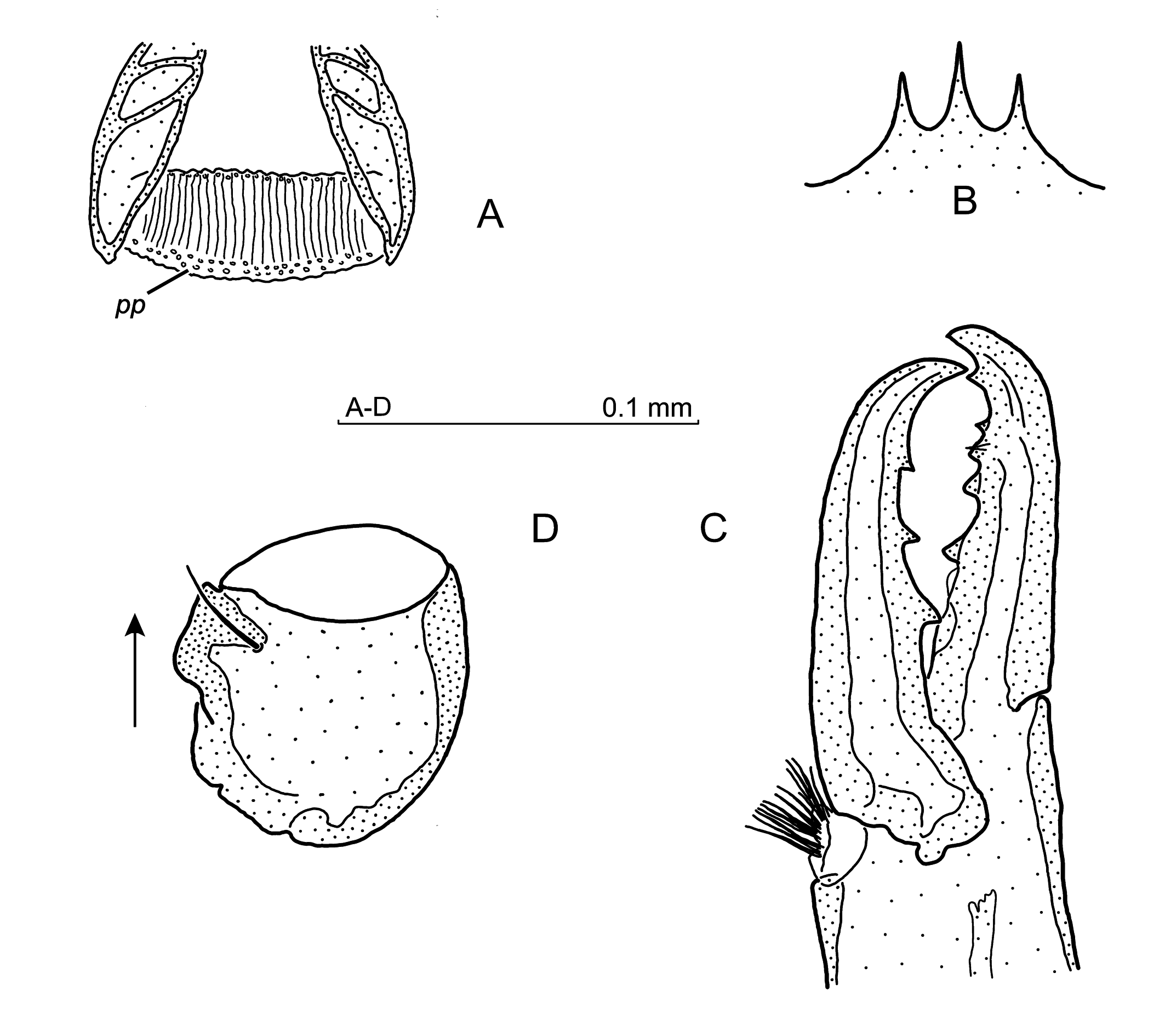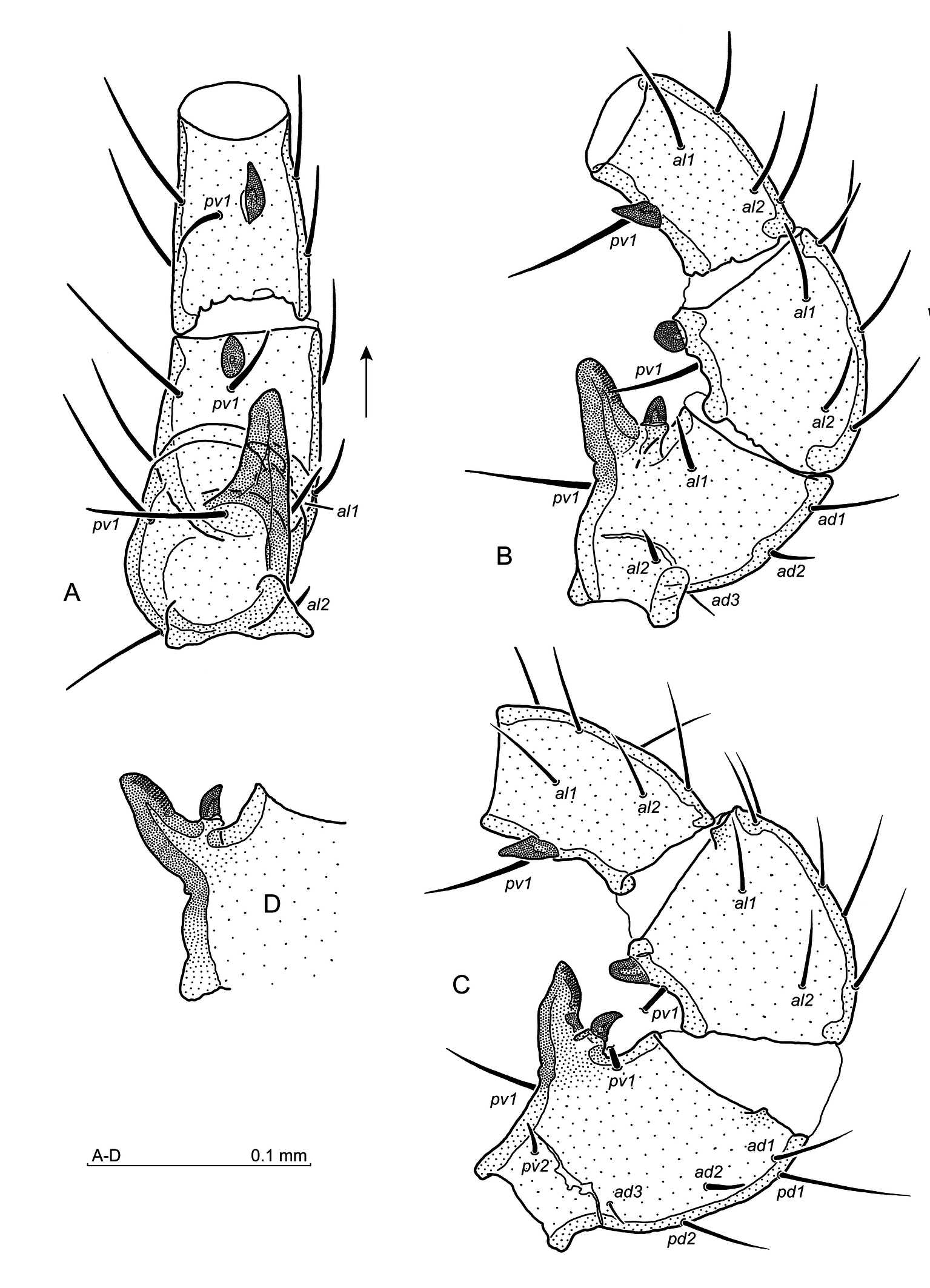 Legs — Leg II (Fig. 11A–D) spurred as follows: when viewed from the ventral side (Fig. 11A), the femoral main spur finger-shaped, with the tip cut obliquely, the axillary process pointed and curved posterolaterally. Genual spur oval, whereas the tibial one acute distally. In the lateral view (Fig. 11B–D), the femoral main spur finger-shaped and rounded terminally (Fig. 11B), or slightly arcuate and terminally tapered (Fig. 11C). The axillary process either hooked (Fig. 11C, D), or subtriangular (Fig. 11B). The genual spur rounded, the tibial one conical. Setae on leg II simple, femoral seta al1 slightly shortened, setae al2 and ad2 shortened, whereas ad3 short and needle-like. Seta pv1 on the genu located behind the spur, seta pv1 on the tibia posterolaterally to the tibial spur. Leg IV: setae av1 and pv1 on genu and tibia, as well as setae av2, av3 and pv2 on the tarsus somewhat thickened, tarsal av1 thicker than pv1. Tactile dorsal seta on Ta IV 145–160 long. Ta IV 230–238 long. Co IV and Tr IV smooth.