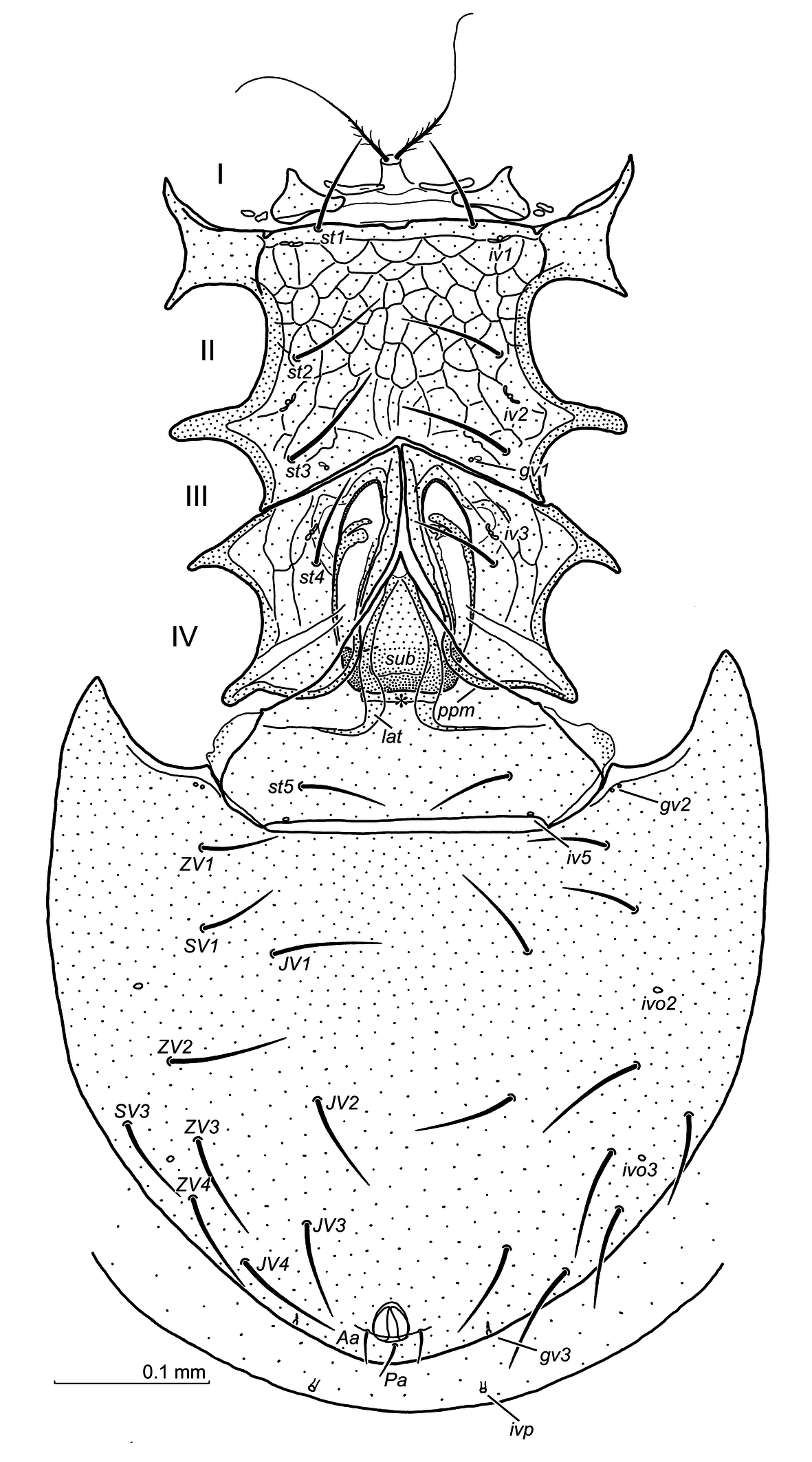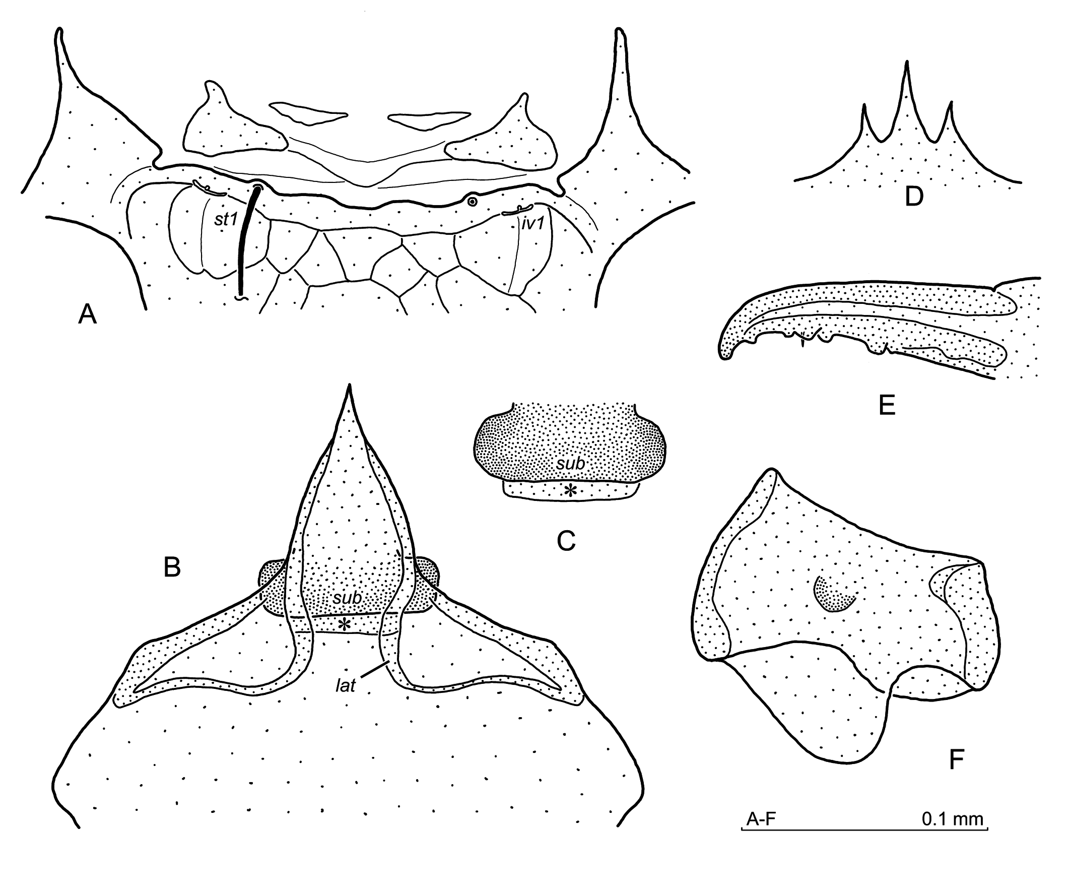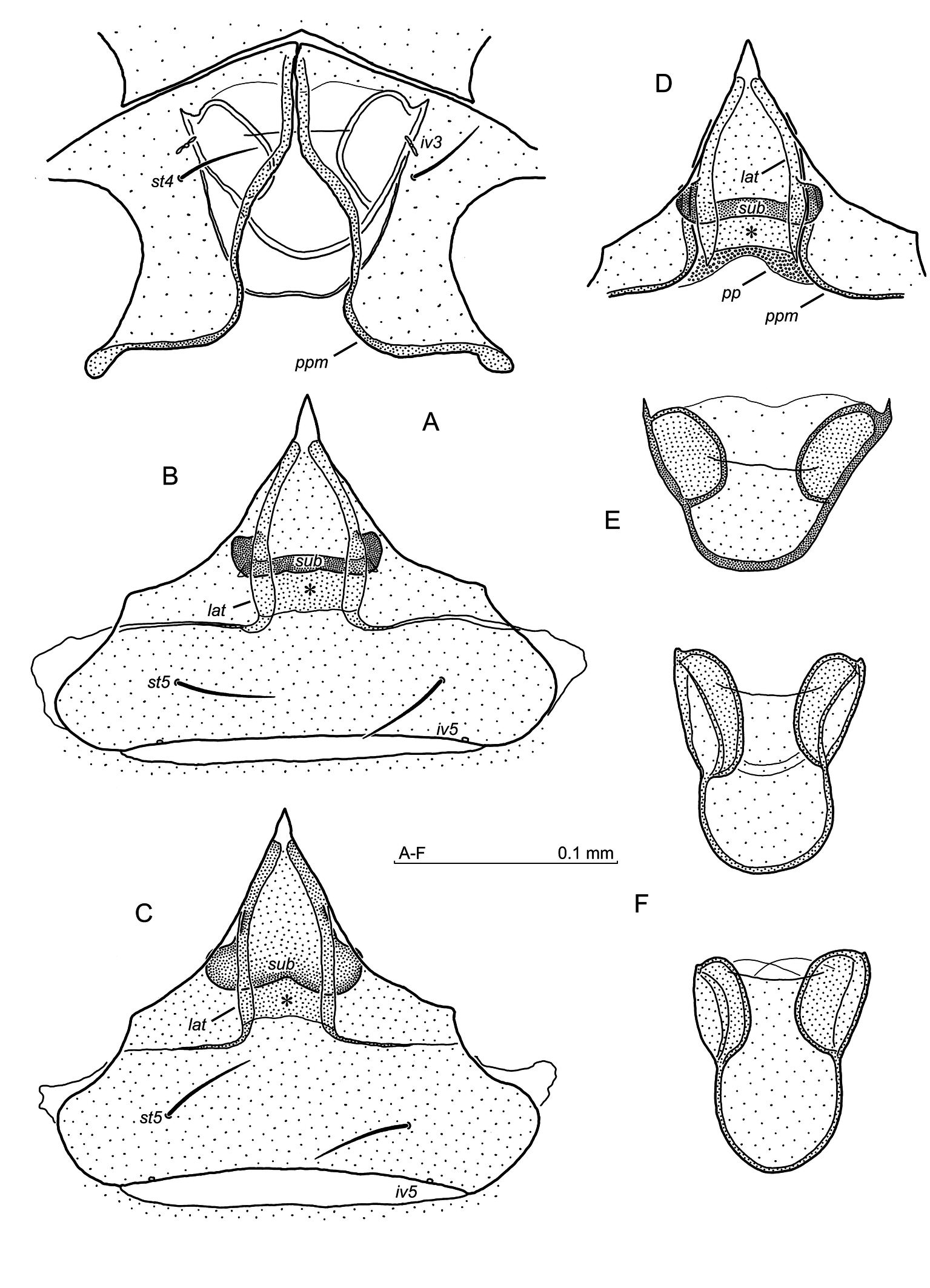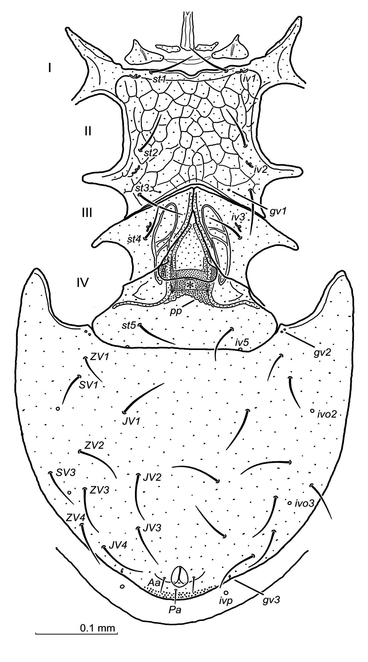 Ventral idiosoma (Fig. 12A–C) — Setae length: 65 (st1), 56 (st2), 65 (st3), opisthogaster with ten pairs of setae. Ventral setae simple, reticulation of the sternum and opisthogaster scale-like. The presternal plates (Fig. 12A) subtriangular, with a rear margin nearly straight. The area between the presternal plates and the sternum with 2–3 fine lines. The pores gv1 located in some distance from the posterior sternal margin and axially to setae st3.