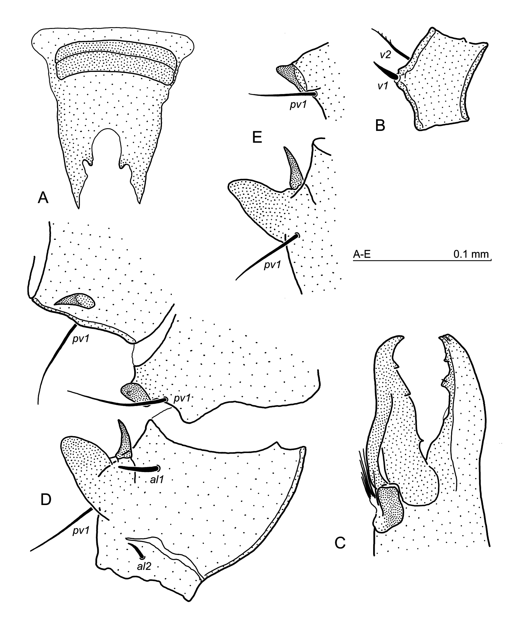 Legs — Leg II (Fig. 13D, E) in lateral view spurred as follows: the femoral main spur finger-shaped and relatively short, the axillary process narrow, sharply pointed and hooked out of article body. Genual spur located on article elevation, whereas tibial spur subtriangular and pointed terminally. Setae on leg II simple, femoral seta al1 slightly shortened, setae al2 and ad2 shortened, whereas ad3 short and needle-like. Seta pv1 on the genu located behind the spur-bearing protrusion, seta pv1 on the tibia posterolaterally to the tibial spur (Fig. 13D). Leg IV: setae pv1 on genu and av1, pv1 on tibia, as well as setae av2, av3 and pv2 on the tarsus somewhat thickened, tarsal av1 thicker than pv1. Tactile dorsal seta pd1 on Ta IV 170–183 long. Ta IV 270–275 long. Co IV and Tr IV smooth.