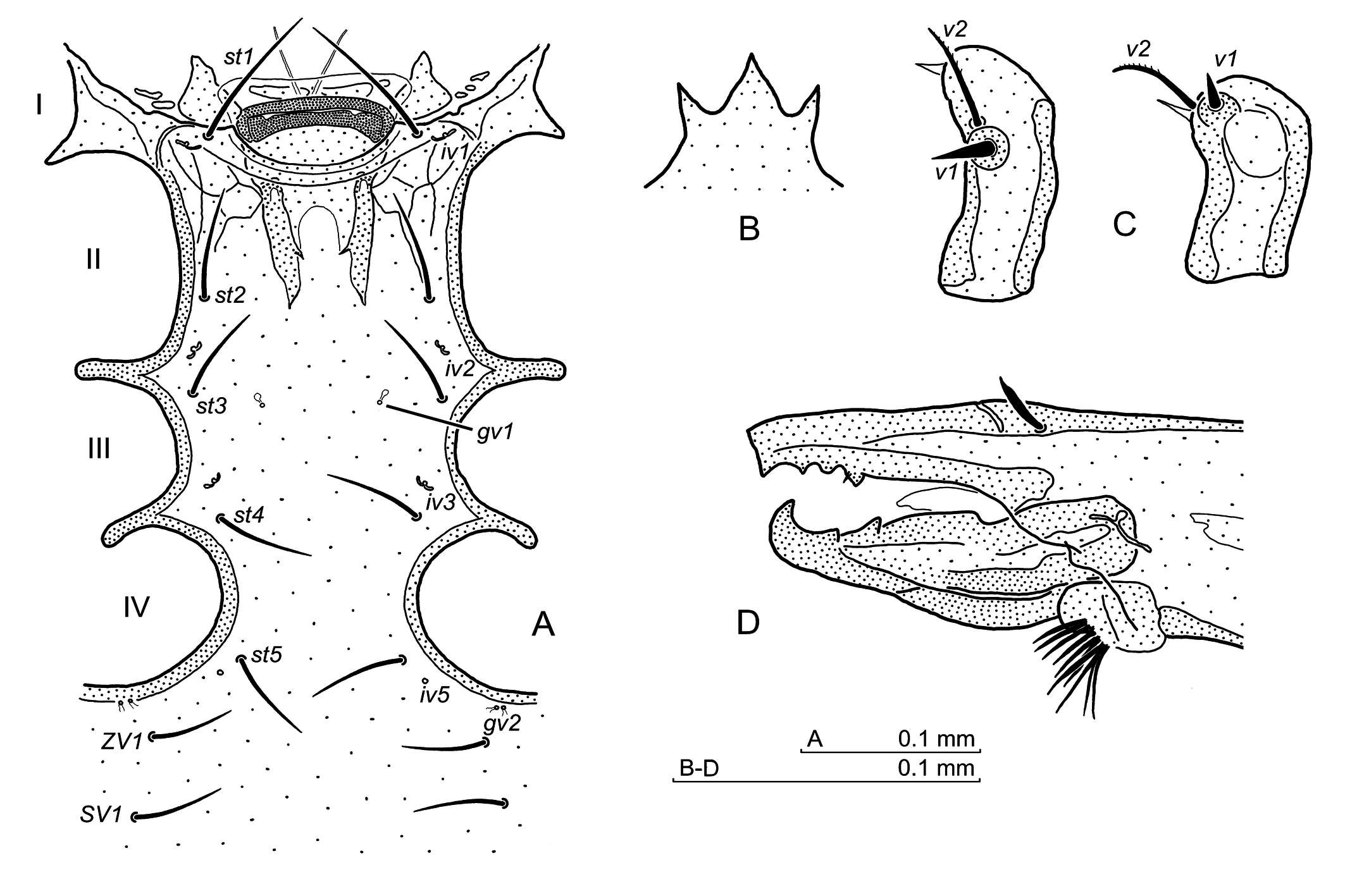 Ventral idiosoma — Sternal and opisthogastral setation like in the female. Sternal region (Fig. 4A) – the genital lamina anterior margin slightly concaved, anterolateral corners rounded. Presternal plates subtriangular with rounded posterior corners and irregular margins. The sternum with gland pores gv1 located adaxially, at the setae st3 level. Gland pore gv2 with two openings, pore iv5 between st5 and ZV1, in 1/4 distance closer to seta st5. Pores ivo2, ivo3, and gv3 well discernible.