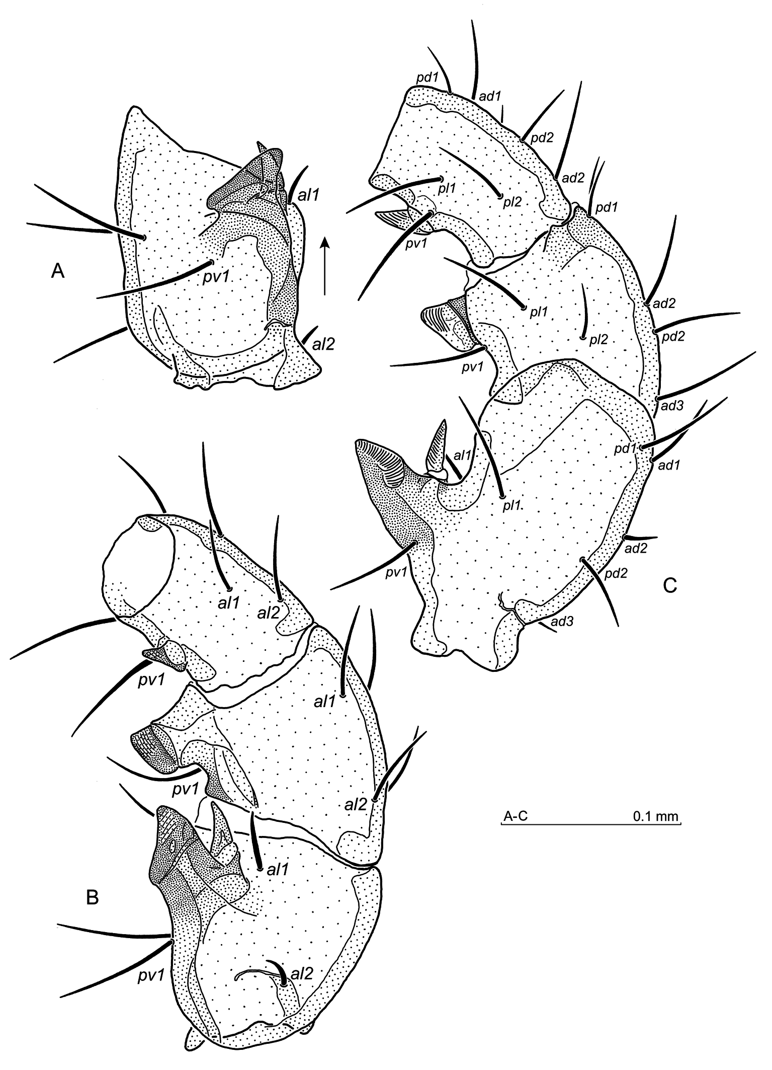 Legs — Leg II (Fig. 5A–C) spurred as follows: when viewed from the ventral side (Fig. 5A) or the anteroventral side (Fig. 5B), the femoral main spur is irregular and obliquely ended, the axillary process relatively large, wedge-shaped and curved posterolaterally. Genual and tibial spurs ventrally oval, but anteroventrally both spurs like in the lateral view: genual one subrectangular with rounded corners, located on a distinct article protrusion, and tibial spur conical, pointed distally. From the lateral view (Fig. 5C), the femoral main spur subtriangular and pointed apically, the axillary process narrow, wedge-shaped and straight. All spurs and axillary process striped. Setae on leg II simple, femoral seta al1 slightly shortened, setae al2 and ad2 shortened, whereas ad3 short and needle-like. Seta pv1 on the genu located just behind the spur-bearing protrusion, seta pv1 on the tibia posterolaterally to the tibial spur. Leg IV: setae pv1 on genu and av1, pv1 on tibia, as well as setae av2, av3 and pv2 on the tarsus somewhat thickened, tarsal av1 thicker than pv1. Tactile dorsal seta on Ta IV 150–167 long. Ta IV 245–260 long. Co IV and Tr IV smooth.