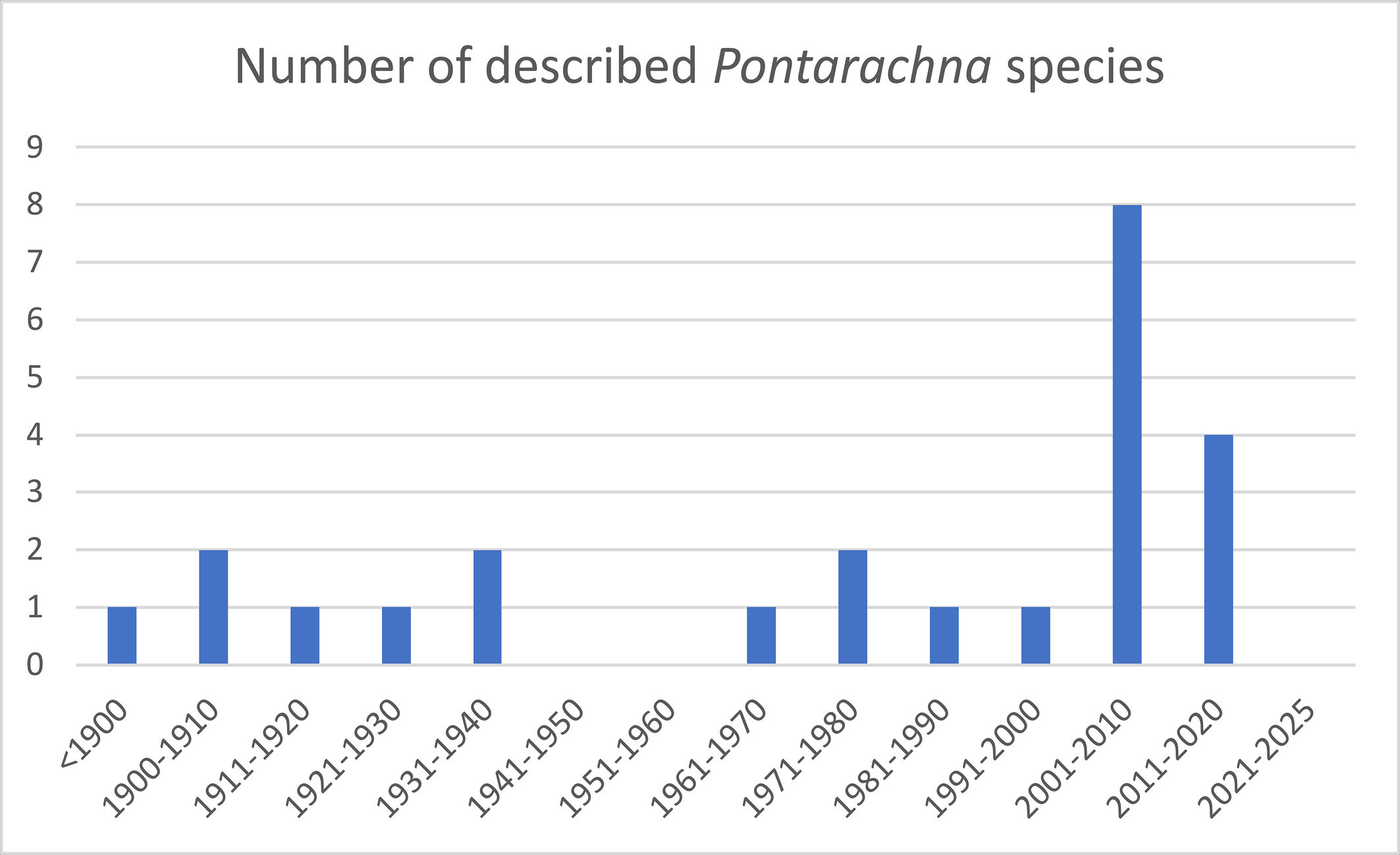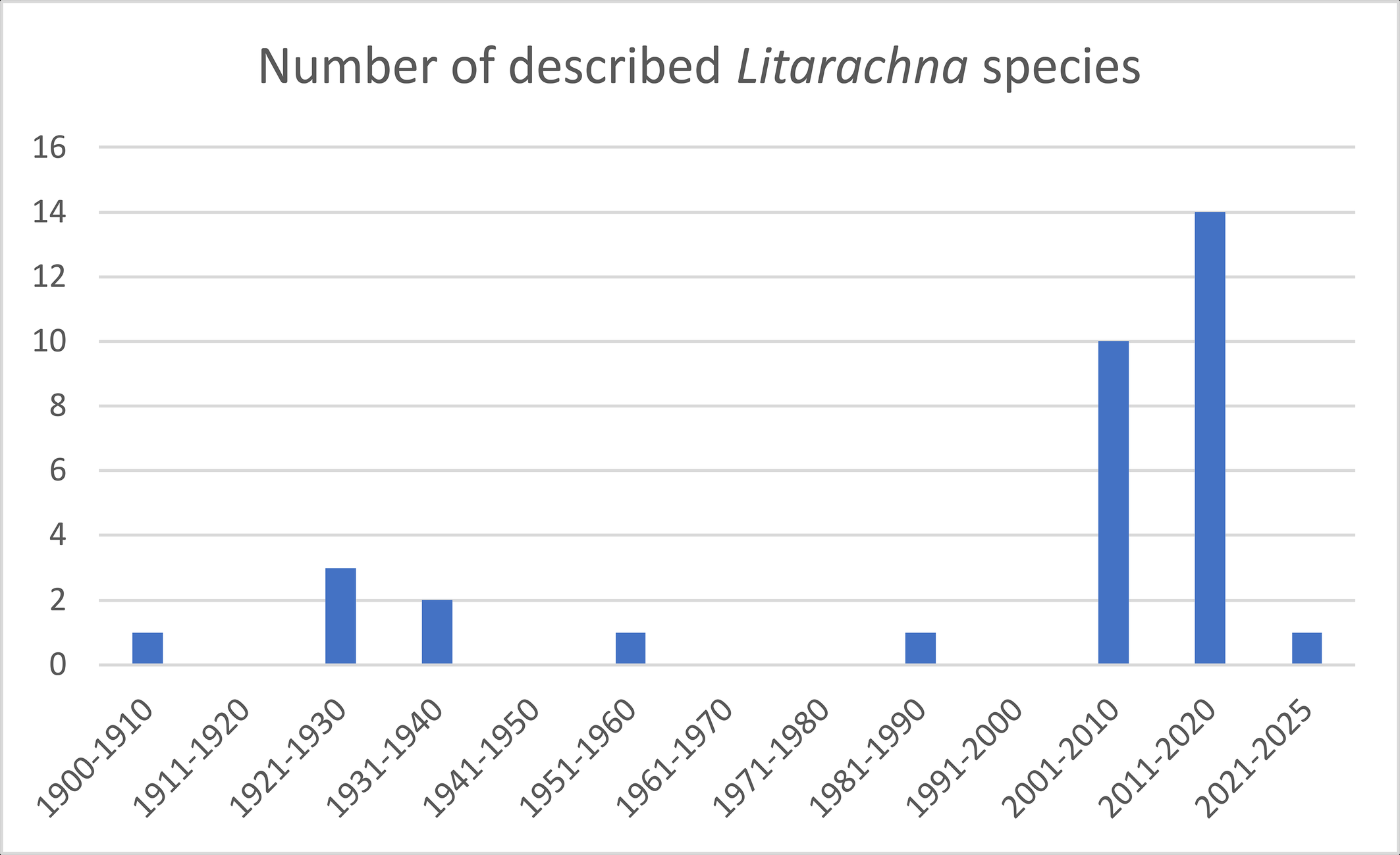 Within the Pontarachnidae two genera are known, i.e. Pontarachna Philippi, 1840 and Litarachna Walter, 1925. Worldwide 34 Litarachna species and 24 Pontarachna species are known (Asadi et al. 2019, Chatterjee et al. 2019; Pešić et al. 2012, 2019, 2020; Montes-Ortiz et al. 2021). Most Litarachna species were described in the 21th century (Figure 1), the same applies to Pontarachna (Figure 2). A list of Litarachna and Pontarachna species can be found in the World Register of Marine Species (WORMS https://www.marinespecies.org/