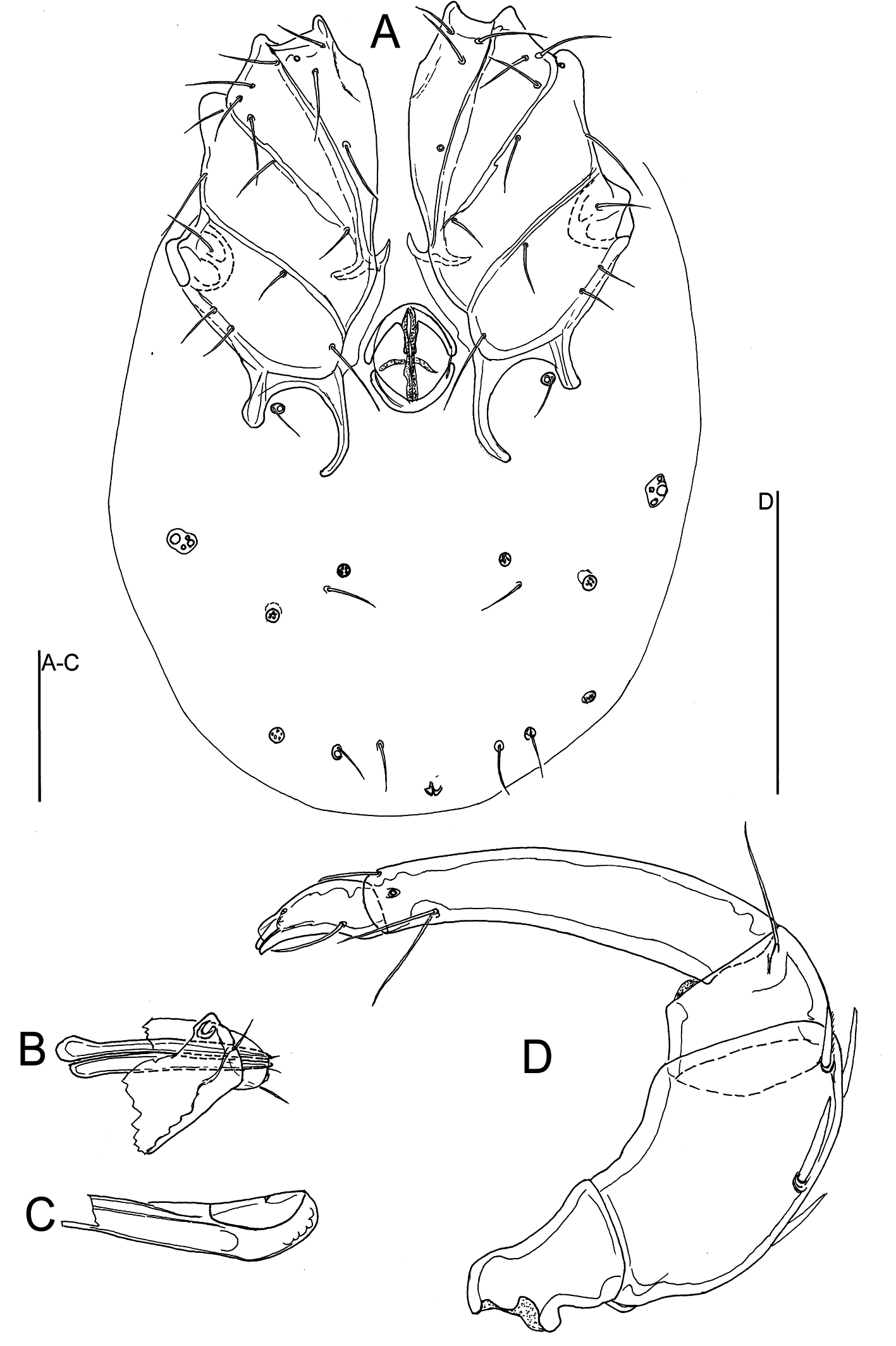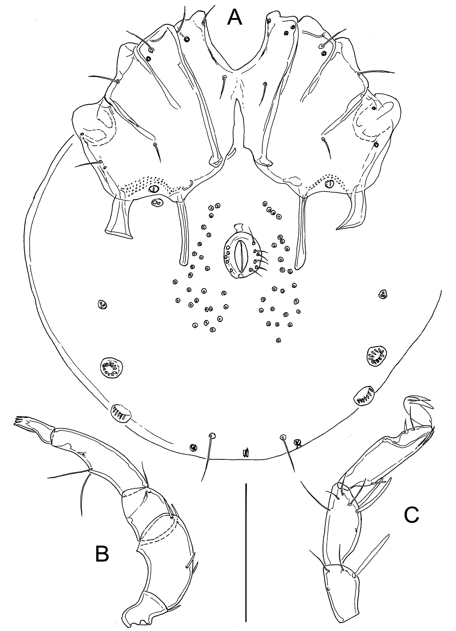 Deutonymph — As in adults but lacking a genital field. Idiosoma 291 long and 225 wide. Coxal field 127 long and 184 wide. Gnathosoma 94 long; chelicera 181 long; palp as in adults.