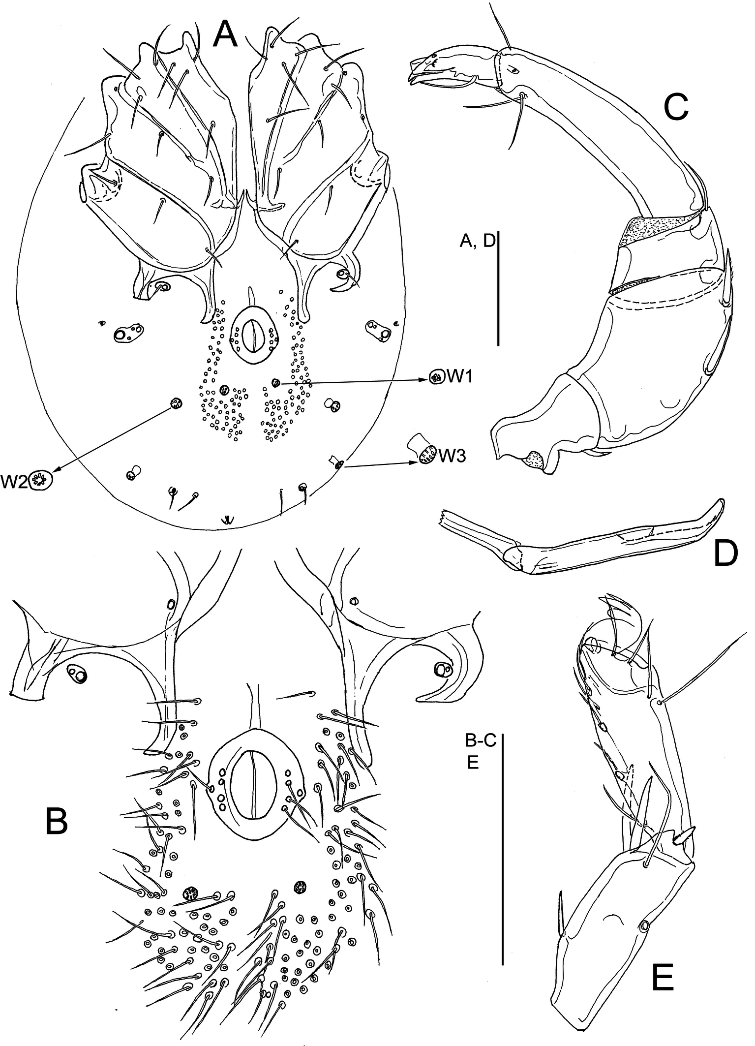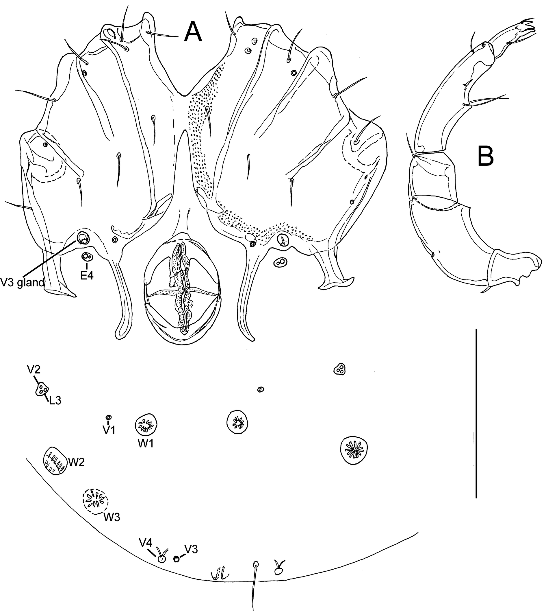 Description — General features — Cx-I separated medially; suture lines Cx-I/II and Cx-III/IV complete, suture line Cx-II/III incomplete; posterior margin of Cx-IV with two pairs of apodemes of moderate length, the medial longer than the lateral ones; a pair of small platelets with Cxgl-4 and associated setae free in the integument between the posterior apodemes of Cx-IV; posterior to the genital field a pair of platelets with three pores and a glandularium-like structure, and three pairs of small wheel-like acetabula, with relatively few radiating spokes; excretory pore unsclerotized, near posterior end of idiosoma (Figures 6A, 7A). P4 slightly bowed, shorter than P2+3, ventral margin without a tubercle. Chelicera with a straight, pointed claw. Number of swimming setae: I-Leg-5, 1 (short; as illustrated in Figure 6E) II-Leg-5, 1; III-Leg-4, 1; III-Leg-5, 1; IV-Leg-4, 1; IV-Leg-5, 2. Male: Medial apodemes of Cx-IV extending beyond the anterior margin of genital field, genital field consisting of a sclerotized ring with five pairs of setae, one seta more laterally than the four other setae; many perigenital setae (60-70 pairs) free in the integument around the genital field (Figure 6B). Female: Medial apodemes of Cx-IV extending to the posterior margin of genital field, pre- and post-genital sclerites bowed (Figure 7A).