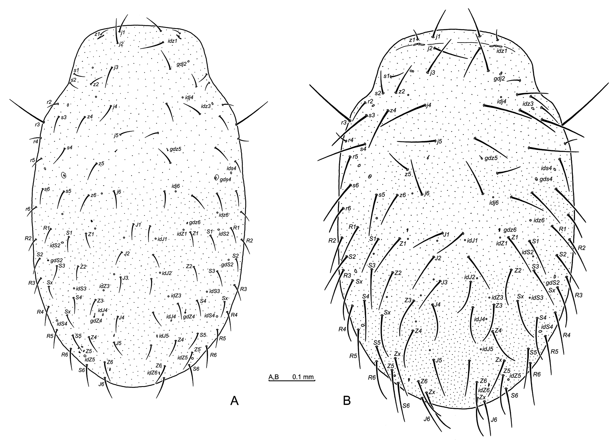 Dorsal side: podosomal setae (j, z, s, r), opisthosomal regular setae (J, Z, S, R) and supplementary setae (Sx, Zx), podosomal pores (idj, idz, ids) and opisthosomal pores (idJ, idZ, idS), podosomal gland openings (gdj, gdz, gds) and opisthosomal gland openings (gdS, gdZ);