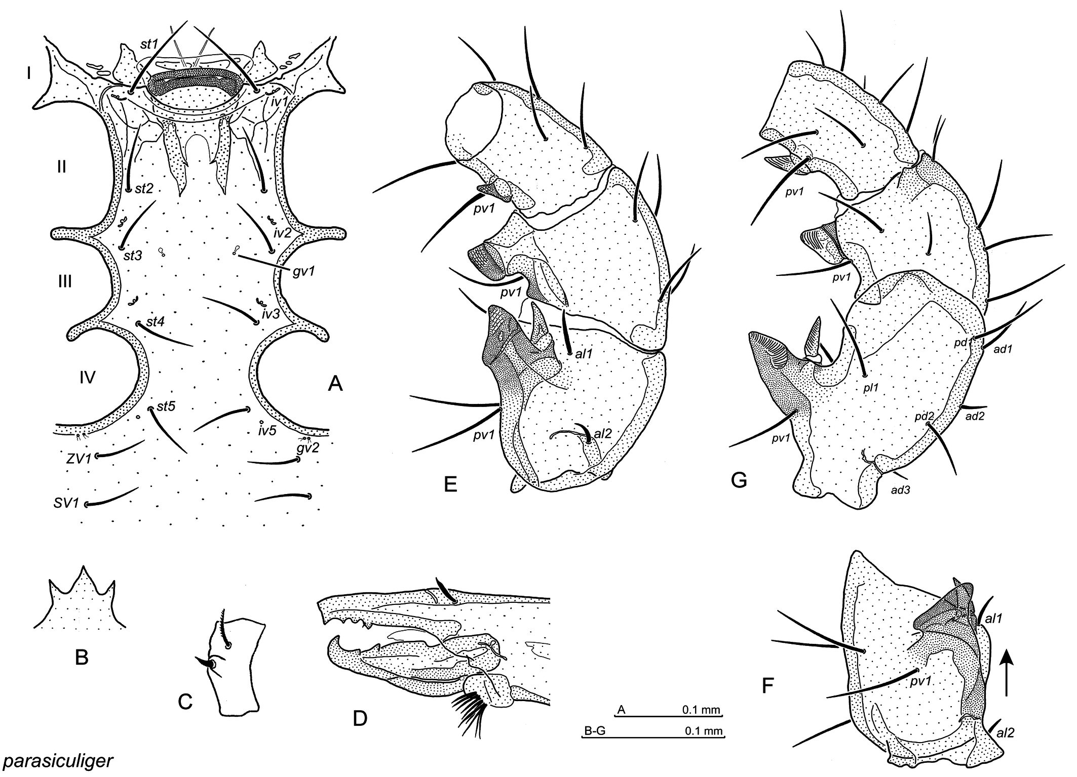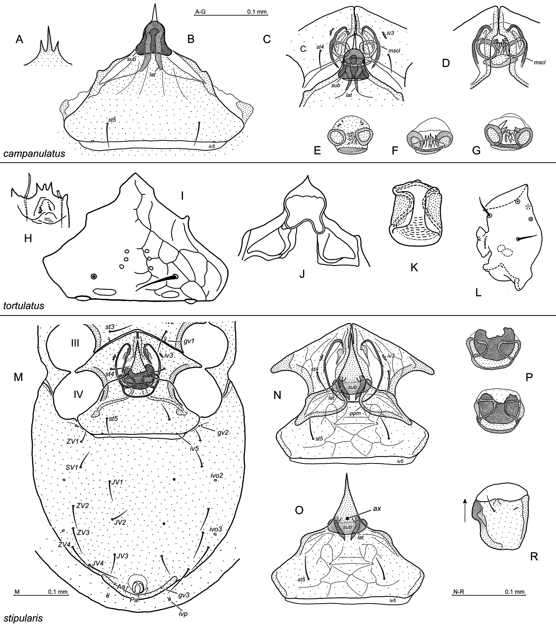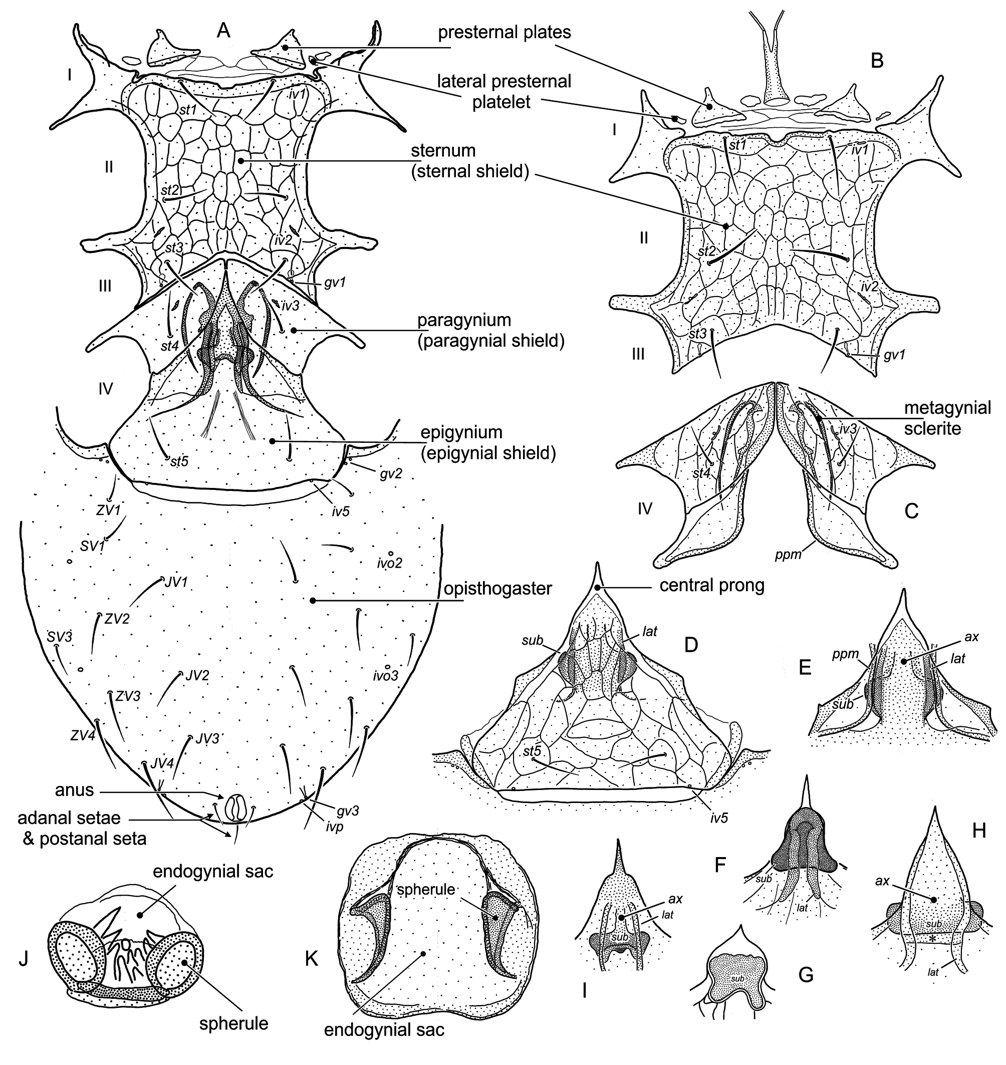 Ventral side: st1–st3 sternal setae, st4, st5 paragynial and epigynial setae, respectively (female), st1–st5 sternal setae (male), JV, ZV, SV opisthogastral setae, Aa adanal seta, Pa postanal seta, gv1, gv2, gv3 gland openings, iv1–iv5, ivo2, ivo3, ivp pore openings.