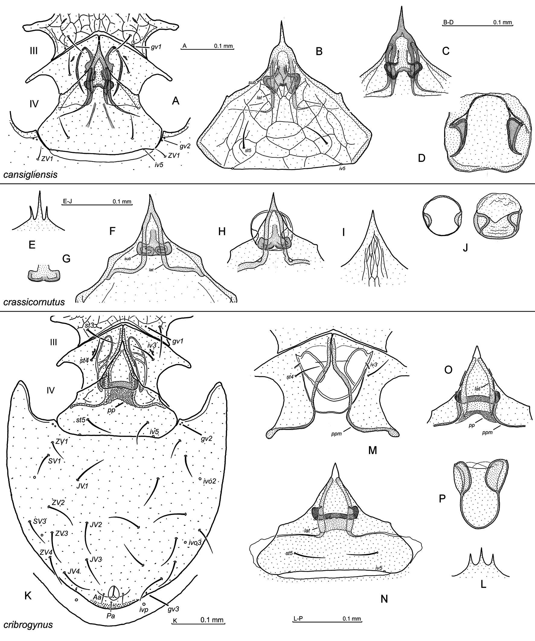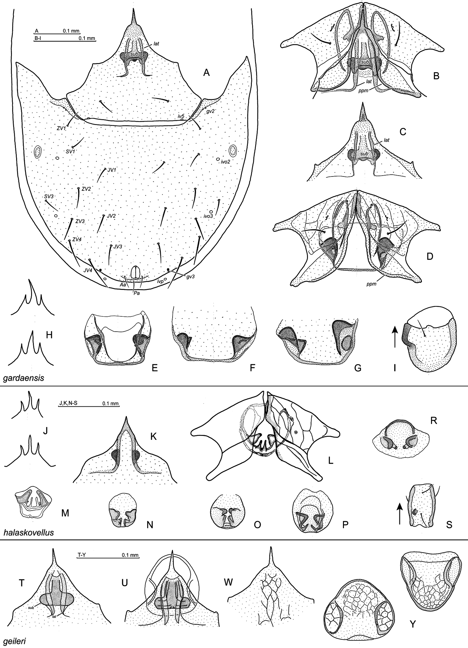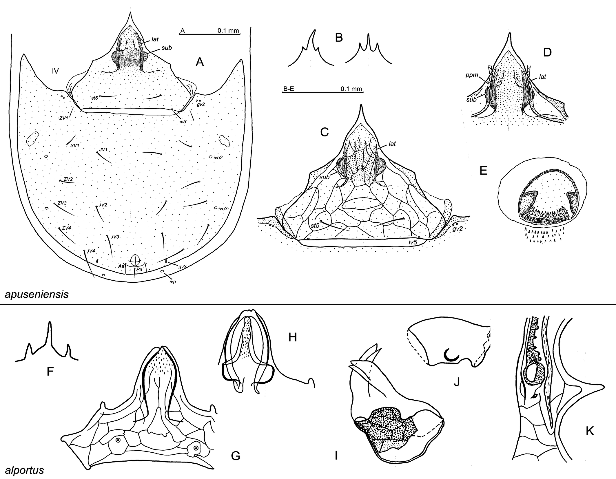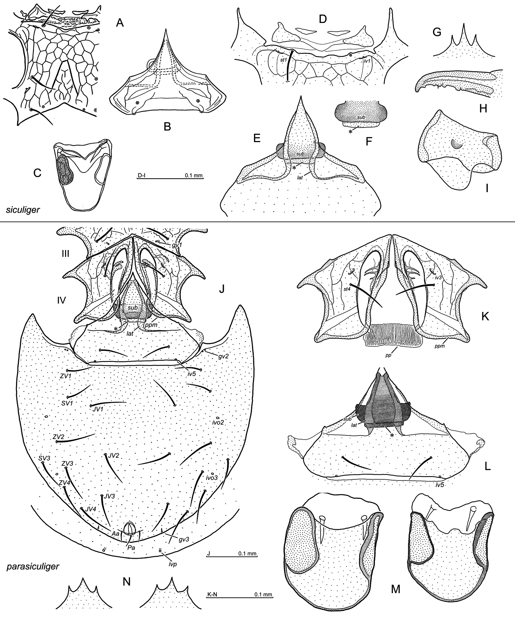 Ventral side: st1–st3 sternal setae, st4, st5 paragynial and epigynial setae, respectively (female), st1–st5 sternal setae (male), JV, ZV, SV opisthogastral setae, Aa adanal seta, Pa postanal seta, gv1, gv2, gv3 gland openings, iv1–iv5, ivo2, ivo3, ivp pore openings.