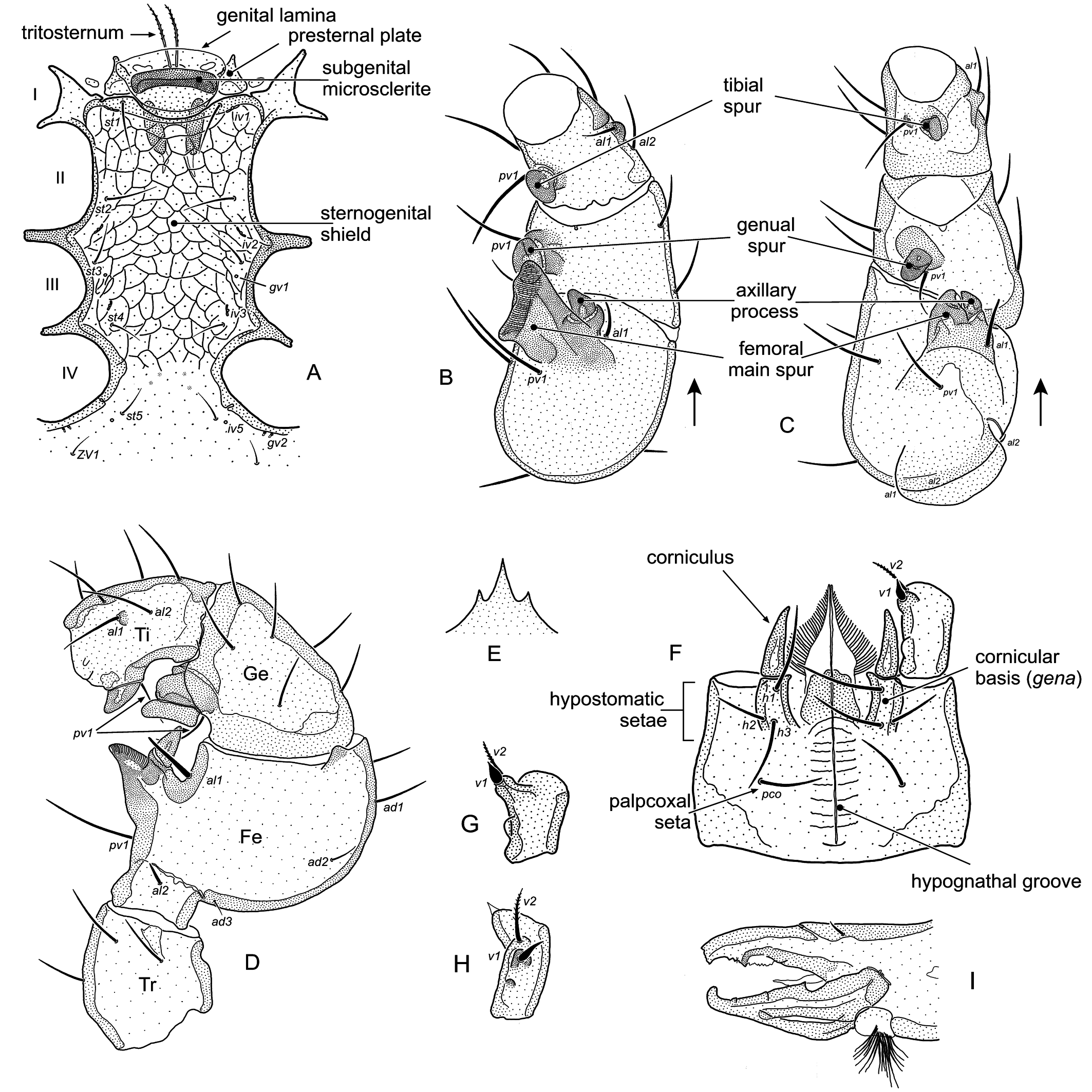 Palptrochanter ventral setae (v1, v2), hypostomatic setae (h1–h3), palpcoxal seta (pco).
