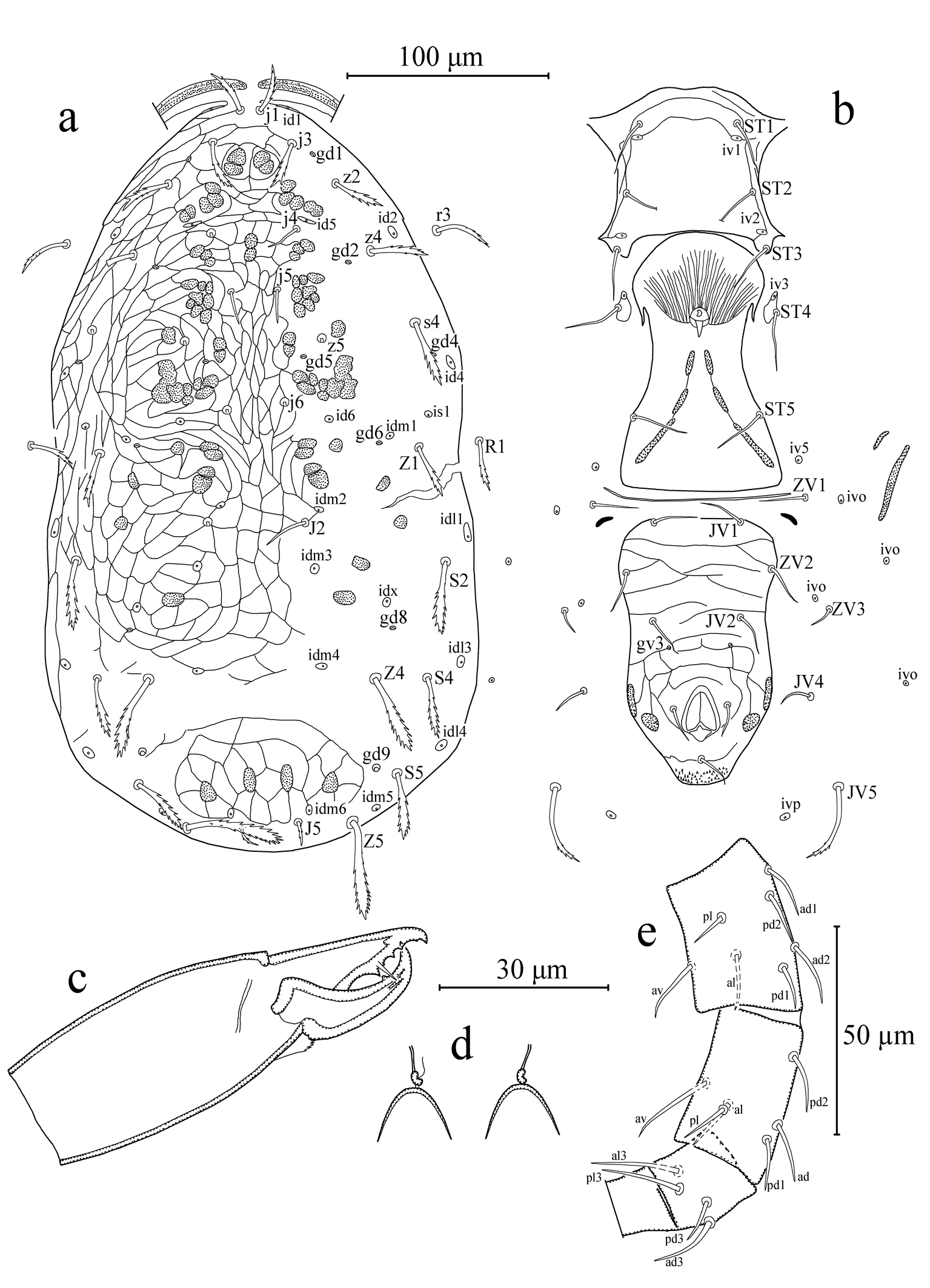 Dorsal idiosoma (Figures 1a, 2a). Dorsal setal pattern 10A: 9B (r3 and R1 off shield). Dorsal shield sclerotized, strongly reticulated, oval with slight waist at level of Z1; with seven pairs of solenostomes (gd1, gd2, gd4, gd5, gd6, gd8, and gd9); 16 pairs of visible poroids (sensillae) (id1, id2, id4, id5, id6, idm1, idm2, idm3, idm4, idm5, idm6, idx, is1, idl1, idl3, and idl4). Muscle marks (sigilla) mostly visible on podosoma. Length of dorsal shield 360, width at level of s4 196, width at level of S2 210. Dorsal setae clubbed, strongly serrated, except j4, j5, and probably j6 and z5 simple, smooth. Measurements of dorsal setae as follows: j1 24, j3 25, j4 17, j5 17, j6 (broken), J2 (broken), J5 12, z2 27, z4 30, z5 (broken), Z1 27, Z4 41, Z5 49, s4 33, S2 35, S4 30, S5 32, r3 28, and R1 25.