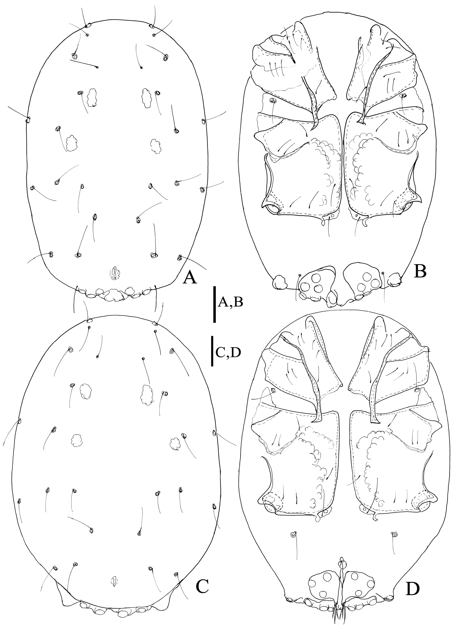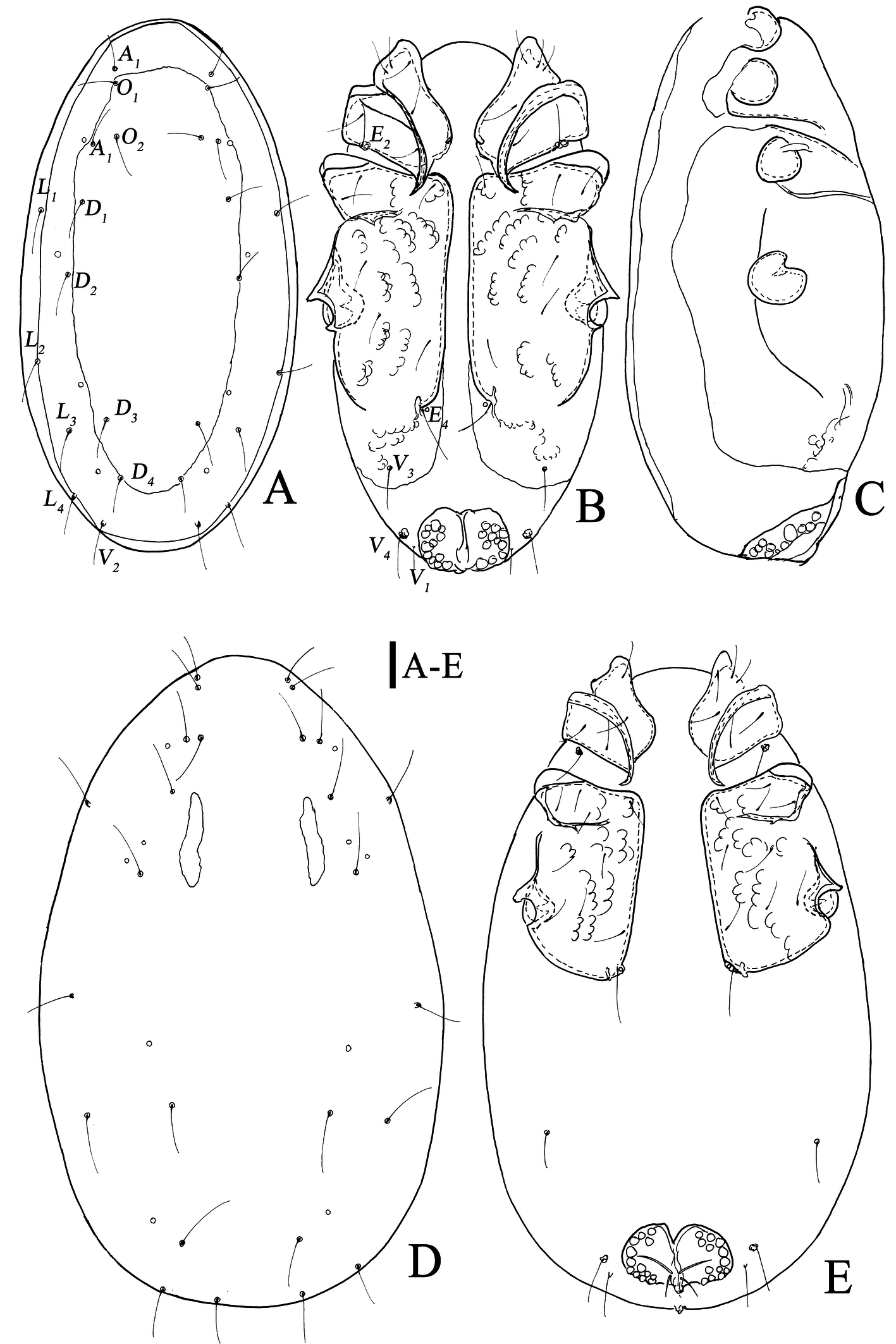 Description — male: integument smooth and soft, dorsum with two pairs of round dorsalia, L4 inflated. Dorsoglandularia without enlargement (Figure 1A). Coxal plates in four groups, interspace between Cx-II and Cx-III narrow, posterior apodemes of the ACG extend only to the medial side of the anterior margin of Cx-III, the intermedian distance of Cx-IV close to zero, posterior projection of Cx-IV hook-shaped (Figure 1B). Acetabular plates terminally located, with poorly developed sclerotized margins. One pair of stout genital setae is situated on the anterior part of acetabular plates. Three pairs of Ac are arranged dorsally and ventrally, separated by two pairs of short, stout setae in the median region. The margin of acetabular plates surrounded by seven pairs of fine genital setae. Ac relatively small, usually shorter than the distance between adjacent Ac, and occupy less than half of acetabular plates (Figure 2E).