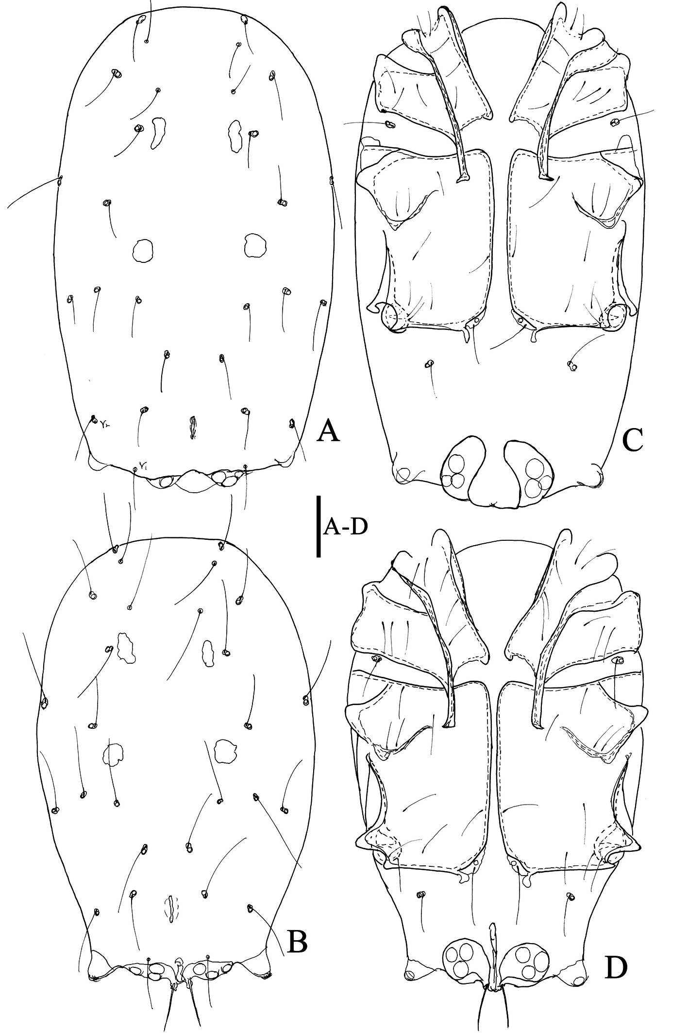 Description — male: integument smooth and soft, dorsum with two pairs of dorsalia, dorsoglandularia without enlargement, excretory pore weakly sclerotized and situated below a line connecting V2 and L4 (Figure 4A). Coxal plates in four groups, interspace between Cx-II and Cx-III narrow, posterior apodemes of the ACG extend only to the medial side of the anterior margin. of Cx-III, the intermedian distance of Cx-IV close to zero, posterior projection of Cx-IV hook-shaped (Figure 4B). Acetabular plates terminally located, without obvious sclerotized margins. Ac relatively small, usually shorter than the distance between adjacent Ac, and occupy less than half of acetabular plates (Figure 5E).