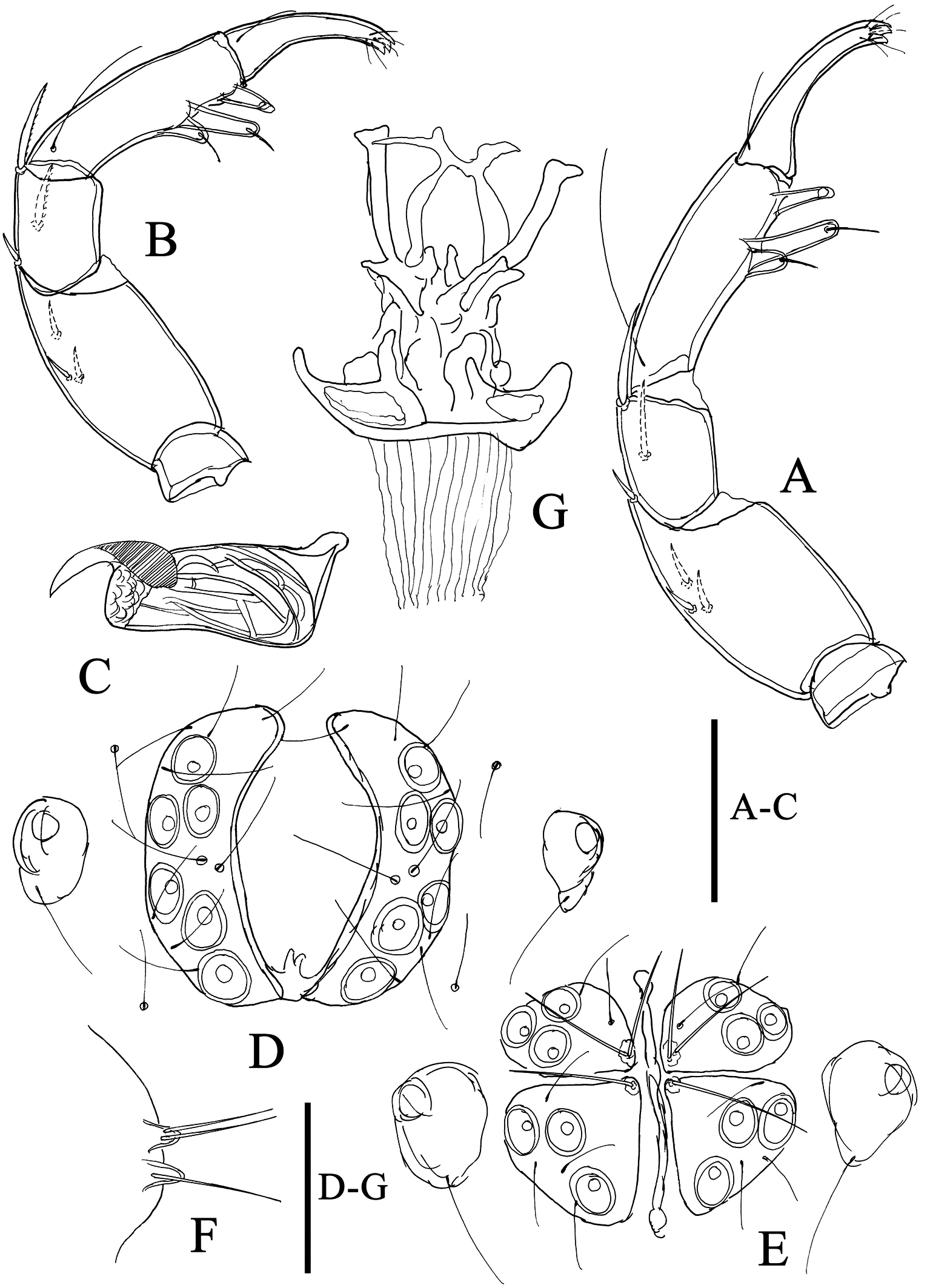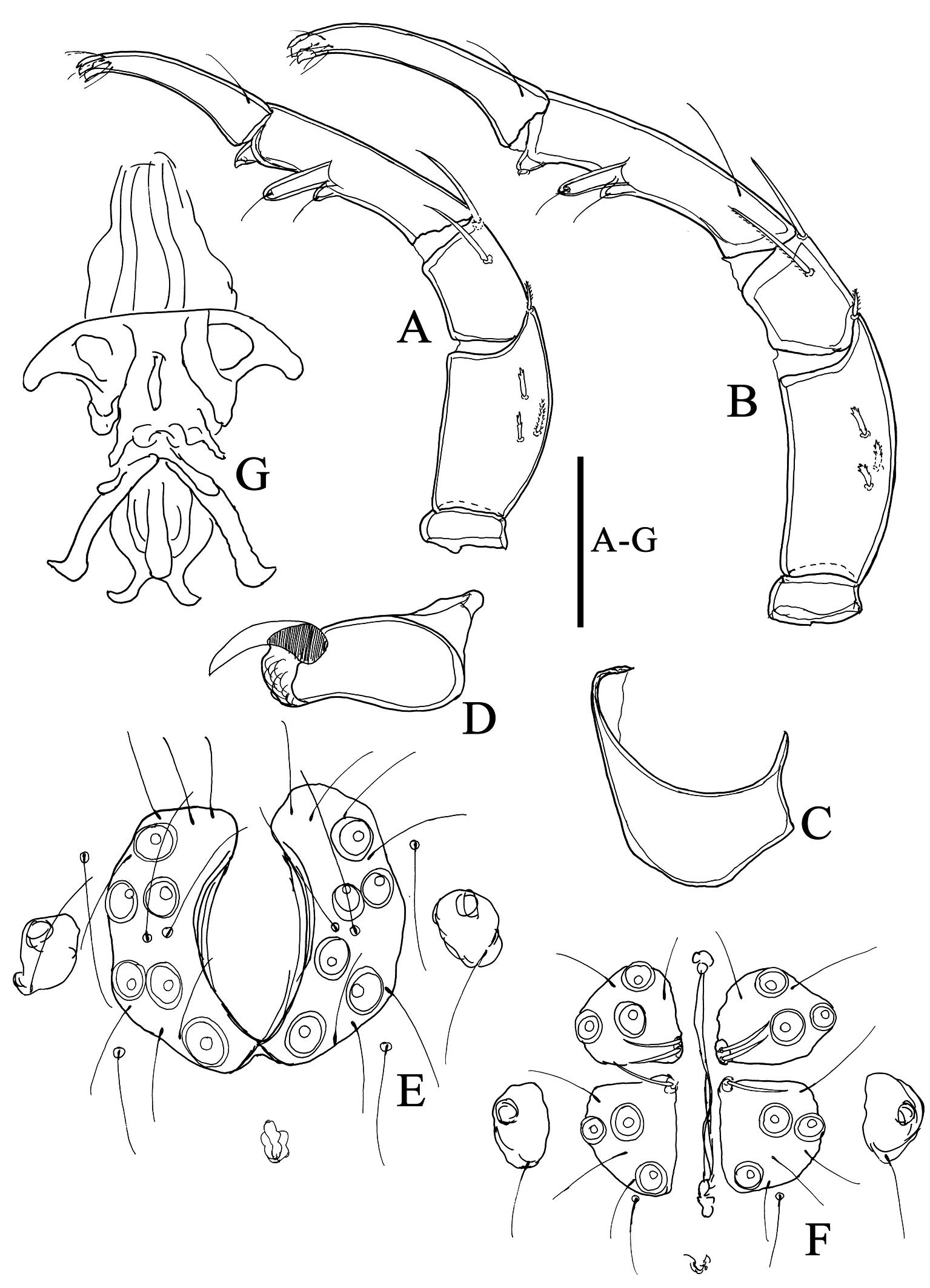 All holotypes and paratypes will be deposited in the Institute of Entomology, Guizhou University, Guiyang, P. R. China (GUGC) (Zhang 2018). The method and terminology used follow Ding et al. (2019), ratios are calculated according to Valdecasas (2022). The following abbreviations are used: asl= above sea level, A1 = preantennal glandularia, A2 = postantennal glandularia, ACG = anterior coxal group (Cx-I + Cx-II), Ac= acetabula, Cx-I–IV = coxae I–IV, D1 –D4 = dorsoglandularia 1–4, C1 –C4 = coxoglandularia 1–4, H = altitude, I-L-1–6 = first–sixth segment of the first leg, L1 –L4 = lateroglandularia 1–4, L = length, LA= length between anterior end of Cx-I and posterior end of posterior apodeme of ACG, LP = length between anterior margin of Cx-III and posterior end of posterior apodeme of Cx-IV, O1 = preocularia, O2 = postocularia, P-1–P-5 = first–fifth segment of palp, PCG = posterior coxal group (Cx-III + Cx-IV), V1 –V4 = ventroglandularia 1–4, W = width. All measurements are given in μm, palp and leg segments are measured along the dorsal margins. Numbers are given as male/female or adult.