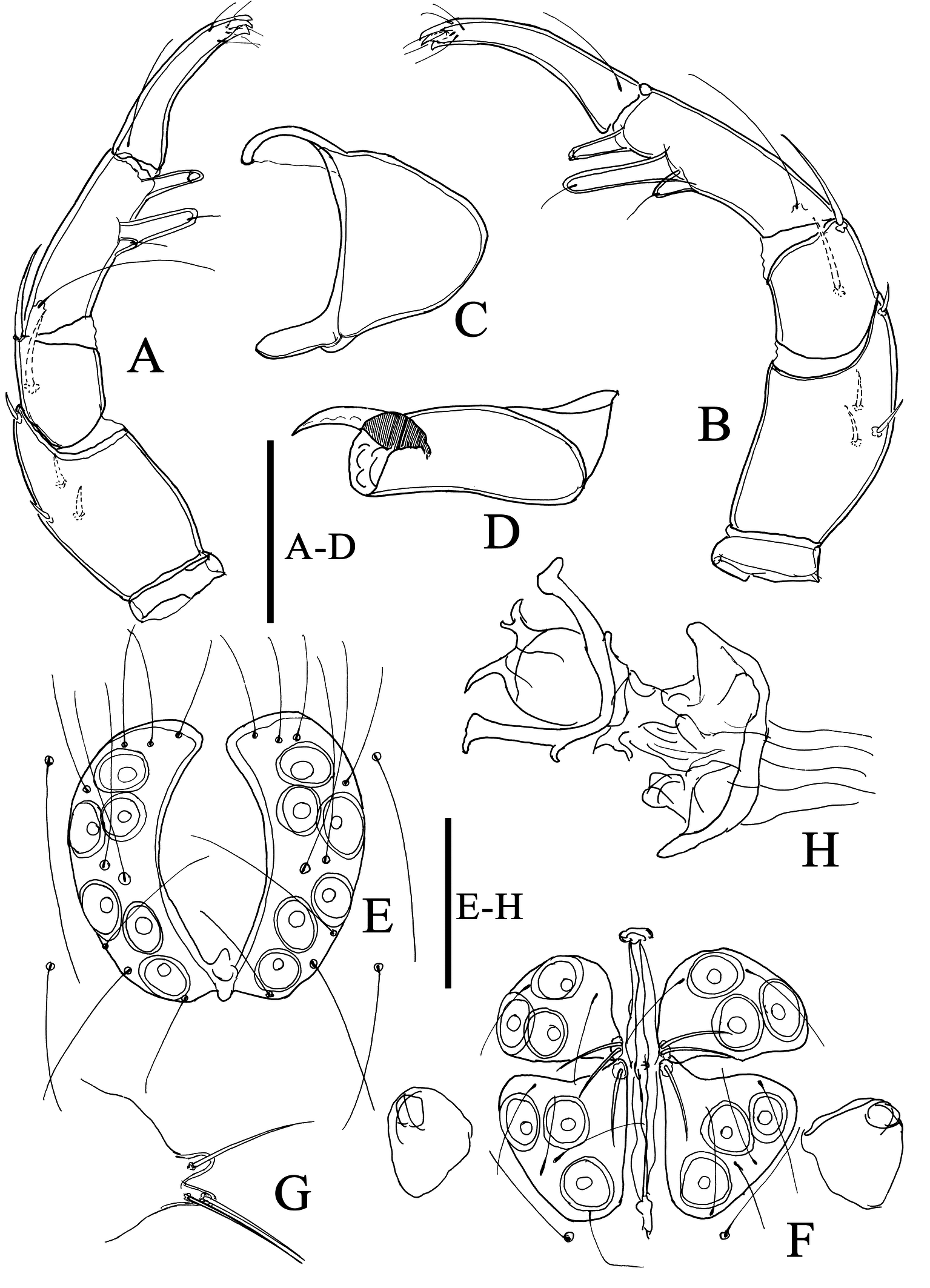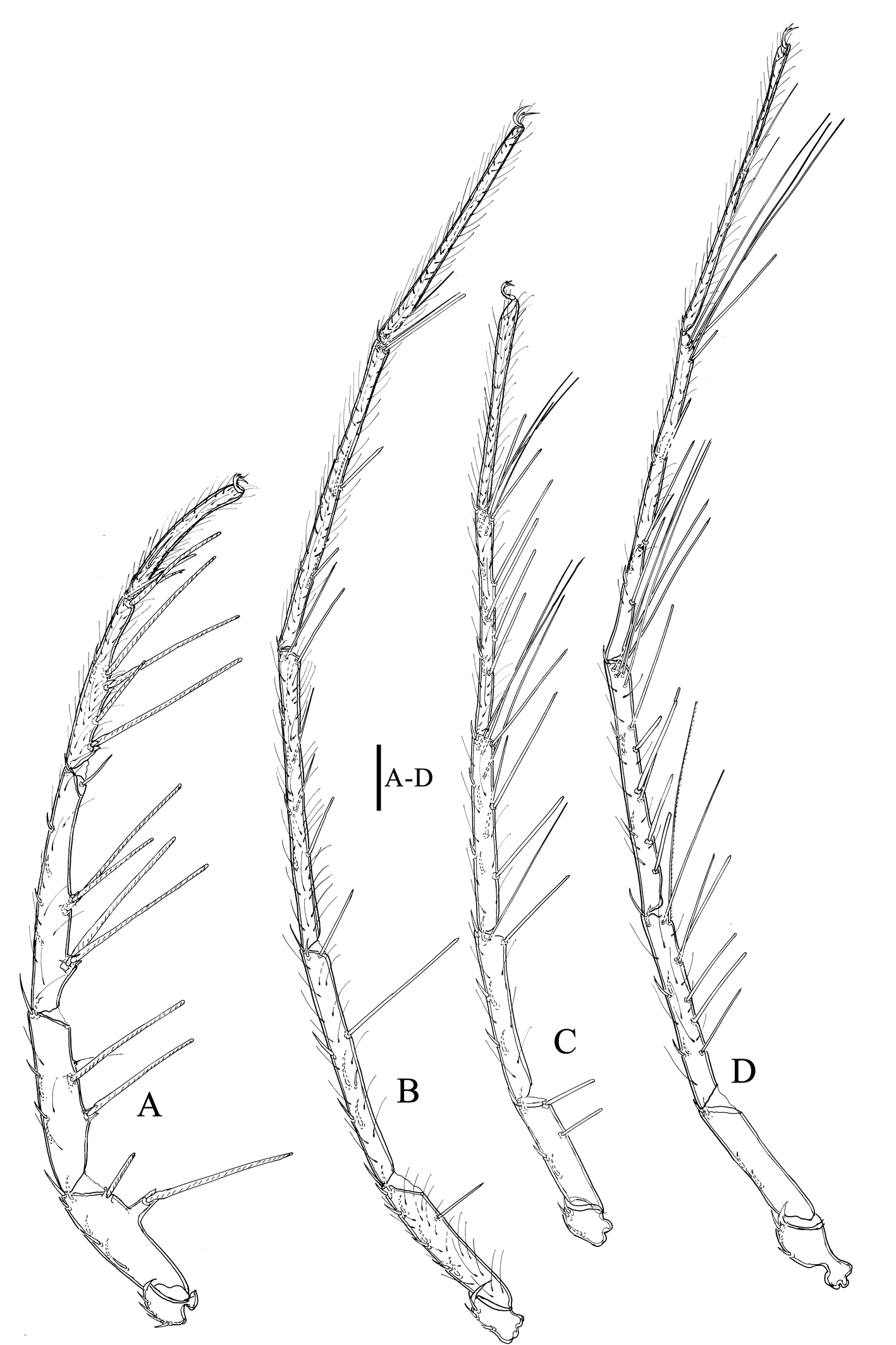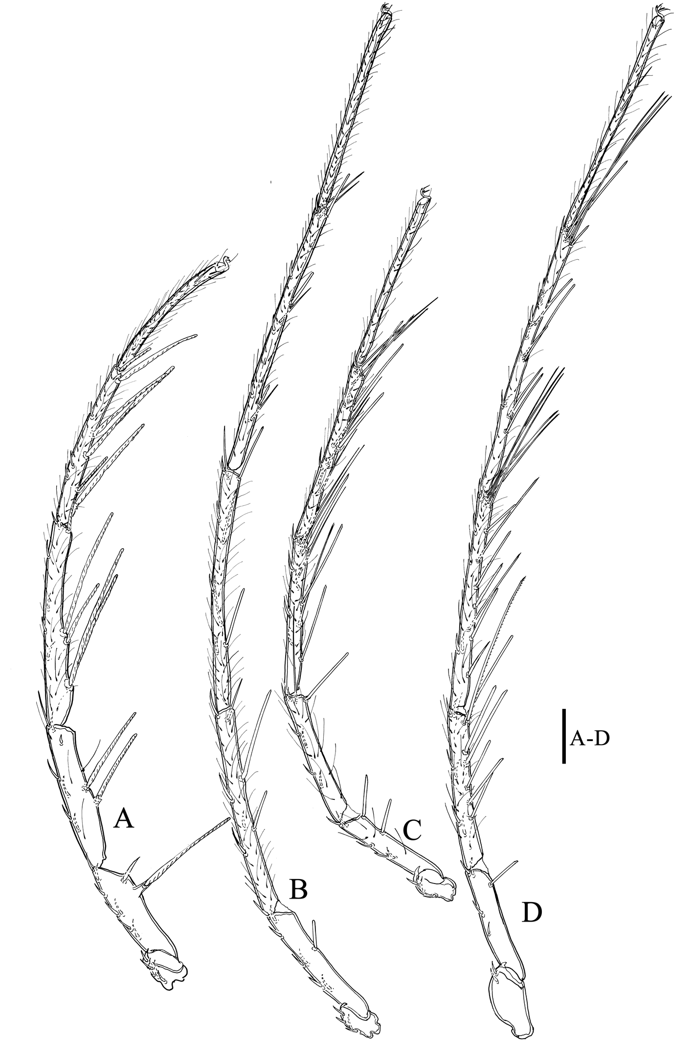 Palp generally slender, venter of P-2 slightly humped. P-3 with two stout setae of equal length, both shorter than P-3, P-4 with three elongate protrusions on its posteroventral surface, the lateral protrusion longer than the terminal one, and the ventral protrusion short and much shorter than the terminal one, with the distal protrusion bearing a blunt projection at its tip (Figure 8B). Dorsal apodeme of gnathosoma lanceolate and as long as ventral apodeme, and the ventral protrusion smooth at its base (Figure 8C). Chelicera with a well-developed claw (Figure 8D). I-L-2–6 ventrally each with movable, large, blunt setae. II-L-4, -5 ventrodistally with one and two short swimming setae, respectively. III-L-3, -4, -5 distally with one, three, three swimming setae, respectively. IV-L-3, -4, -5 with one, three, three swimming setae, respectively. IV-L-6 ventrally with three heavy setae (Figure 9A–D).