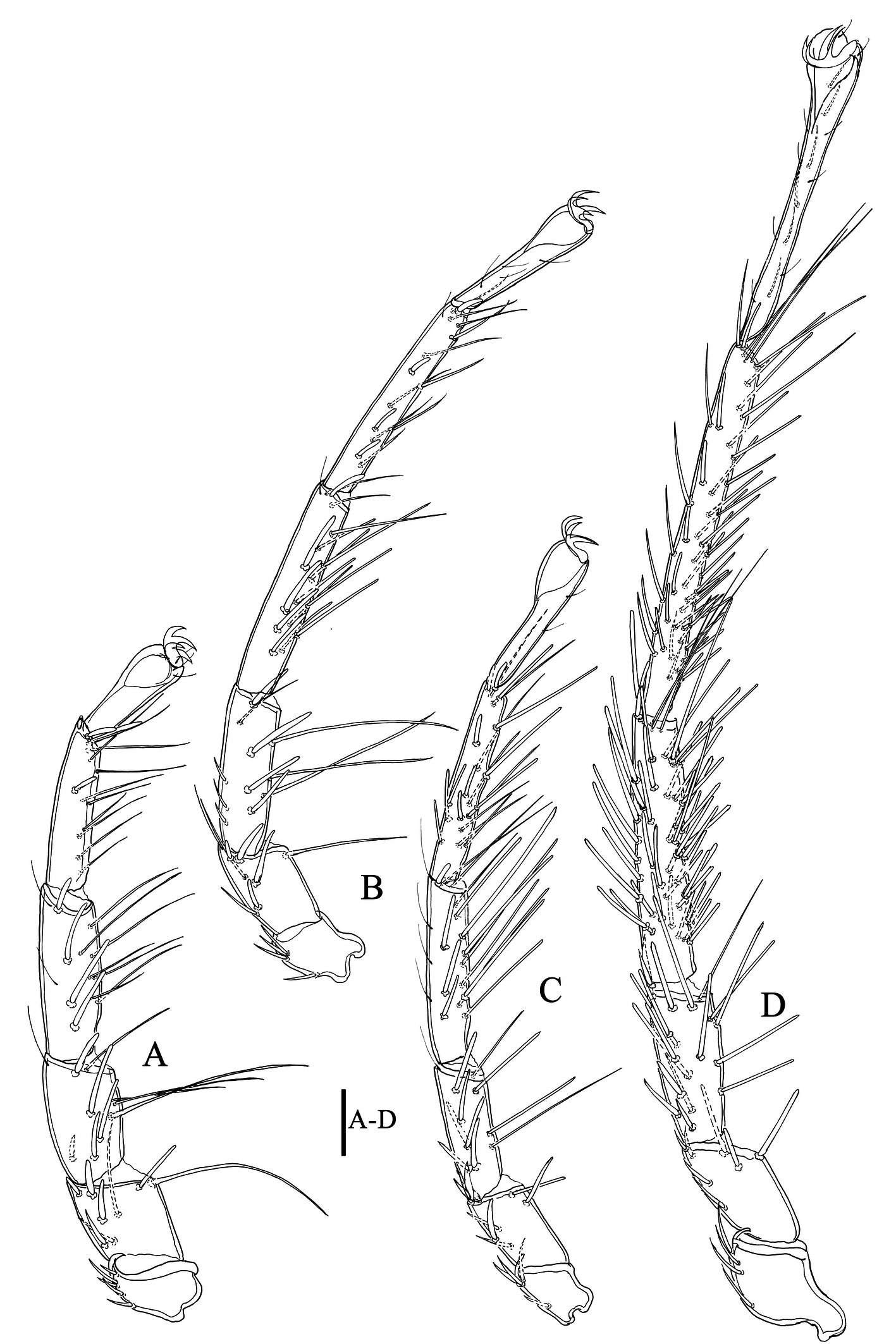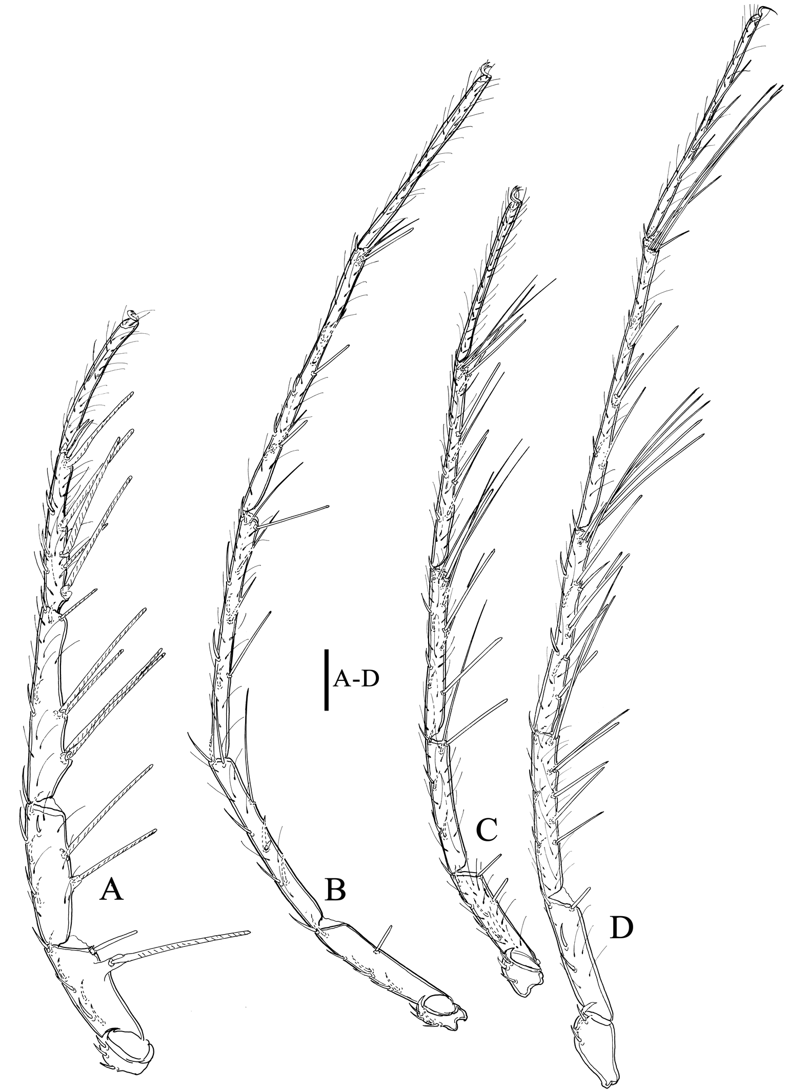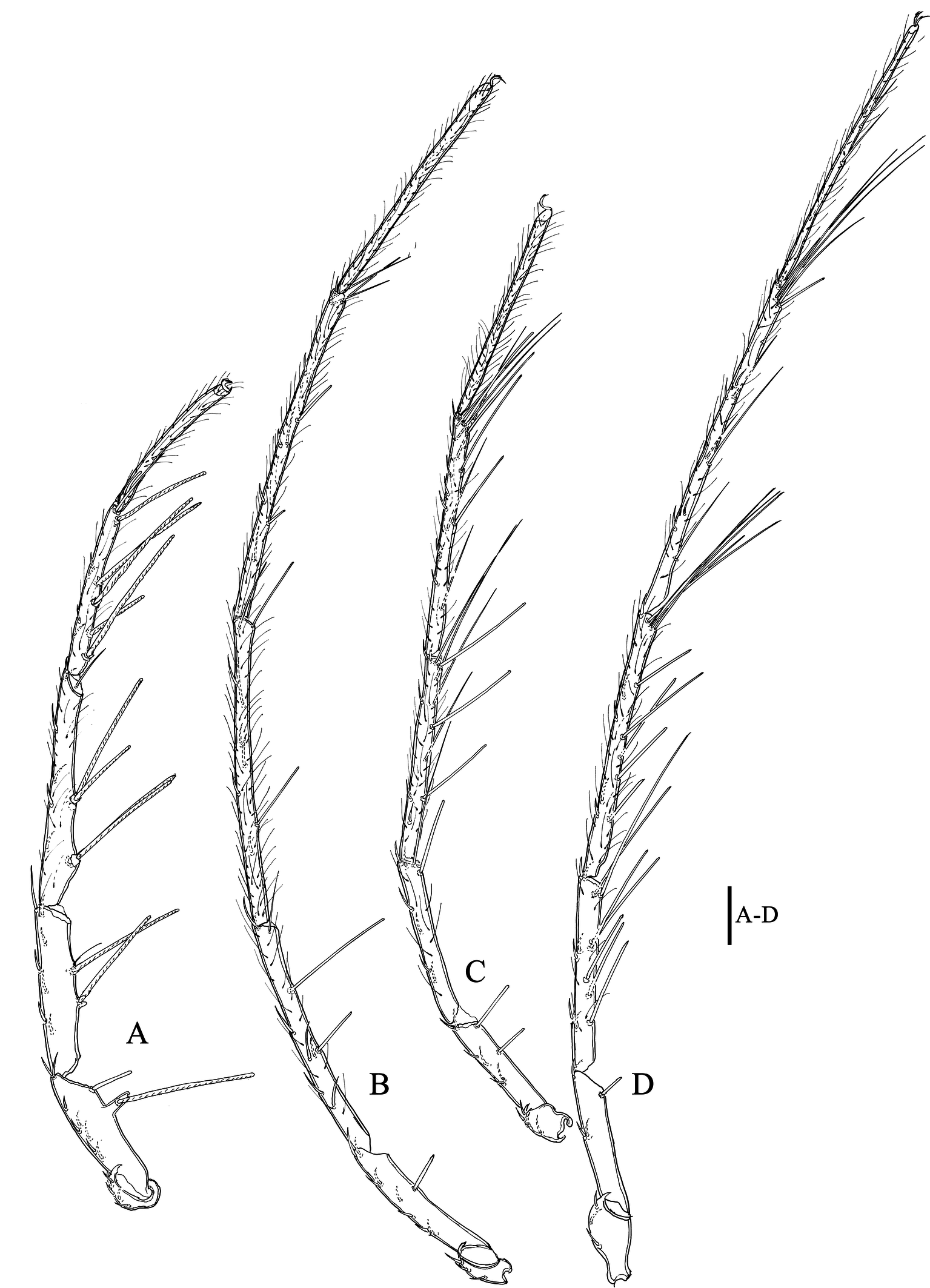 Palp generally slender, venter of P-2 slightly humped. P-3 with two stout setae of equal length, both shorter than P-3, P-4 with three elongate protrusions on its posteroventral surface, the lateral protrusion longer than the terminal one, and the ventral protrusion short and much shorter than the terminal one, with the distal protrusion bearing a blunt projection at its tip (Figure 8B). Dorsal apodeme of gnathosoma lanceolate and as long as ventral apodeme, and the ventral protrusion smooth at its base (Figure 8C). Chelicera with a well-developed claw (Figure 8D). I-L-2–6 ventrally each with movable, large, blunt setae. II-L-4, -5 ventrodistally with one and two short swimming setae, respectively. III-L-3, -4, -5 distally with one, three, three swimming setae, respectively. IV-L-3, -4, -5 with one, three, three swimming setae, respectively. IV-L-6 ventrally with three heavy setae (Figure 9A–D).