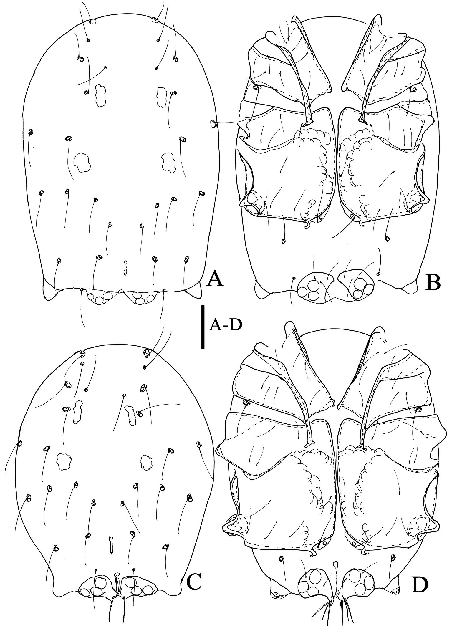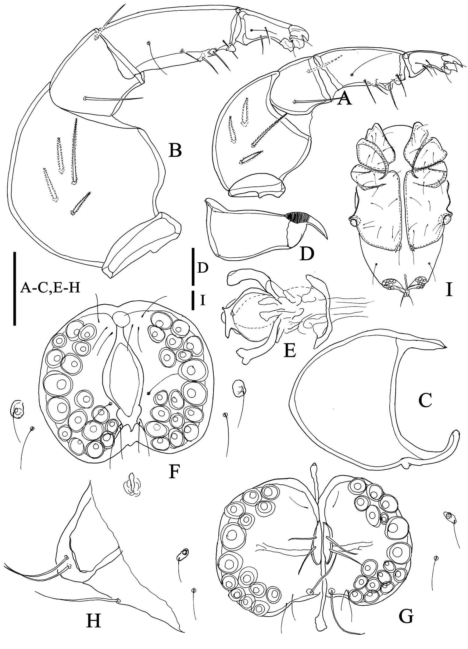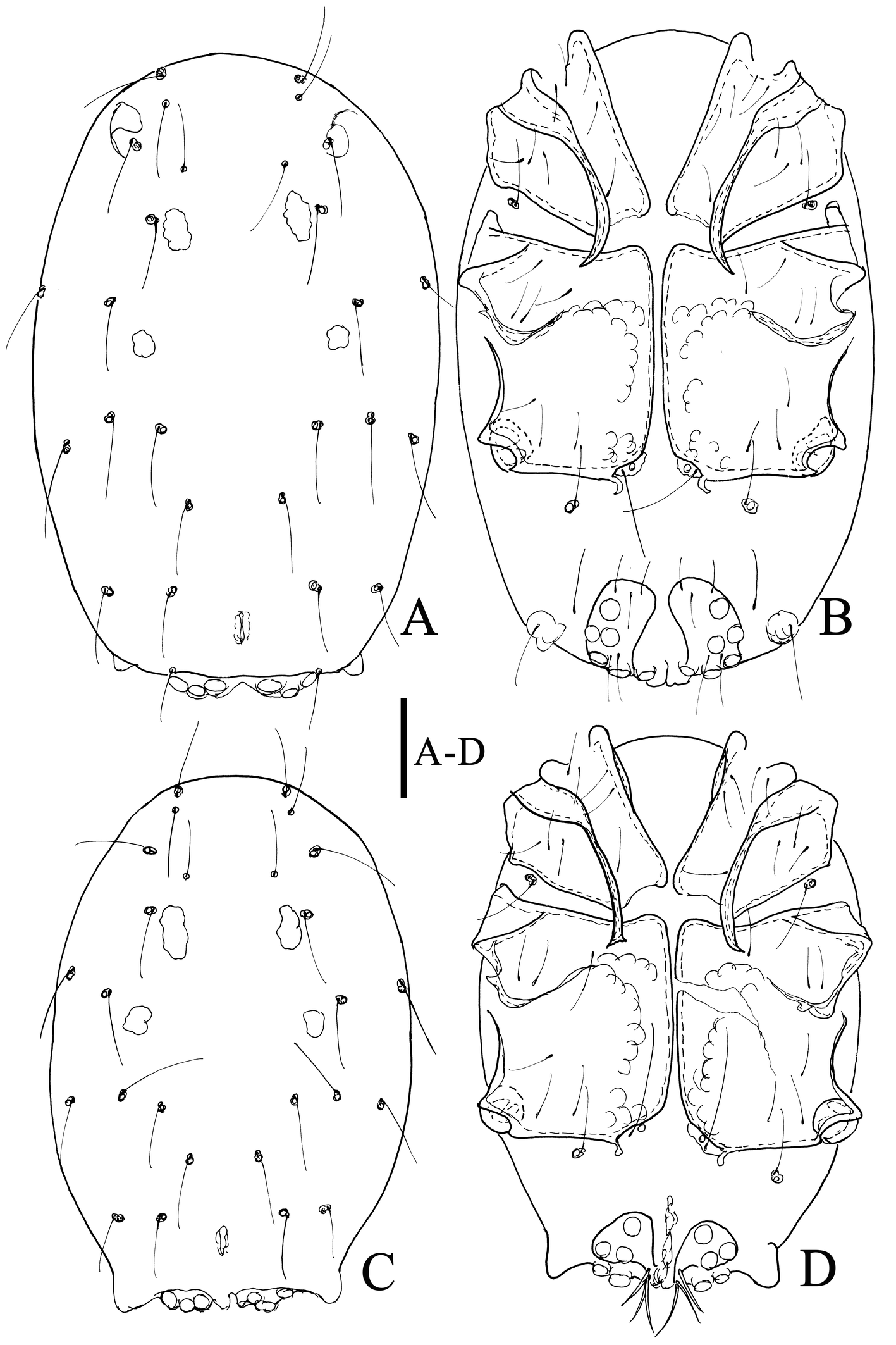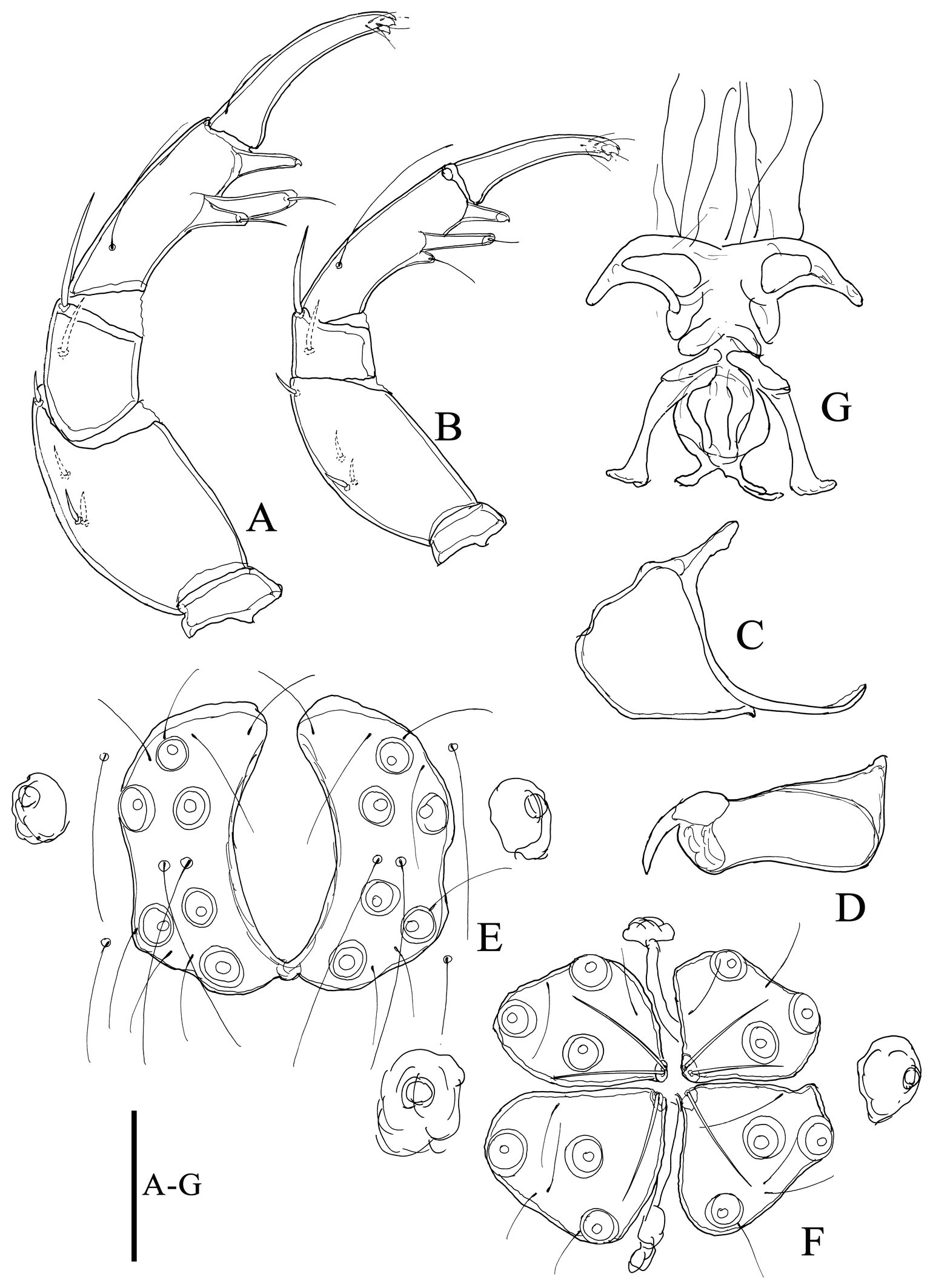 Female: general morphology similar to male. The coxal plates occupy approximately seven-ninths of venter. The genital field is normal and bears six pairs of Ac. Three pairs of stout setae present on the inner side of acetabular plates; the main shafts of these setae relatively short, with the distal portions elongate and hair-like (Figure 11F). The margin of acetabular plates bears six pairs of fine genital setae (Figure 11E).