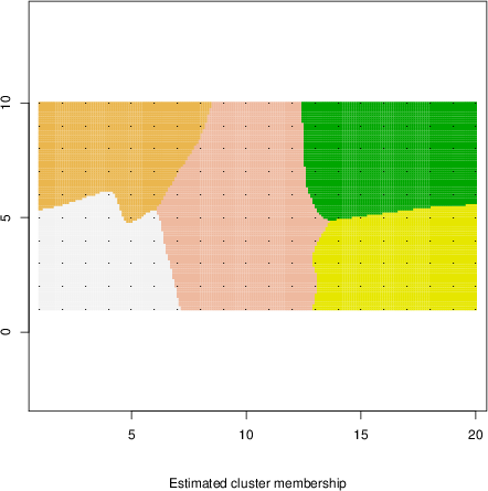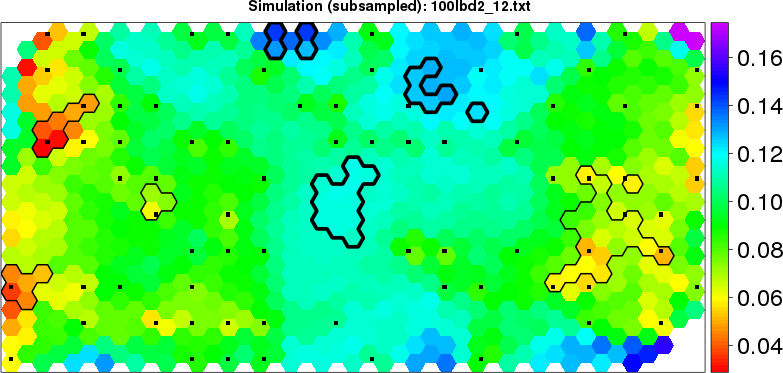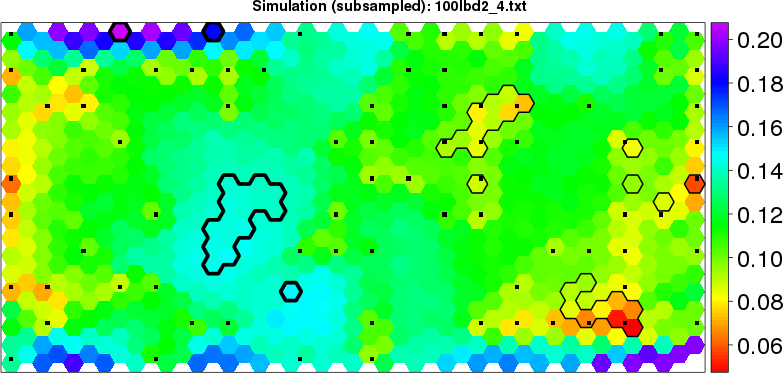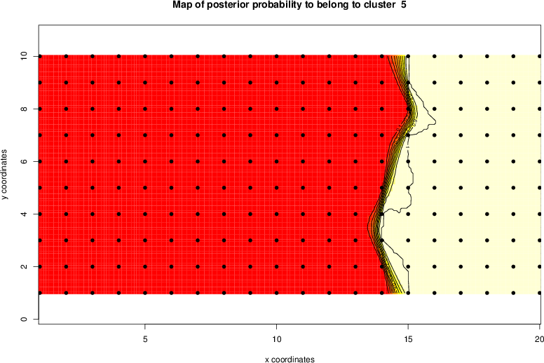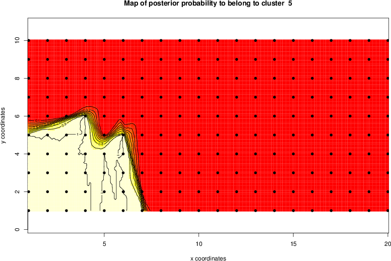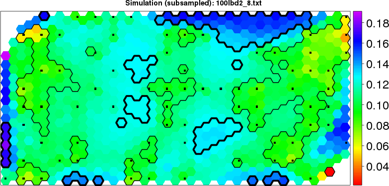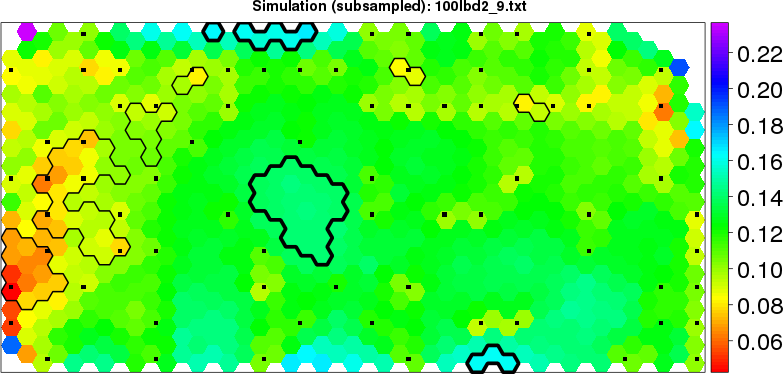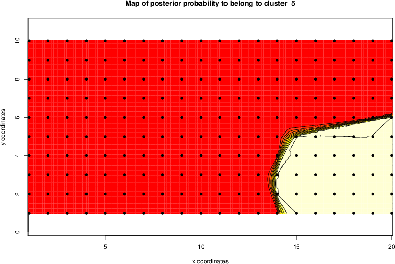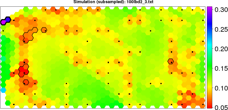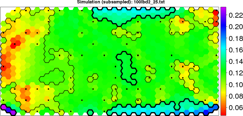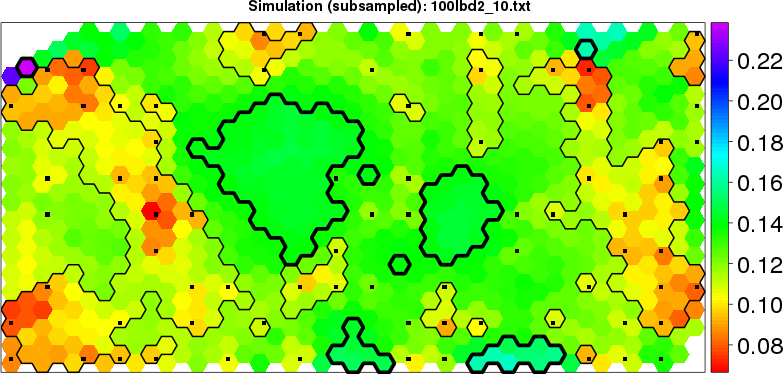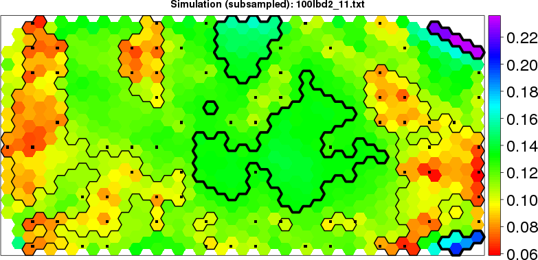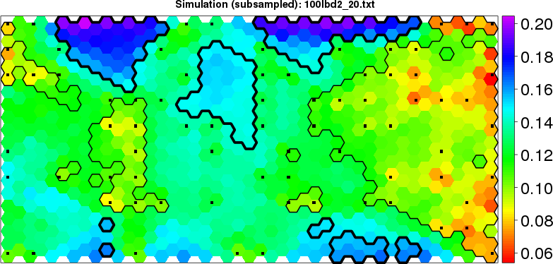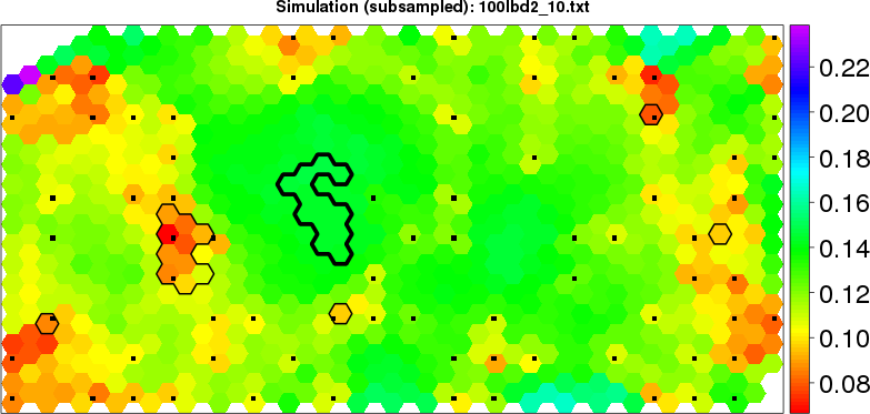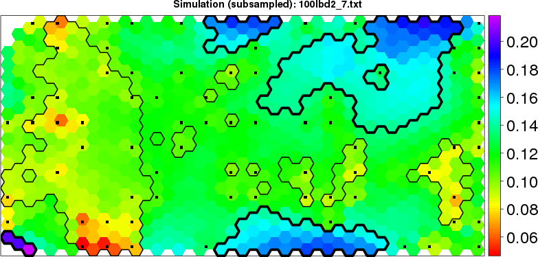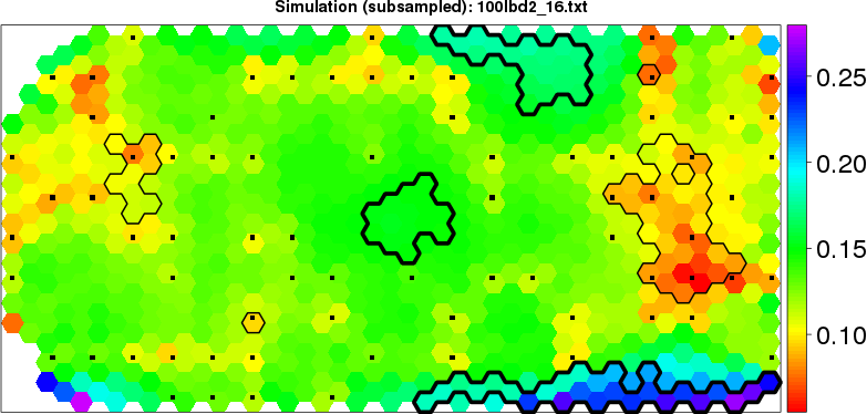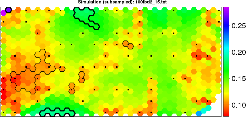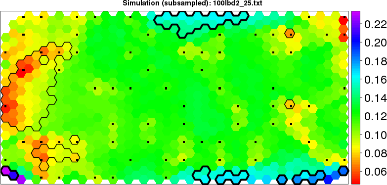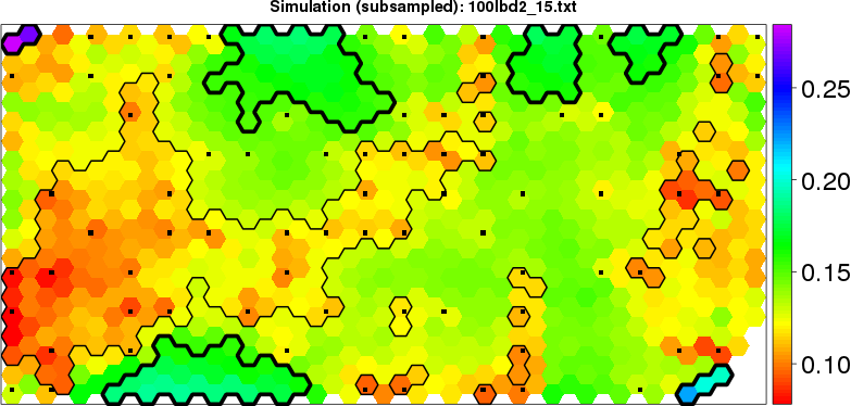 Simulated data | Geographical plots of weighted mean of all ellipse values (i.e., individual genetic distances ar of Rousset 2000) and significant barrier (cells with differentiation values higher than expected under a random distribution (no FDR applied) are materialized with thick black borders) | Idem, Benjamini-Yekutieli FDR applied | MAPI analysis (no FDR applied) with subsampled (75/200) dataset | MAPI analysis (Benjamini-Yekutieli FDR applied) with subsampled (75/200) dataset | Best probability memberships | Probability memberships for cluster 1 | Probability memberships for cluster 2 | Probability memberships for cluster 3 | Probability memberships for cluster 4 | Probability memberships for cluster 5 | Best probability memberships | Probability memberships for cluster 1 | Probability memberships for cluster 2 | Probability memberships for cluster 3 | Probability memberships for cluster 4 | Probability memberships for cluster 5 | Scatter plot showing the first two components of the DAPC (when K*>2) or density plot showing the first principal component of the DAPC (when K*=2) | Probability memberships for cluster 1 | Probability memberships for cluster 2 | Probability memberships for cluster 3 | Probability memberships for cluster 4 | Probability memberships for cluster 5 | Scatter plot showing the first two components of the DAPC (when K*>2) or density plot showing the first principal component of the DAPC (when K*=2) | Probability memberships for cluster 1 | Probability memberships for cluster 2 | Probability memberships for cluster 3 | Probability memberships for cluster 4 | Probability memberships for cluster 5 |