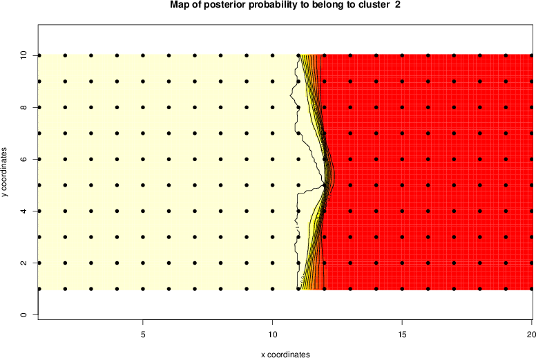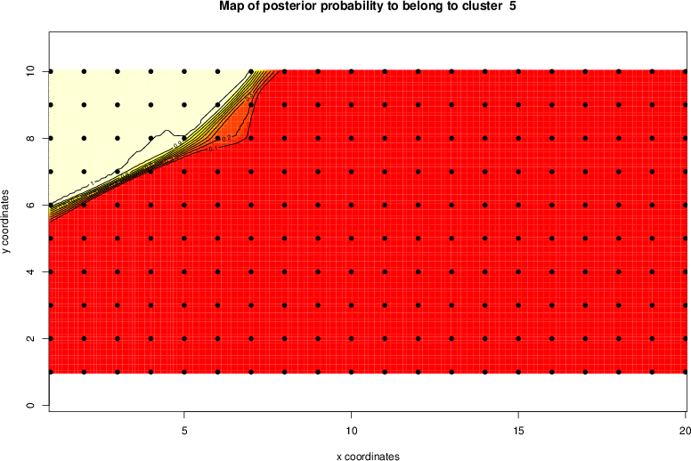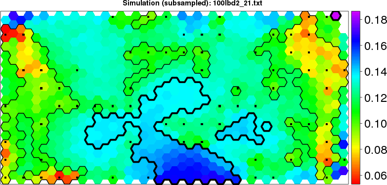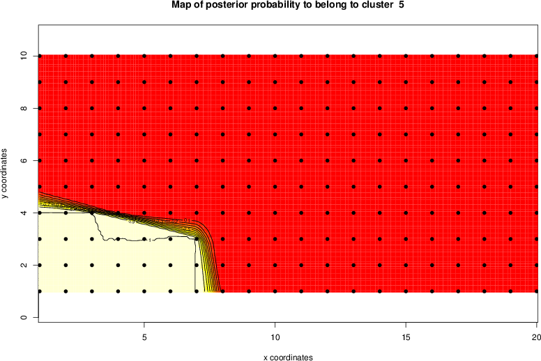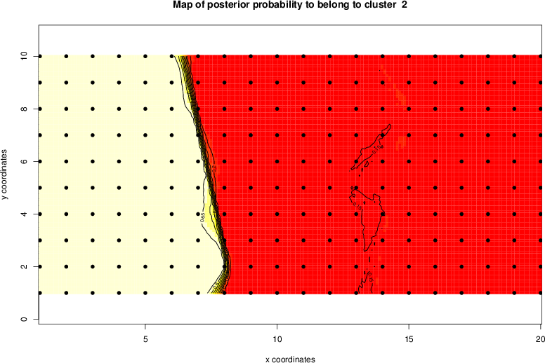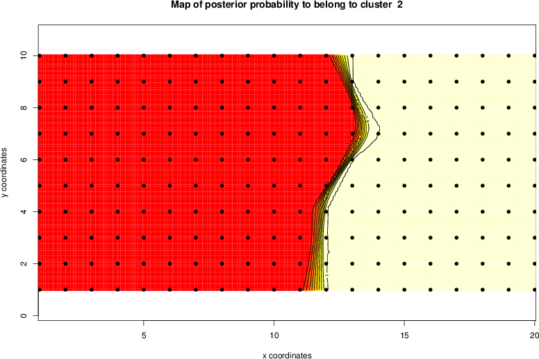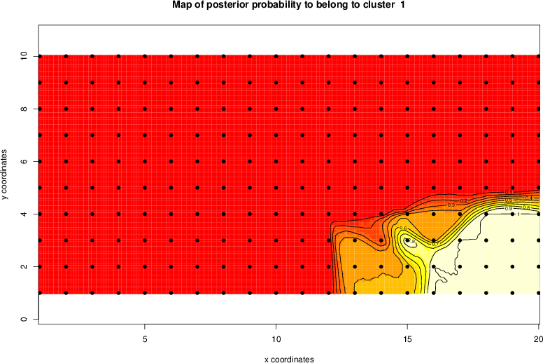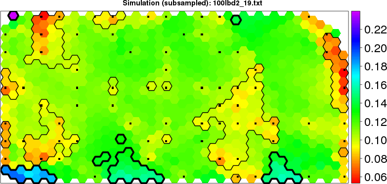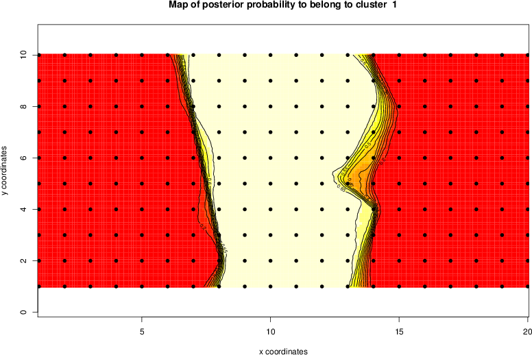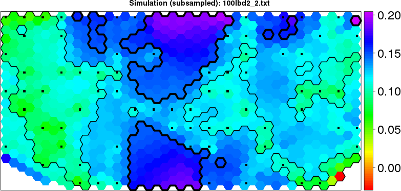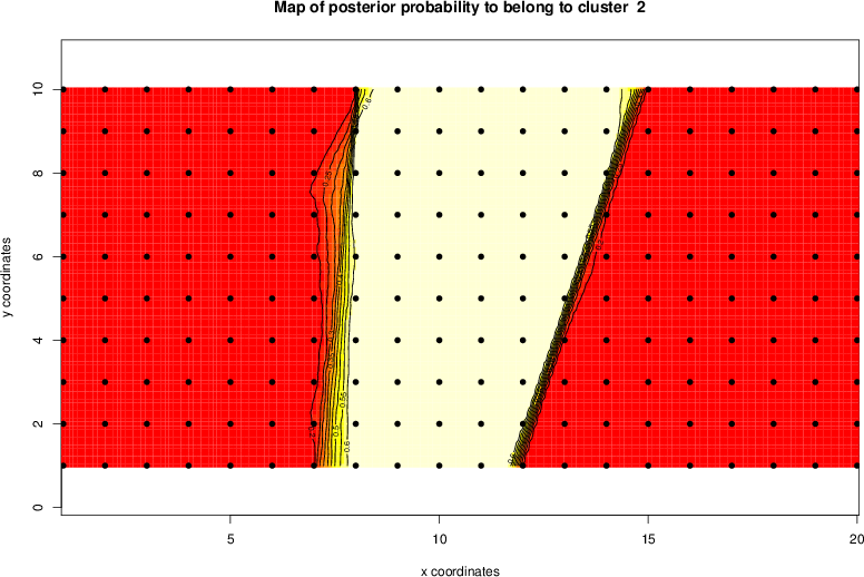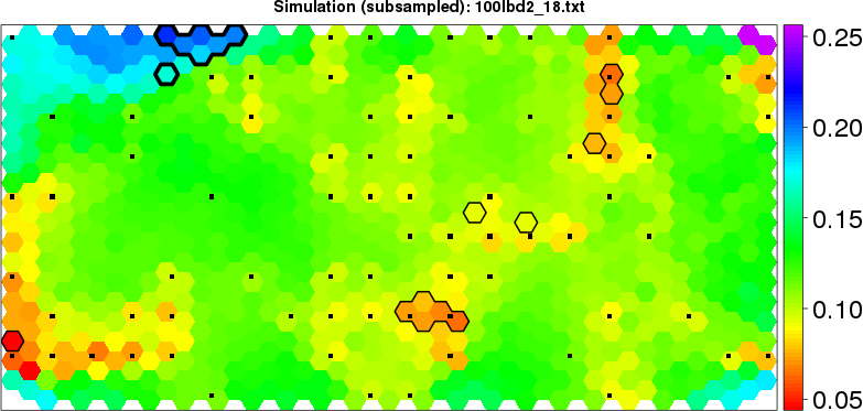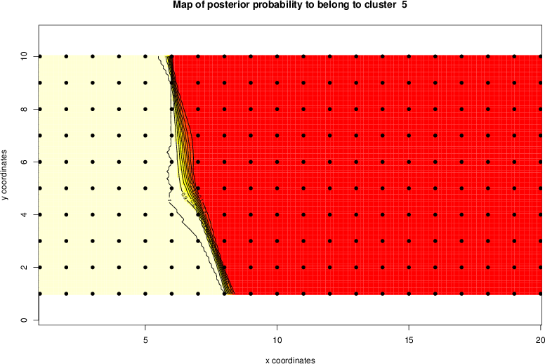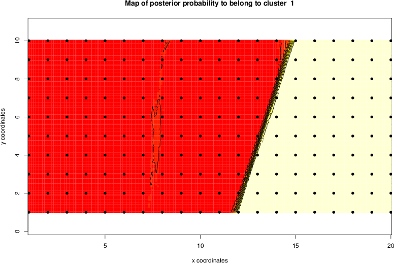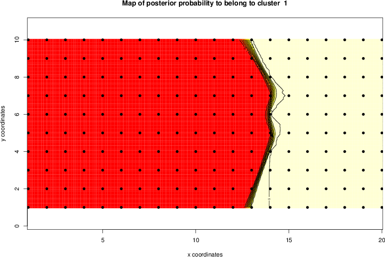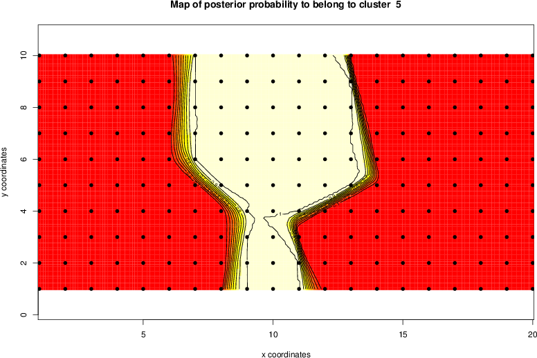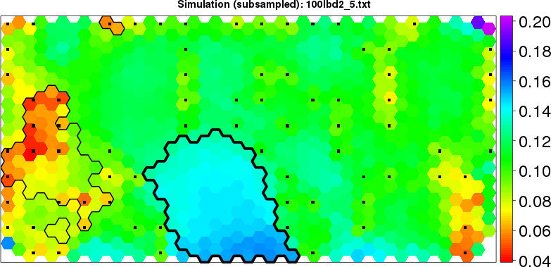 Simulated data | Geographical plots of weighted mean of all ellipse values (i.e., individual genetic distances ar of Rousset 2000) and significant barrier (cells with differentiation values higher than expected under a random distribution (no FDR applied) are materialized with thick black borders) | Idem, Benjamini-Yekutieli FDR applied | MAPI analysis (no FDR applied) with subsampled (75/200) dataset | MAPI analysis (Benjamini-Yekutieli FDR applied) with subsampled (75/200) dataset | Best probability memberships | Probability memberships for cluster 1 | Probability memberships for cluster 2 | Probability memberships for cluster 3 | Probability memberships for cluster 4 | Probability memberships for cluster 5 | Best probability memberships | Probability memberships for cluster 1 | Probability memberships for cluster 2 | Probability memberships for cluster 3 | Probability memberships for cluster 4 | Probability memberships for cluster 5 | Scatter plot showing the first two components of the DAPC (when K*>2) or density plot showing the first principal component of the DAPC (when K*=2) | Probability memberships for cluster 1 | Probability memberships for cluster 2 | Probability memberships for cluster 3 | Probability memberships for cluster 4 | Probability memberships for cluster 5 | Scatter plot showing the first two components of the DAPC (when K*>2) or density plot showing the first principal component of the DAPC (when K*=2) | Probability memberships for cluster 1 | Probability memberships for cluster 2 | Probability memberships for cluster 3 | Probability memberships for cluster 4 | Probability memberships for cluster 5 |