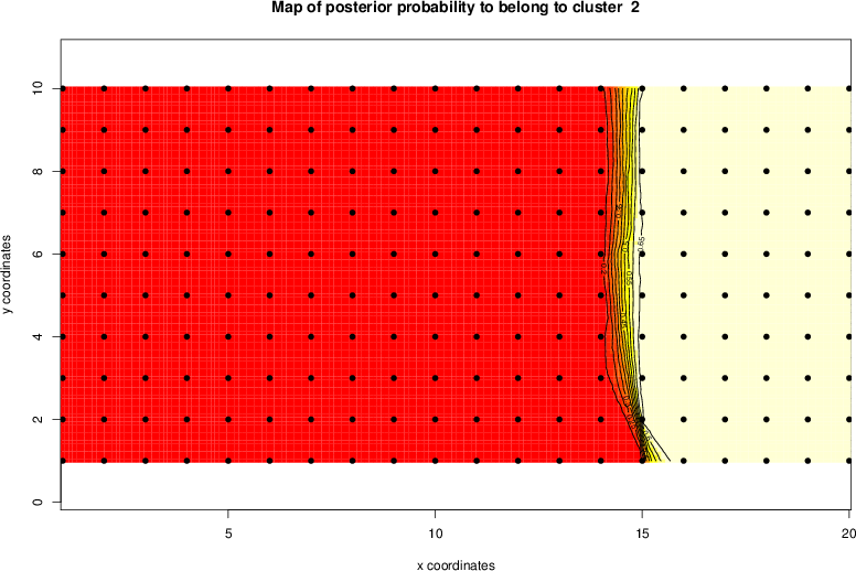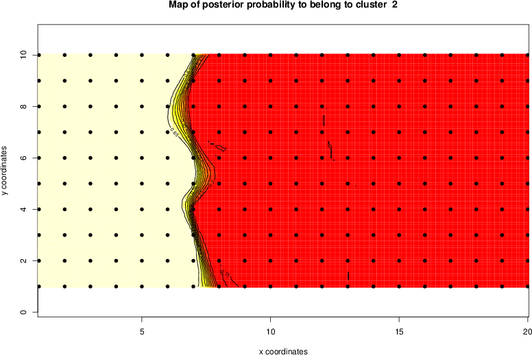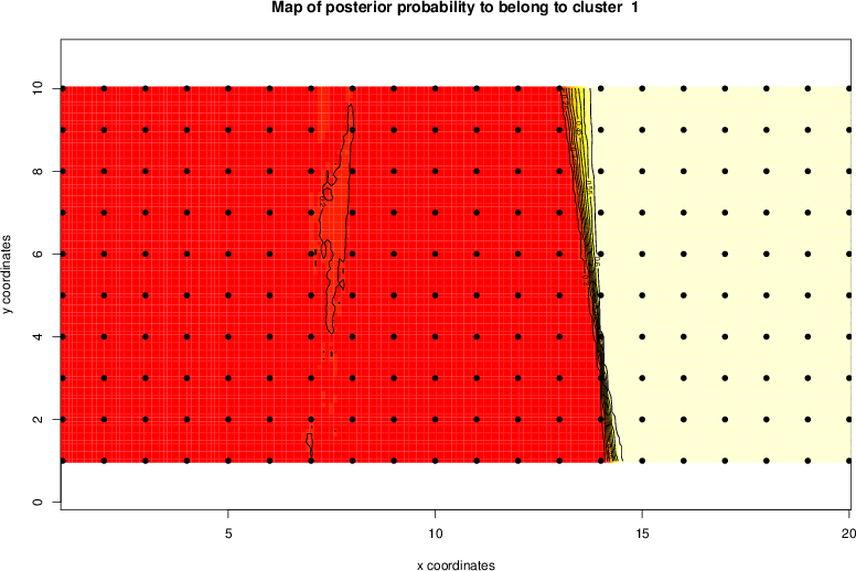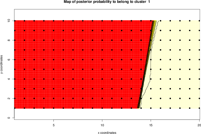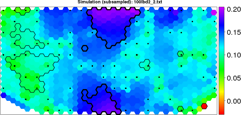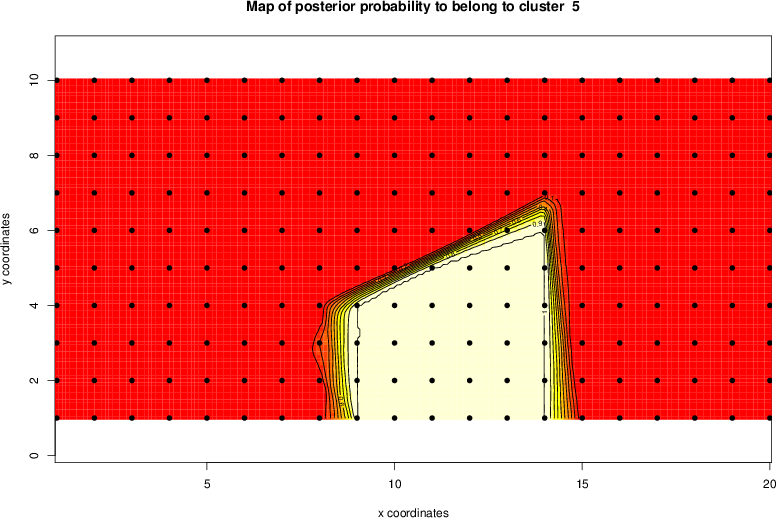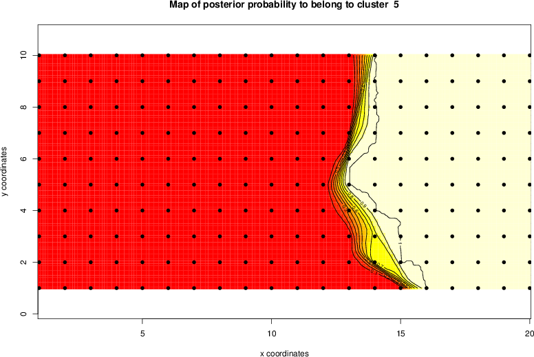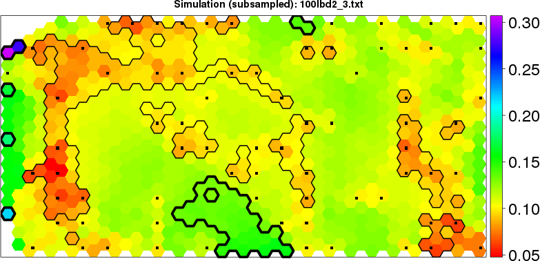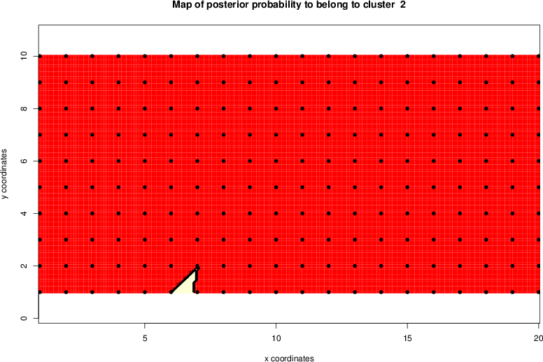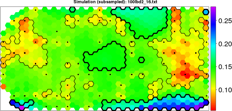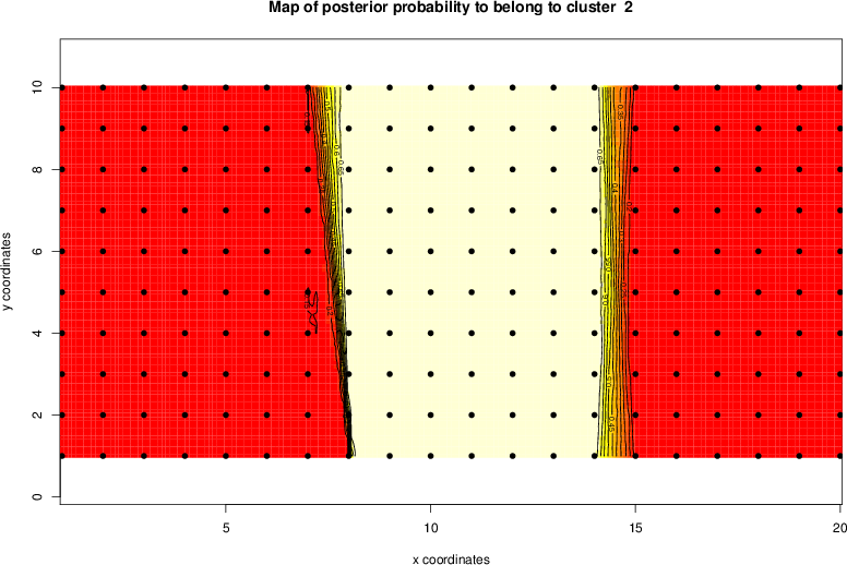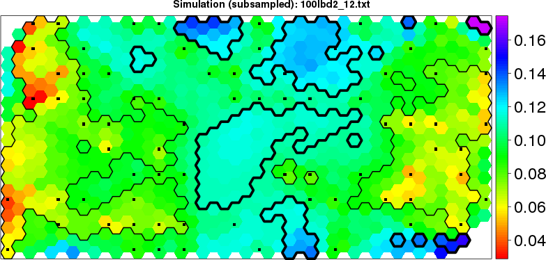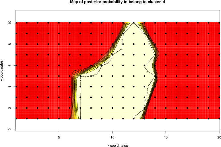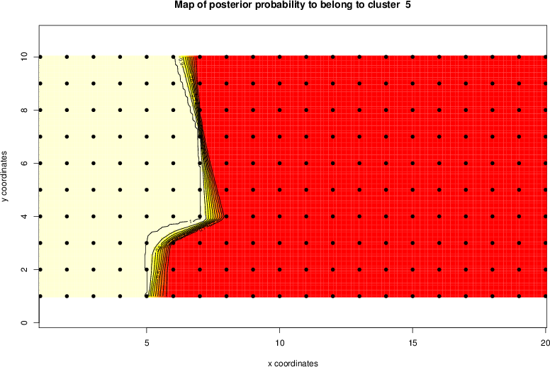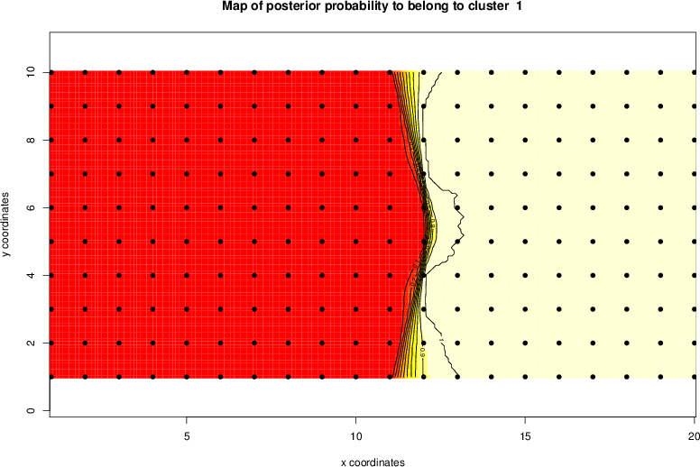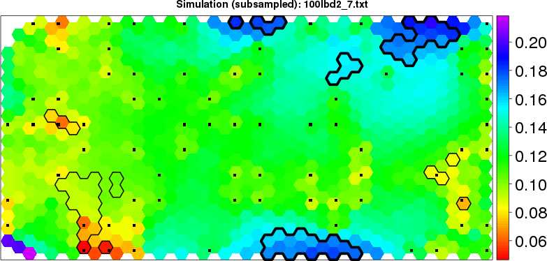 Simulated data | Geographical plots of weighted mean of all ellipse values (i.e., individual genetic distances ar of Rousset 2000) and significant barrier (cells with differentiation values higher than expected under a random distribution (no FDR applied) are materialized with thick black borders) | Idem, Benjamini-Yekutieli FDR applied | MAPI analysis (no FDR applied) with subsampled (75/200) dataset | MAPI analysis (Benjamini-Yekutieli FDR applied) with subsampled (75/200) dataset | Best probability memberships | Probability memberships for cluster 1 | Probability memberships for cluster 2 | Probability memberships for cluster 3 | Probability memberships for cluster 4 | Probability memberships for cluster 5 | Best probability memberships | Probability memberships for cluster 1 | Probability memberships for cluster 2 | Probability memberships for cluster 3 | Probability memberships for cluster 4 | Probability memberships for cluster 5 | Scatter plot showing the first two components of the DAPC (when K*>2) or density plot showing the first principal component of the DAPC (when K*=2) | Probability memberships for cluster 1 | Probability memberships for cluster 2 | Probability memberships for cluster 3 | Probability memberships for cluster 4 | Probability memberships for cluster 5 | Scatter plot showing the first two components of the DAPC (when K*>2) or density plot showing the first principal component of the DAPC (when K*=2) | Probability memberships for cluster 1 | Probability memberships for cluster 2 | Probability memberships for cluster 3 | Probability memberships for cluster 4 | Probability memberships for cluster 5 |