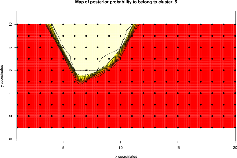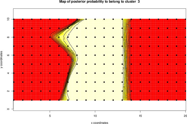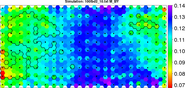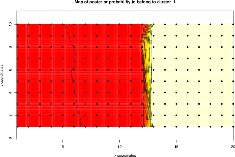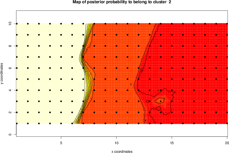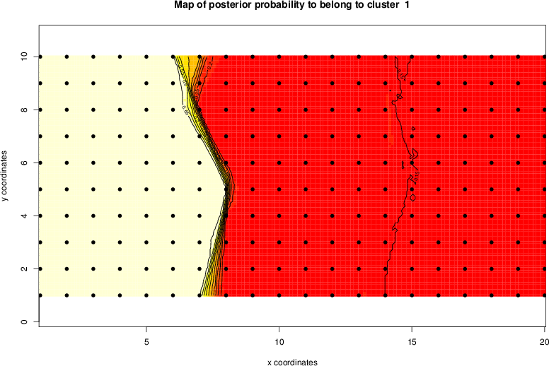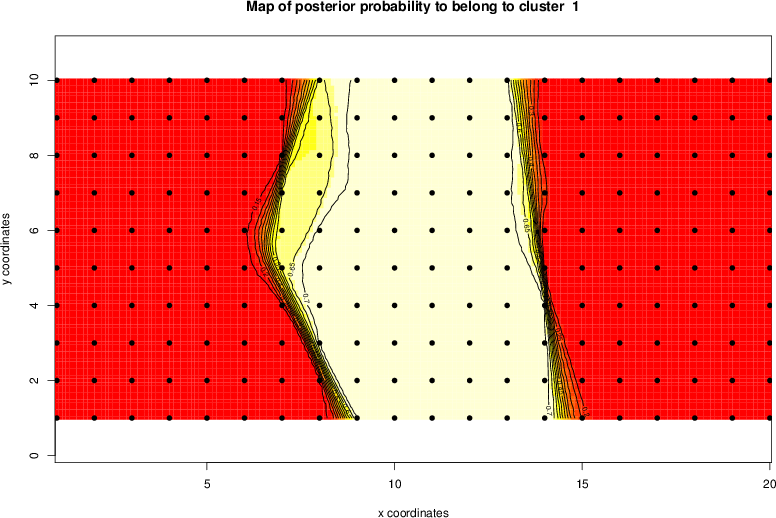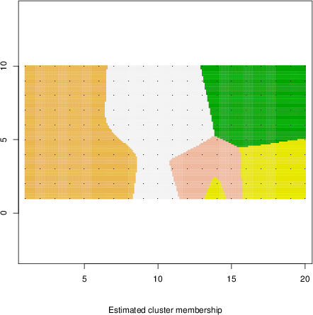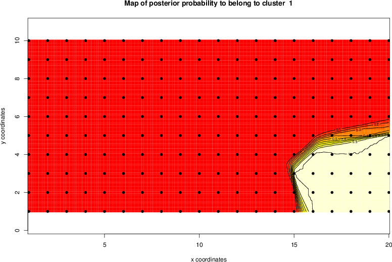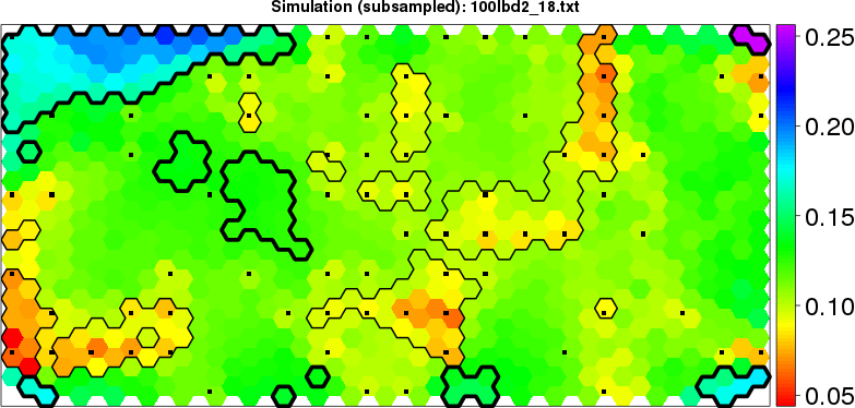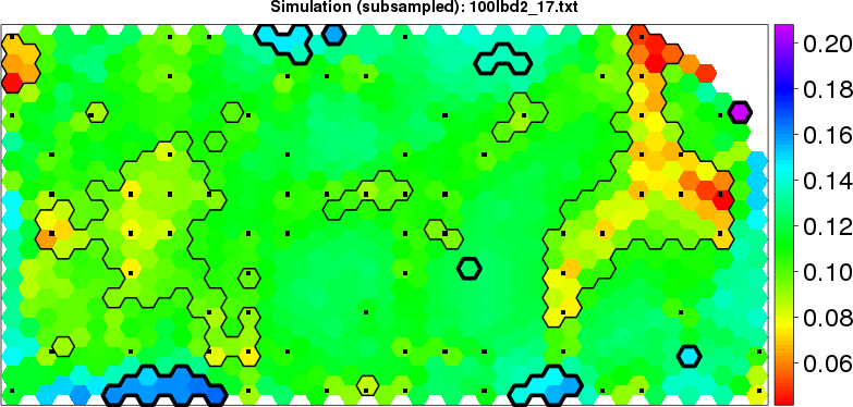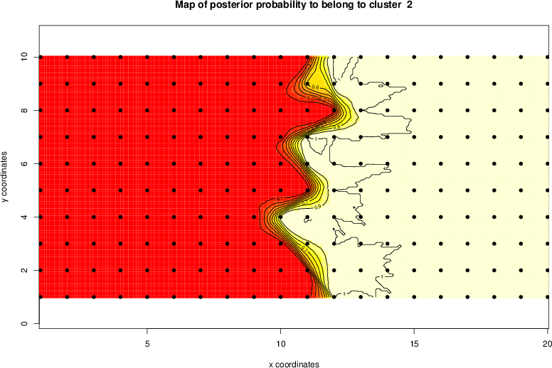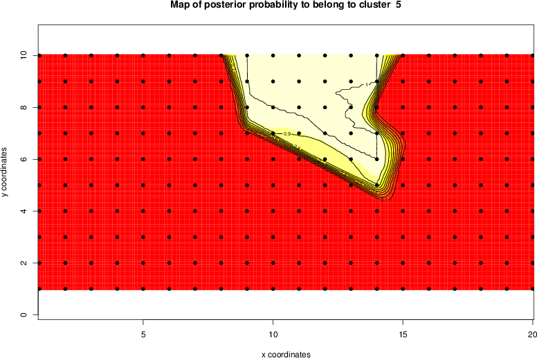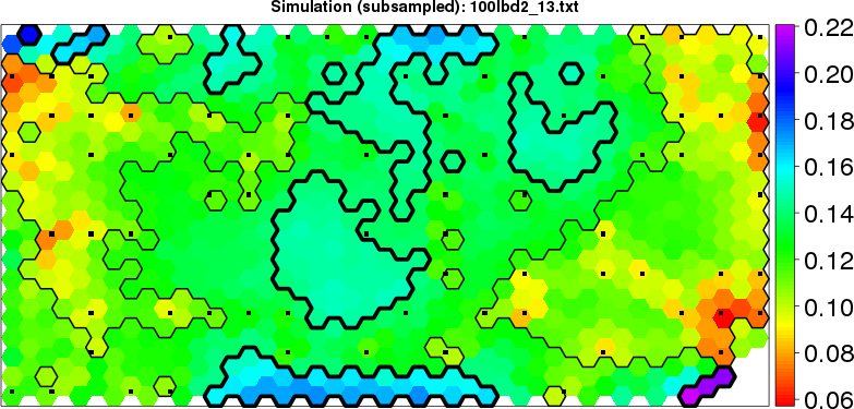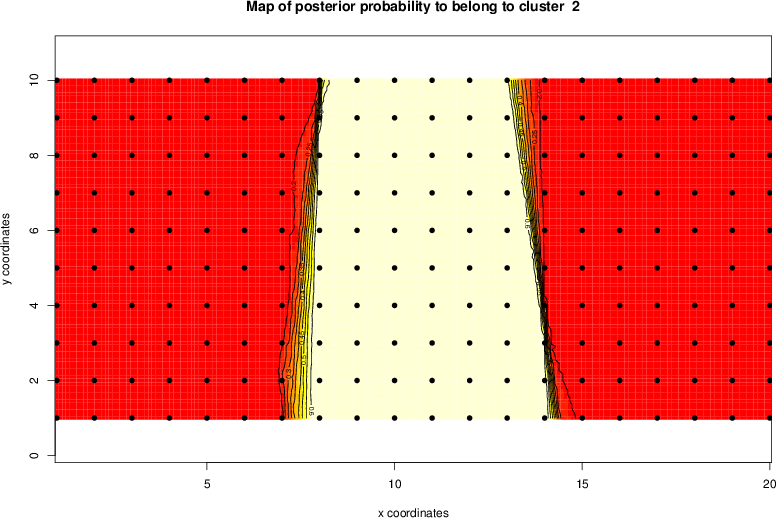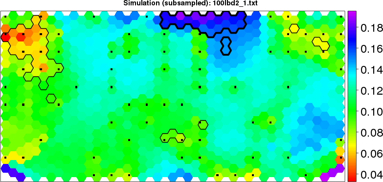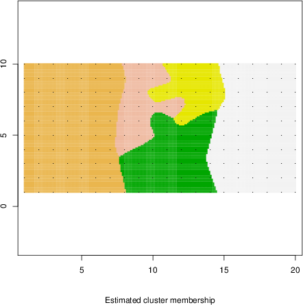 Simulated data | Geographical plots of weighted mean of all ellipse values (i.e., individual genetic distances ar of Rousset 2000) and significant barrier (cells with differentiation values higher than expected under a random distribution (no FDR applied) are materialized with thick black borders) | Idem, Benjamini-Yekutieli FDR applied | MAPI analysis (no FDR applied) with subsampled (75/200) dataset | MAPI analysis (Benjamini-Yekutieli FDR applied) with subsampled (75/200) dataset | Best probability memberships | Probability memberships for cluster 1 | Probability memberships for cluster 2 | Probability memberships for cluster 3 | Probability memberships for cluster 4 | Probability memberships for cluster 5 | Best probability memberships | Probability memberships for cluster 1 | Probability memberships for cluster 2 | Probability memberships for cluster 3 | Probability memberships for cluster 4 | Probability memberships for cluster 5 | Scatter plot showing the first two components of the DAPC (when K*>2) or density plot showing the first principal component of the DAPC (when K*=2) | Probability memberships for cluster 1 | Probability memberships for cluster 2 | Probability memberships for cluster 3 | Probability memberships for cluster 4 | Probability memberships for cluster 5 | Scatter plot showing the first two components of the DAPC (when K*>2) or density plot showing the first principal component of the DAPC (when K*=2) | Probability memberships for cluster 1 | Probability memberships for cluster 2 | Probability memberships for cluster 3 | Probability memberships for cluster 4 | Probability memberships for cluster 5 |