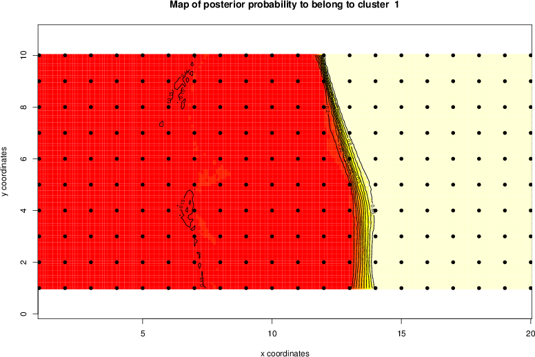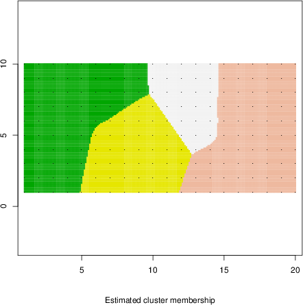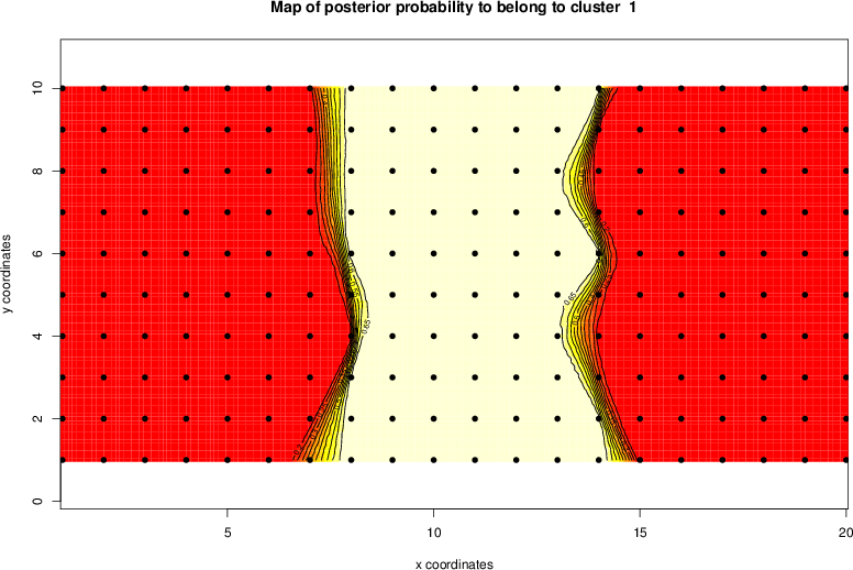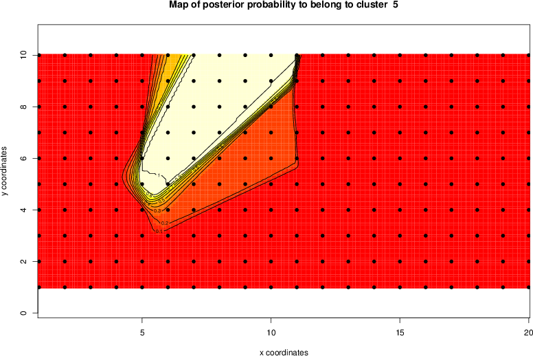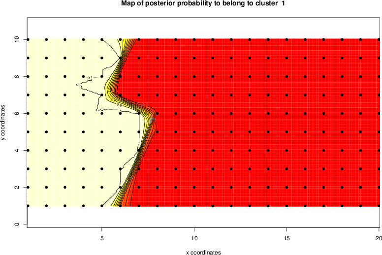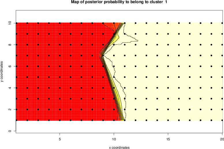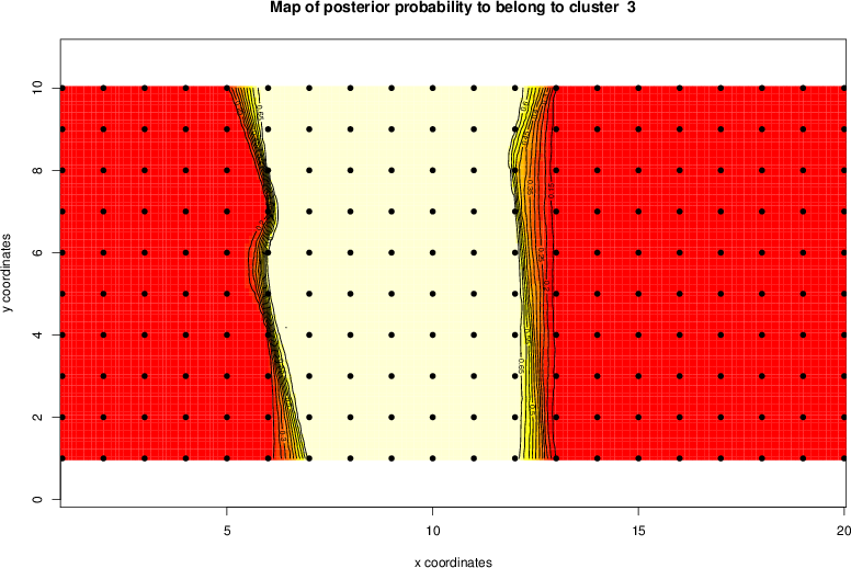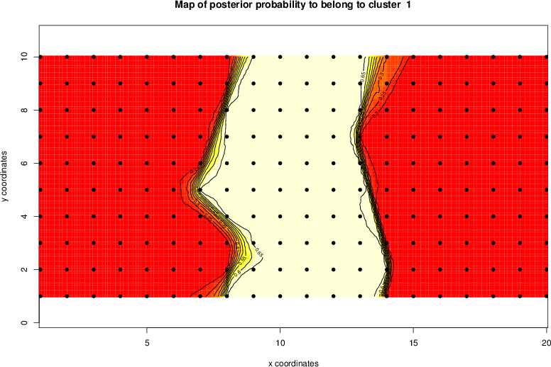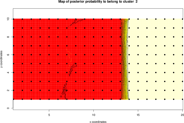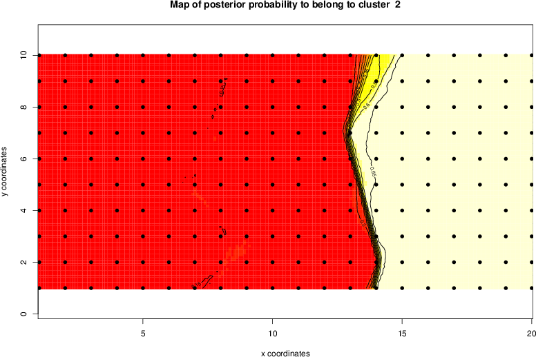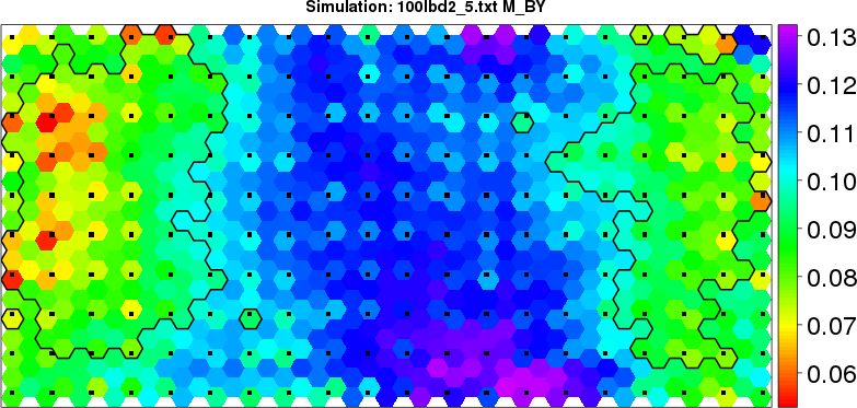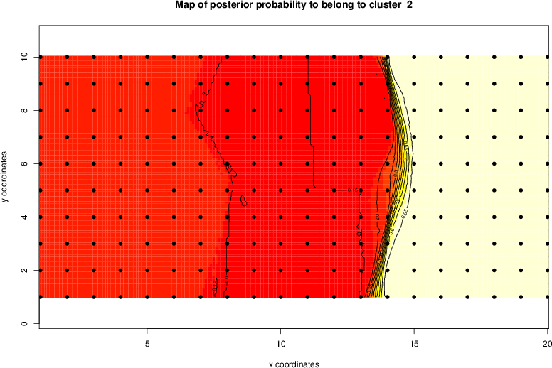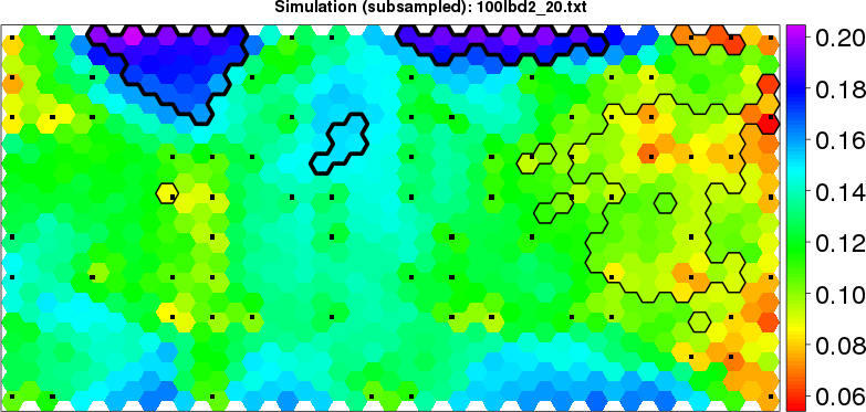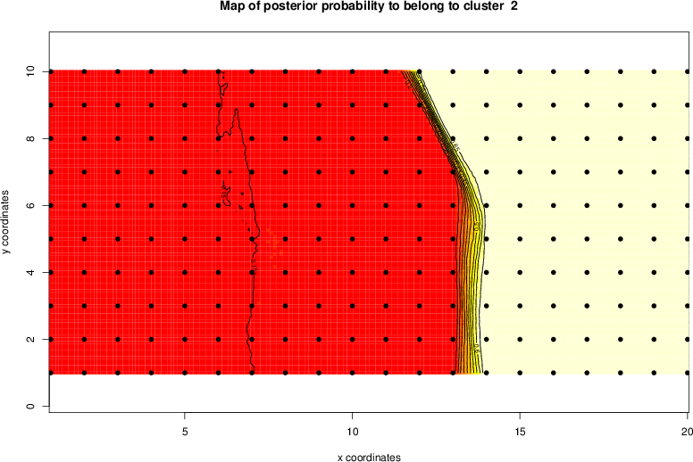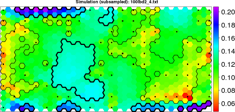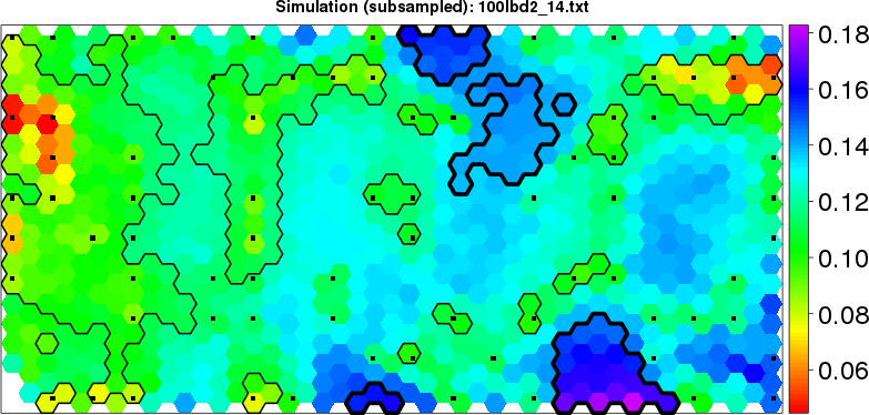 Simulated data | Geographical plots of weighted mean of all ellipse values (i.e., individual genetic distances ar of Rousset 2000) and significant barrier (cells with differentiation values higher than expected under a random distribution (no FDR applied) are materialized with thick black borders) | Idem, Benjamini-Yekutieli FDR applied | MAPI analysis (no FDR applied) with subsampled (75/200) dataset | MAPI analysis (Benjamini-Yekutieli FDR applied) with subsampled (75/200) dataset | Best probability memberships | Probability memberships for cluster 1 | Probability memberships for cluster 2 | Probability memberships for cluster 3 | Probability memberships for cluster 4 | Probability memberships for cluster 5 | Best probability memberships | Probability memberships for cluster 1 | Probability memberships for cluster 2 | Probability memberships for cluster 3 | Probability memberships for cluster 4 | Probability memberships for cluster 5 | Scatter plot showing the first two components of the DAPC (when K*>2) or density plot showing the first principal component of the DAPC (when K*=2) | Probability memberships for cluster 1 | Probability memberships for cluster 2 | Probability memberships for cluster 3 | Probability memberships for cluster 4 | Probability memberships for cluster 5 | Scatter plot showing the first two components of the DAPC (when K*>2) or density plot showing the first principal component of the DAPC (when K*=2) | Probability memberships for cluster 1 | Probability memberships for cluster 2 | Probability memberships for cluster 3 | Probability memberships for cluster 4 | Probability memberships for cluster 5 |