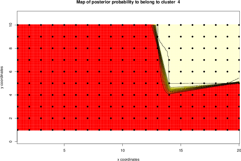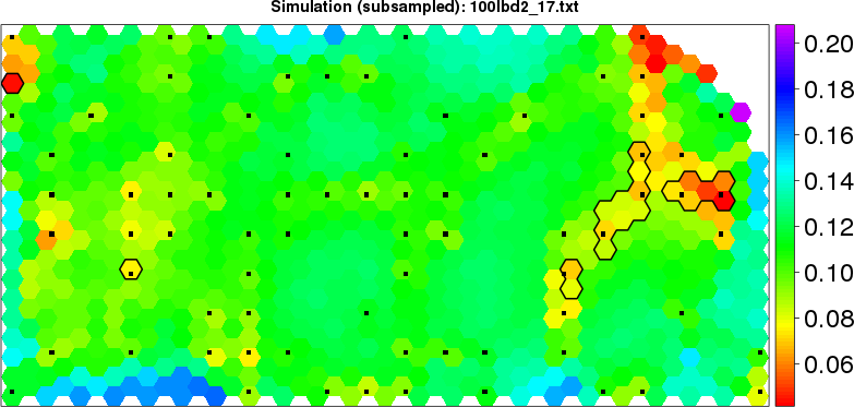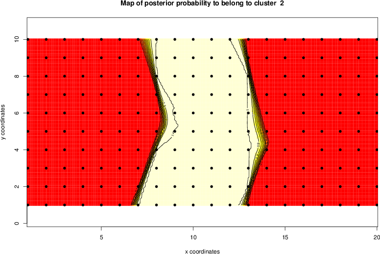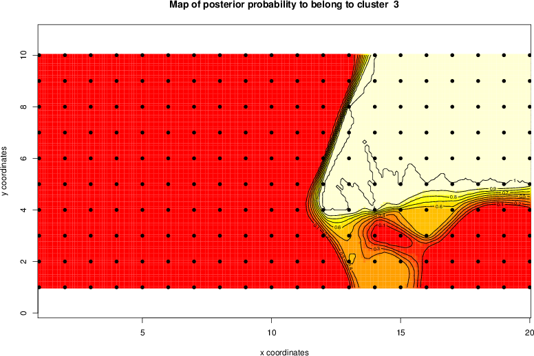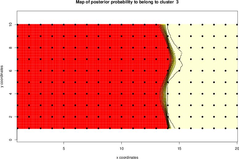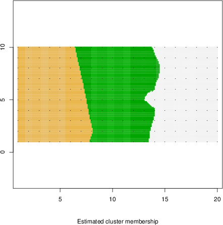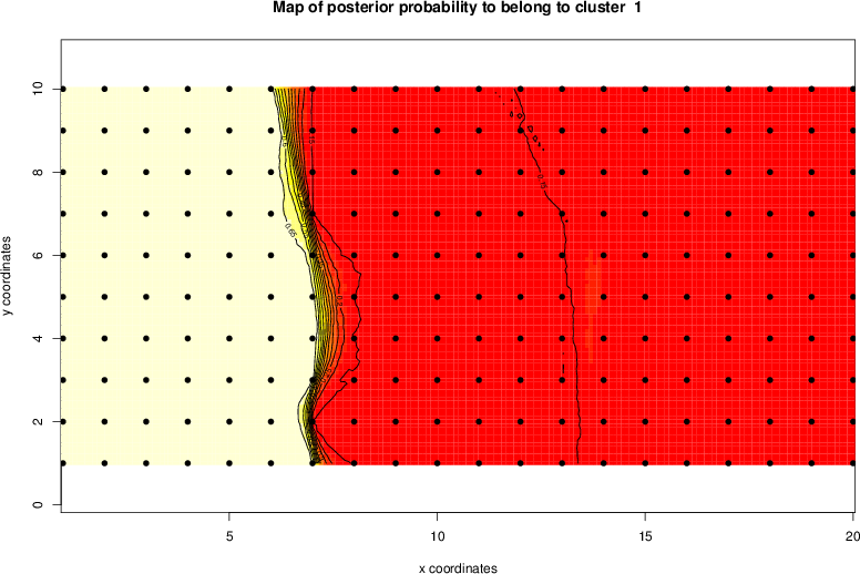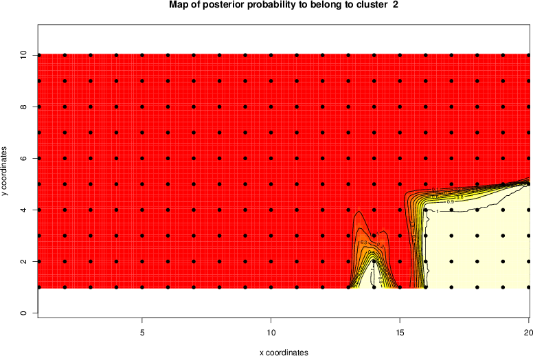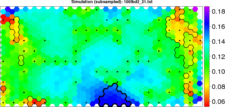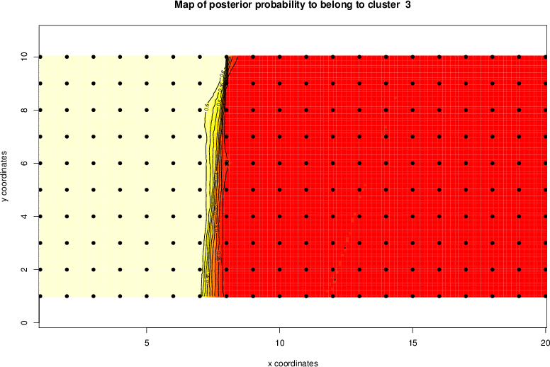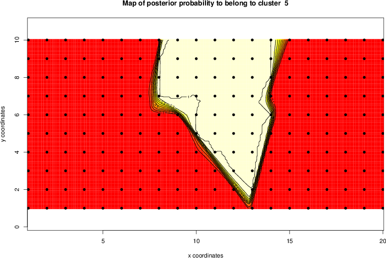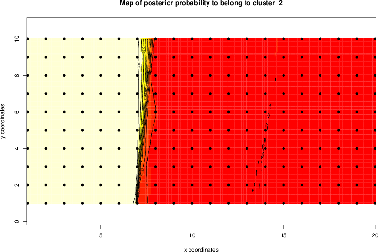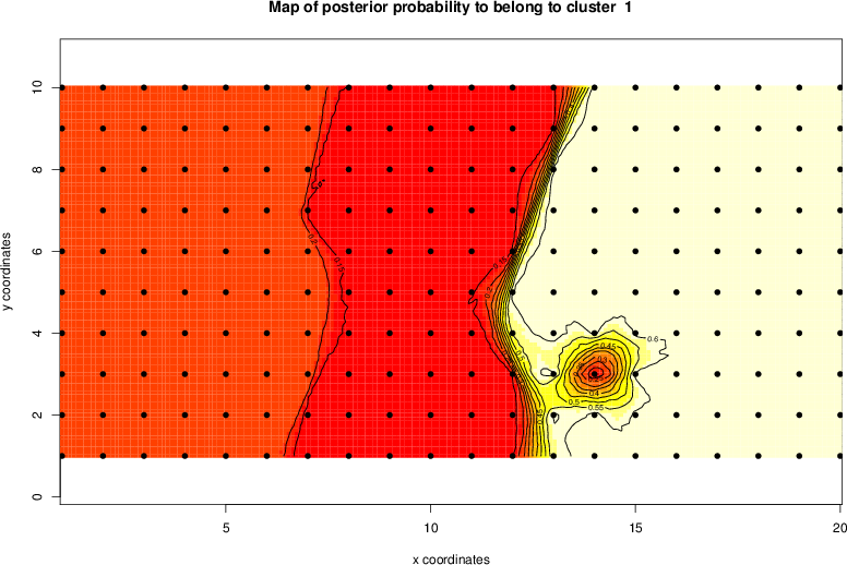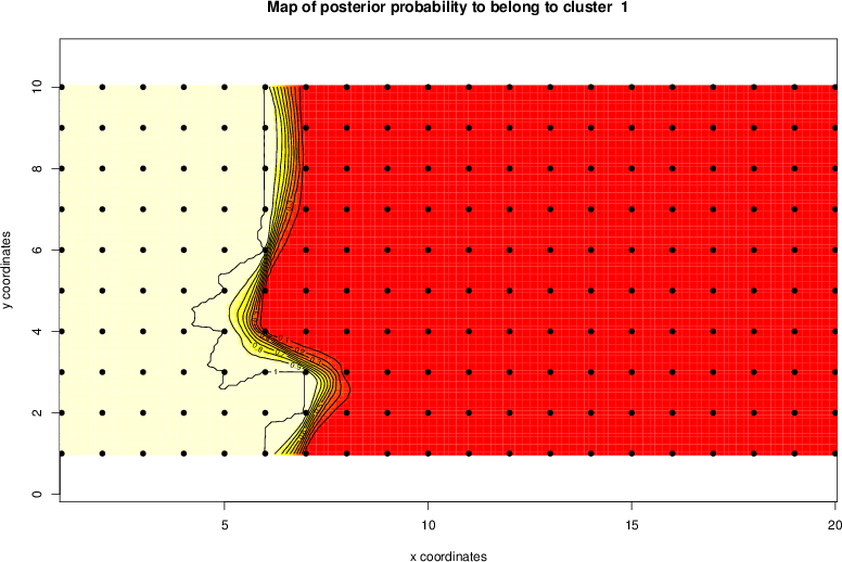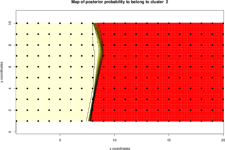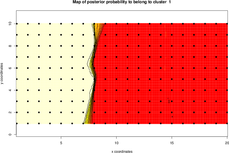 Simulated data | Geographical plots of weighted mean of all ellipse values (i.e., individual genetic distances ar of Rousset 2000) and significant barrier (cells with differentiation values higher than expected under a random distribution (no FDR applied) are materialized with thick black borders) | Idem, Benjamini-Yekutieli FDR applied | MAPI analysis (no FDR applied) with subsampled (75/200) dataset | MAPI analysis (Benjamini-Yekutieli FDR applied) with subsampled (75/200) dataset | Best probability memberships | Probability memberships for cluster 1 | Probability memberships for cluster 2 | Probability memberships for cluster 3 | Probability memberships for cluster 4 | Probability memberships for cluster 5 | Best probability memberships | Probability memberships for cluster 1 | Probability memberships for cluster 2 | Probability memberships for cluster 3 | Probability memberships for cluster 4 | Probability memberships for cluster 5 | Scatter plot showing the first two components of the DAPC (when K*>2) or density plot showing the first principal component of the DAPC (when K*=2) | Probability memberships for cluster 1 | Probability memberships for cluster 2 | Probability memberships for cluster 3 | Probability memberships for cluster 4 | Probability memberships for cluster 5 | Scatter plot showing the first two components of the DAPC (when K*>2) or density plot showing the first principal component of the DAPC (when K*=2) | Probability memberships for cluster 1 | Probability memberships for cluster 2 | Probability memberships for cluster 3 | Probability memberships for cluster 4 | Probability memberships for cluster 5 |