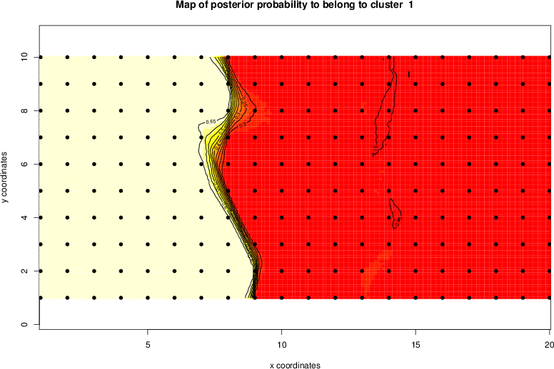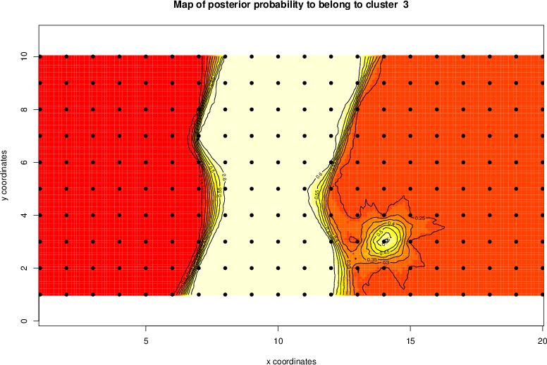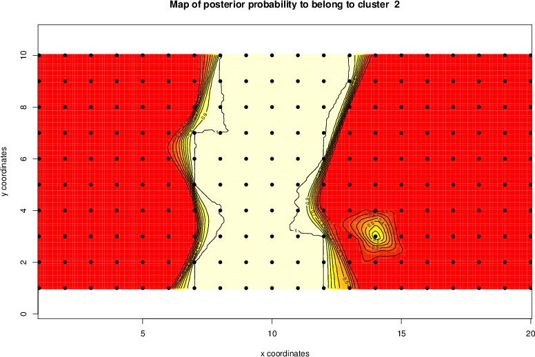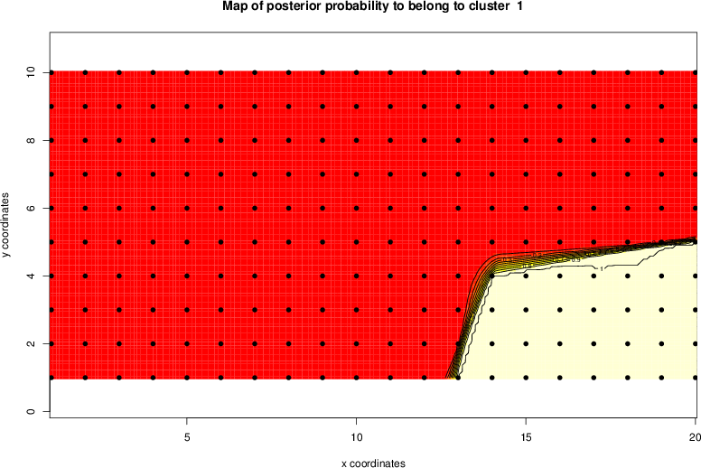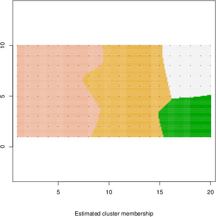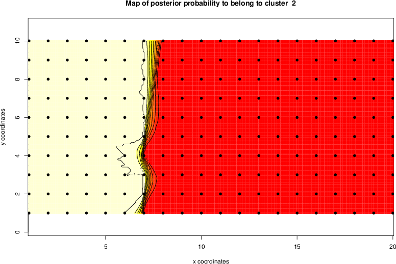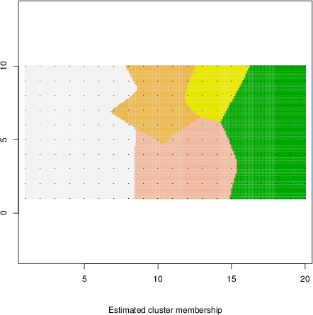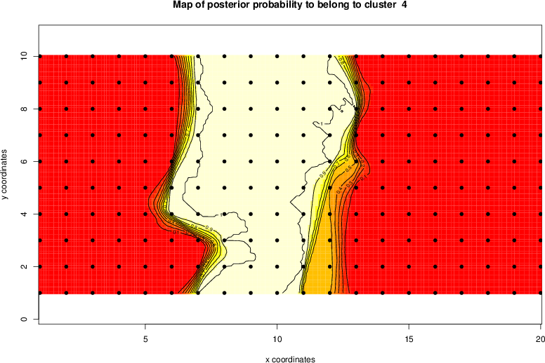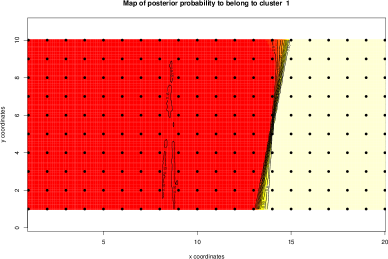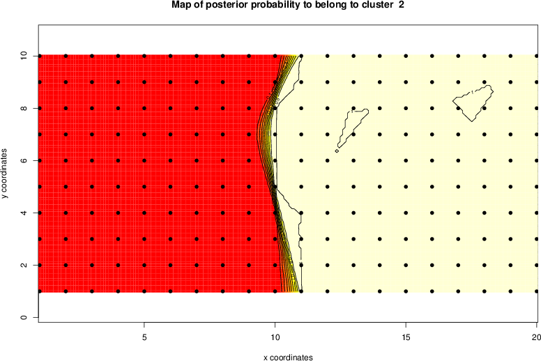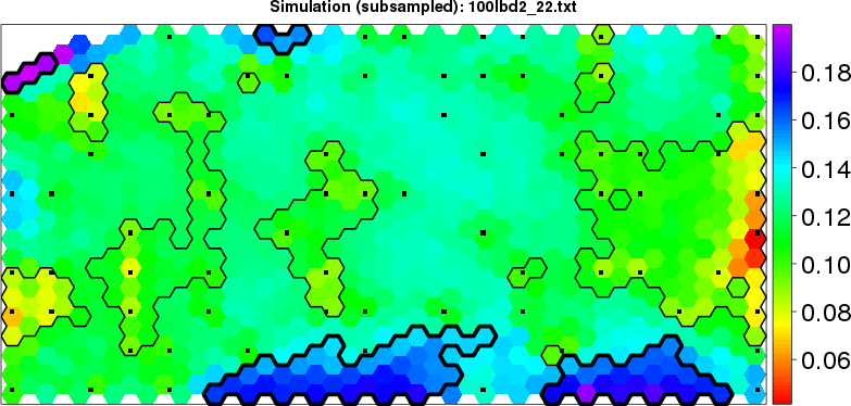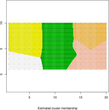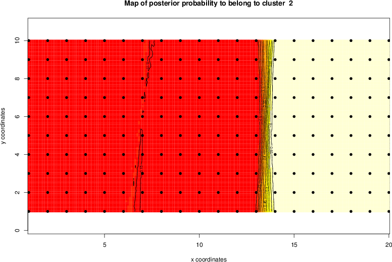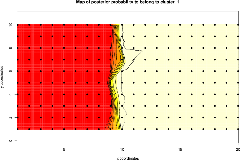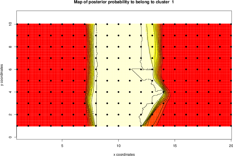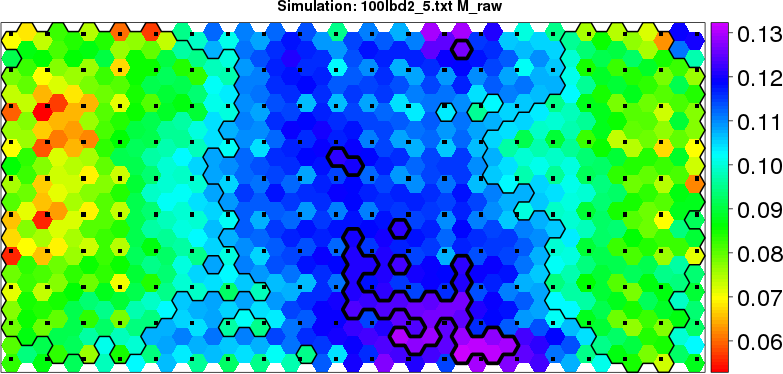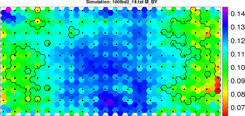 Simulated data | Geographical plots of weighted mean of all ellipse values (i.e., individual genetic distances ar of Rousset 2000) and significant barrier (cells with differentiation values higher than expected under a random distribution (no FDR applied) are materialized with thick black borders) | Idem, Benjamini-Yekutieli FDR applied | MAPI analysis (no FDR applied) with subsampled (75/200) dataset | MAPI analysis (Benjamini-Yekutieli FDR applied) with subsampled (75/200) dataset | Best probability memberships | Probability memberships for cluster 1 | Probability memberships for cluster 2 | Probability memberships for cluster 3 | Probability memberships for cluster 4 | Probability memberships for cluster 5 | Best probability memberships | Probability memberships for cluster 1 | Probability memberships for cluster 2 | Probability memberships for cluster 3 | Probability memberships for cluster 4 | Probability memberships for cluster 5 | Scatter plot showing the first two components of the DAPC (when K*>2) or density plot showing the first principal component of the DAPC (when K*=2) | Probability memberships for cluster 1 | Probability memberships for cluster 2 | Probability memberships for cluster 3 | Probability memberships for cluster 4 | Probability memberships for cluster 5 | Scatter plot showing the first two components of the DAPC (when K*>2) or density plot showing the first principal component of the DAPC (when K*=2) | Probability memberships for cluster 1 | Probability memberships for cluster 2 | Probability memberships for cluster 3 | Probability memberships for cluster 4 | Probability memberships for cluster 5 |