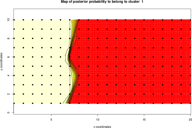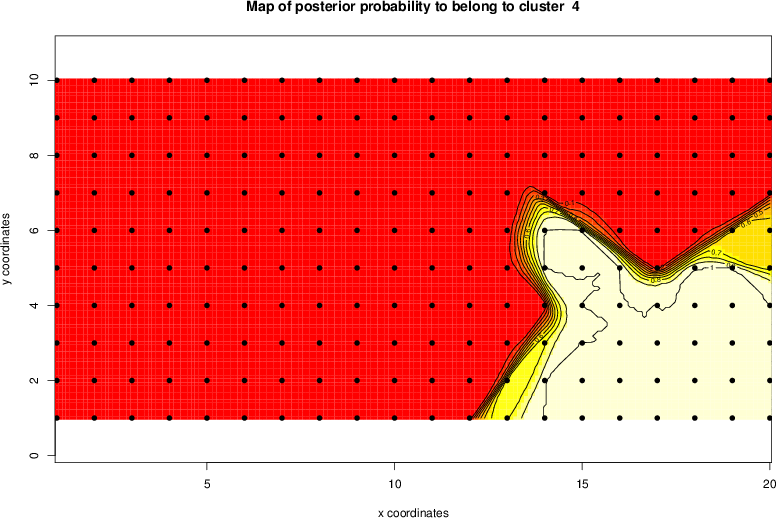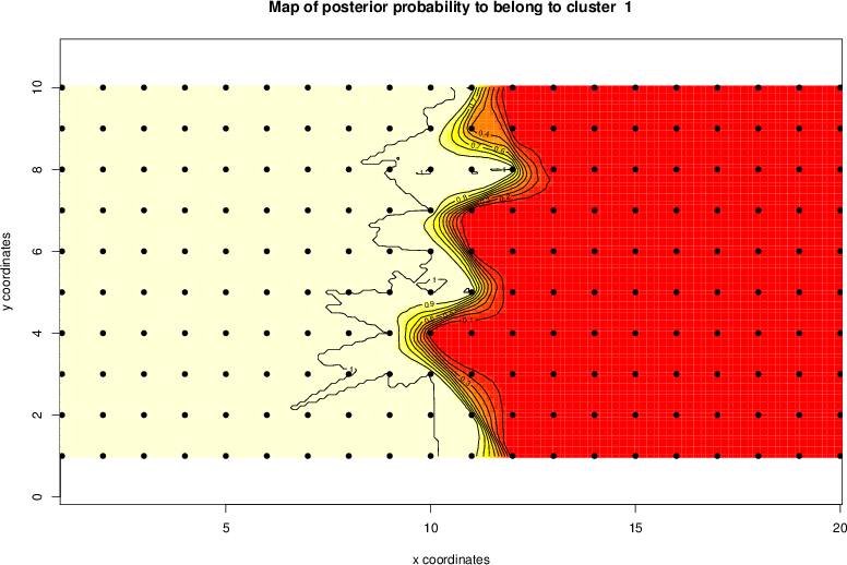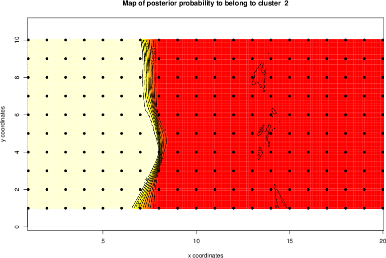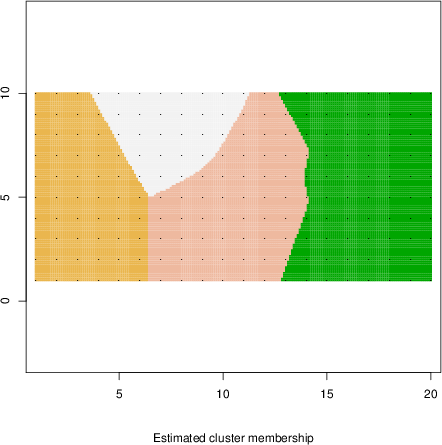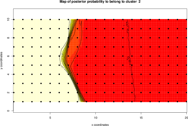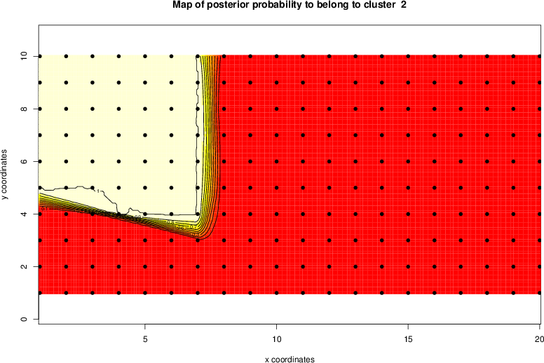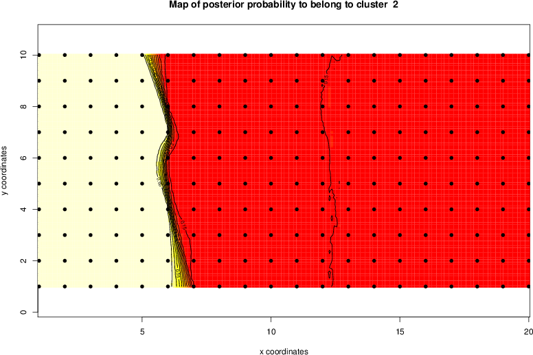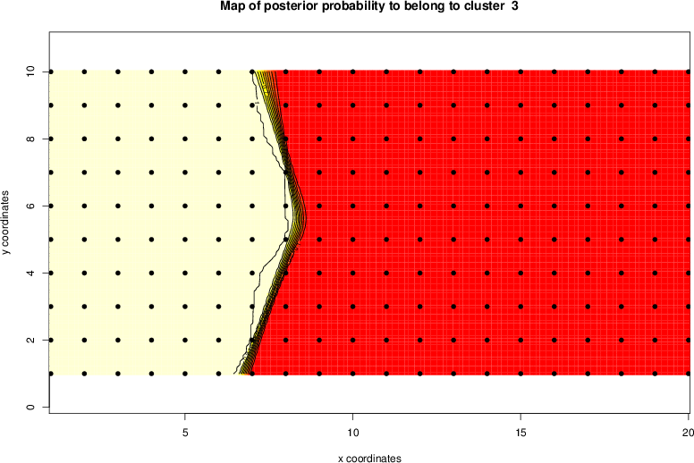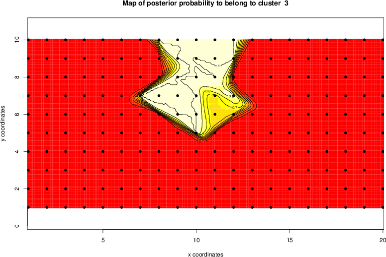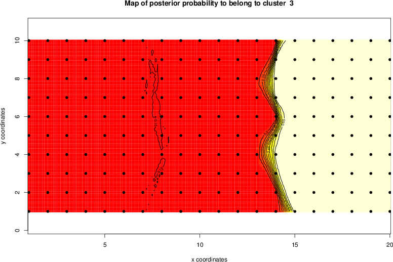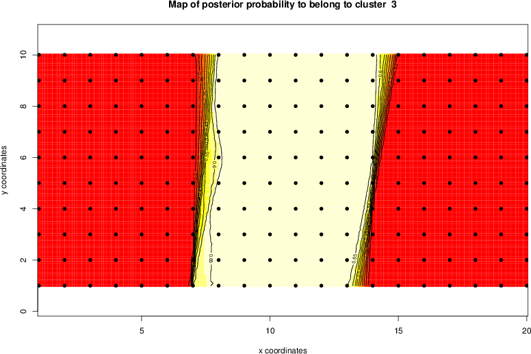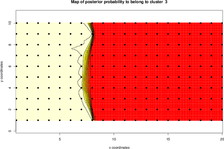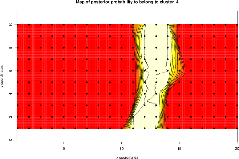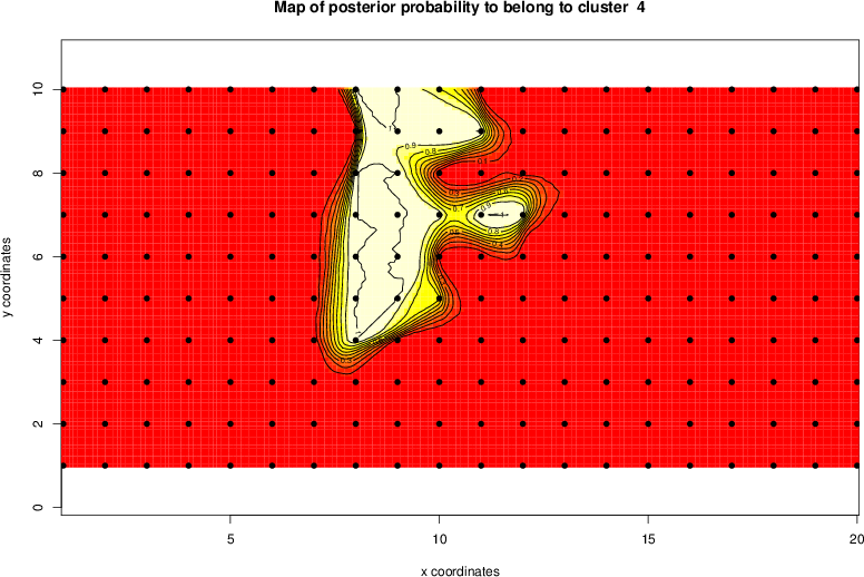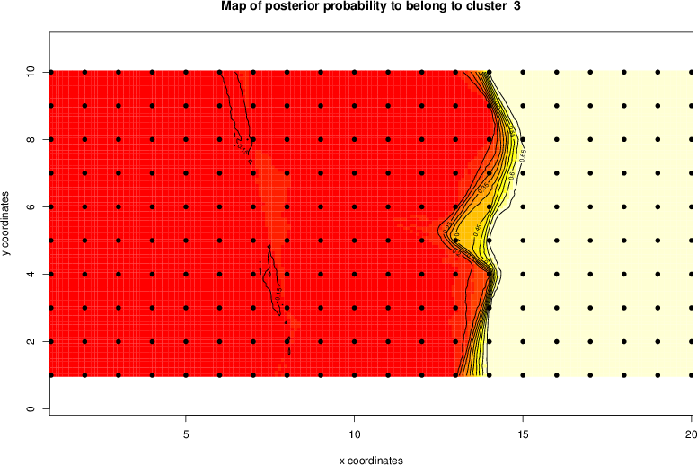 Simulated data | Geographical plots of weighted mean of all ellipse values (i.e., individual genetic distances ar of Rousset 2000) and significant barrier (cells with differentiation values higher than expected under a random distribution (no FDR applied) are materialized with thick black borders) | Idem, Benjamini-Yekutieli FDR applied | MAPI analysis (no FDR applied) with subsampled (75/200) dataset | MAPI analysis (Benjamini-Yekutieli FDR applied) with subsampled (75/200) dataset | Best probability memberships | Probability memberships for cluster 1 | Probability memberships for cluster 2 | Probability memberships for cluster 3 | Probability memberships for cluster 4 | Probability memberships for cluster 5 | Best probability memberships | Probability memberships for cluster 1 | Probability memberships for cluster 2 | Probability memberships for cluster 3 | Probability memberships for cluster 4 | Probability memberships for cluster 5 | Scatter plot showing the first two components of the DAPC (when K*>2) or density plot showing the first principal component of the DAPC (when K*=2) | Probability memberships for cluster 1 | Probability memberships for cluster 2 | Probability memberships for cluster 3 | Probability memberships for cluster 4 | Probability memberships for cluster 5 | Scatter plot showing the first two components of the DAPC (when K*>2) or density plot showing the first principal component of the DAPC (when K*=2) | Probability memberships for cluster 1 | Probability memberships for cluster 2 | Probability memberships for cluster 3 | Probability memberships for cluster 4 | Probability memberships for cluster 5 |
