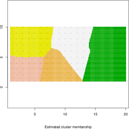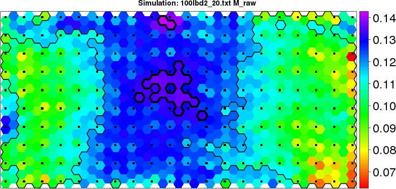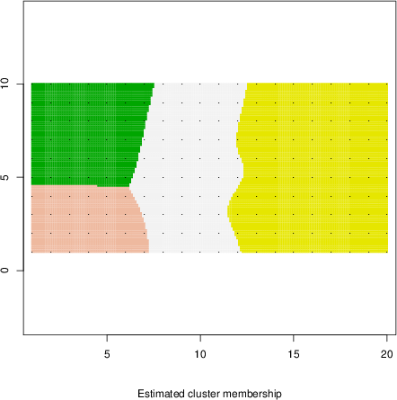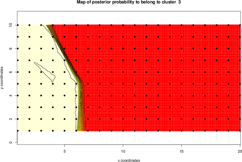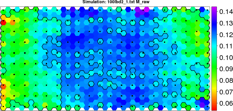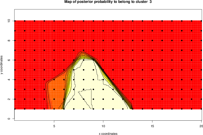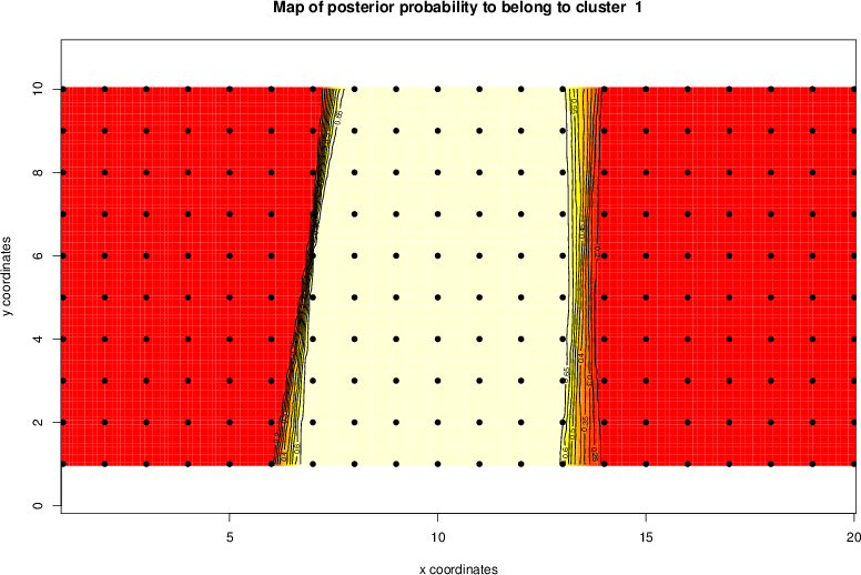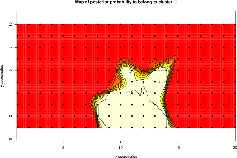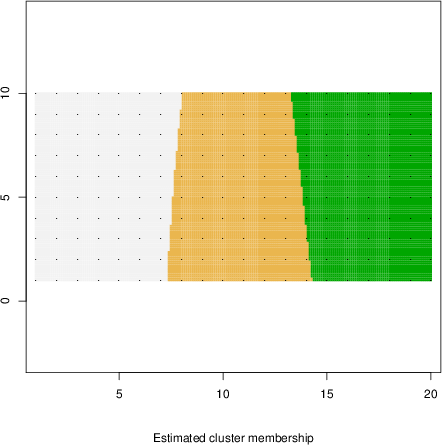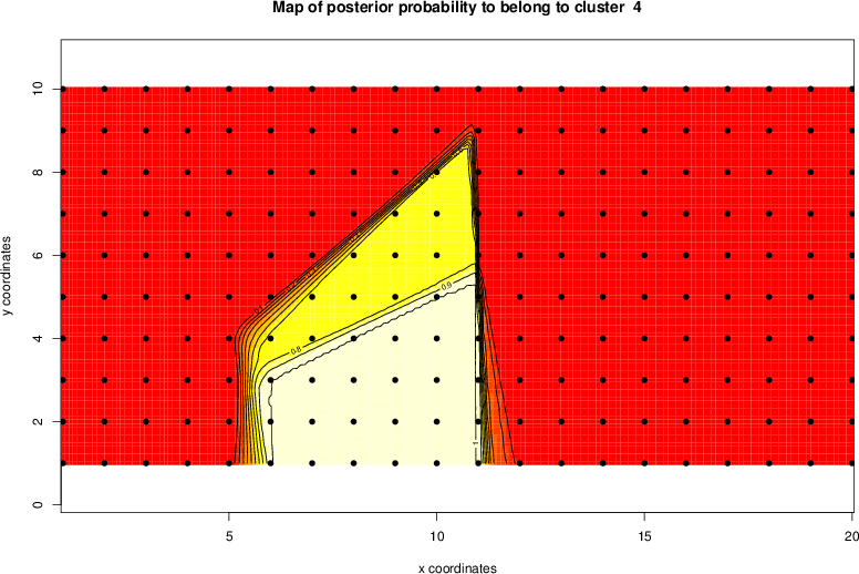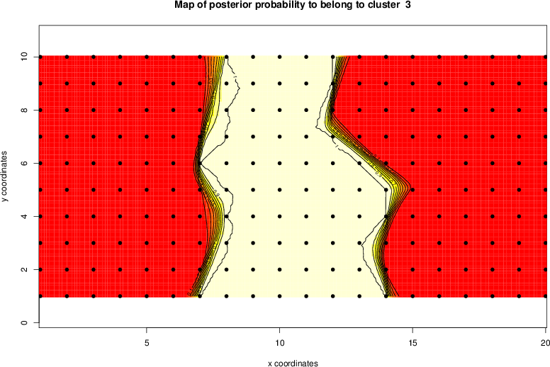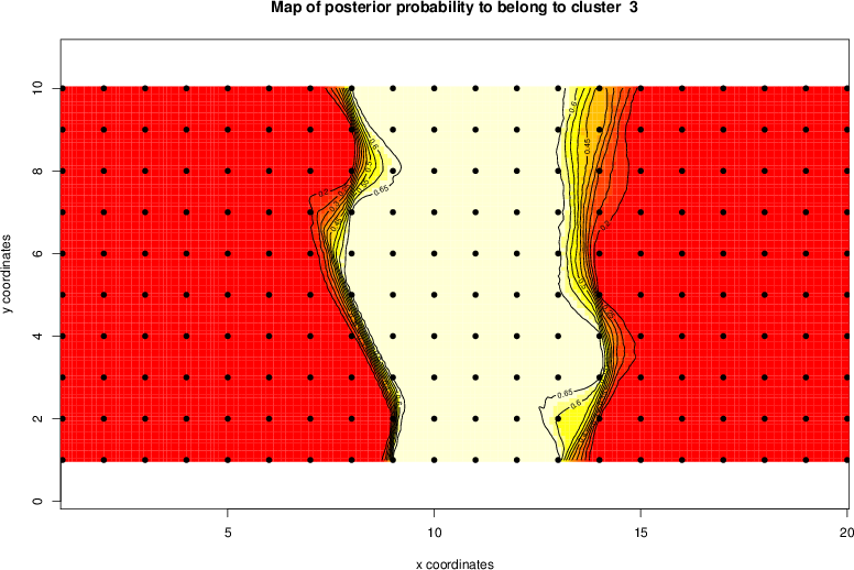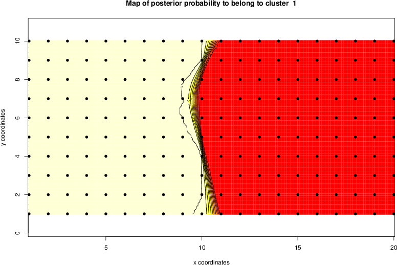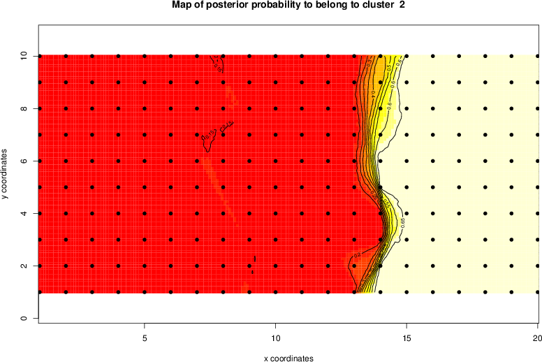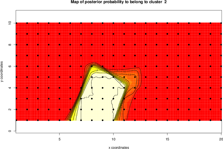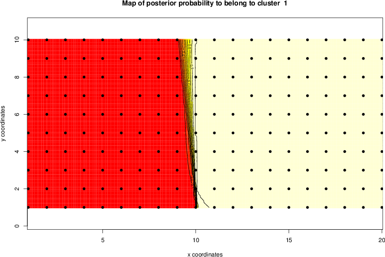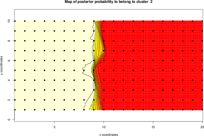 Simulated data | Geographical plots of weighted mean of all ellipse values (i.e., individual genetic distances ar of Rousset 2000) and significant barrier (cells with differentiation values higher than expected under a random distribution (no FDR applied) are materialized with thick black borders) | Idem, Benjamini-Yekutieli FDR applied | MAPI analysis (no FDR applied) with subsampled (75/200) dataset | MAPI analysis (Benjamini-Yekutieli FDR applied) with subsampled (75/200) dataset | Best probability memberships | Probability memberships for cluster 1 | Probability memberships for cluster 2 | Probability memberships for cluster 3 | Probability memberships for cluster 4 | Probability memberships for cluster 5 | Best probability memberships | Probability memberships for cluster 1 | Probability memberships for cluster 2 | Probability memberships for cluster 3 | Probability memberships for cluster 4 | Probability memberships for cluster 5 | Scatter plot showing the first two components of the DAPC (when K*>2) or density plot showing the first principal component of the DAPC (when K*=2) | Probability memberships for cluster 1 | Probability memberships for cluster 2 | Probability memberships for cluster 3 | Probability memberships for cluster 4 | Probability memberships for cluster 5 | Scatter plot showing the first two components of the DAPC (when K*>2) or density plot showing the first principal component of the DAPC (when K*=2) | Probability memberships for cluster 1 | Probability memberships for cluster 2 | Probability memberships for cluster 3 | Probability memberships for cluster 4 | Probability memberships for cluster 5 |